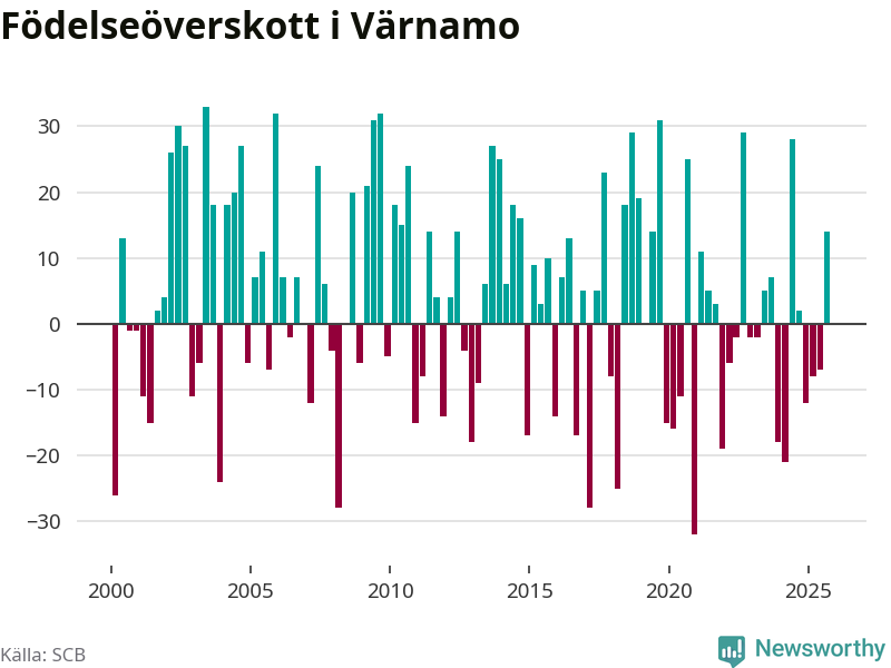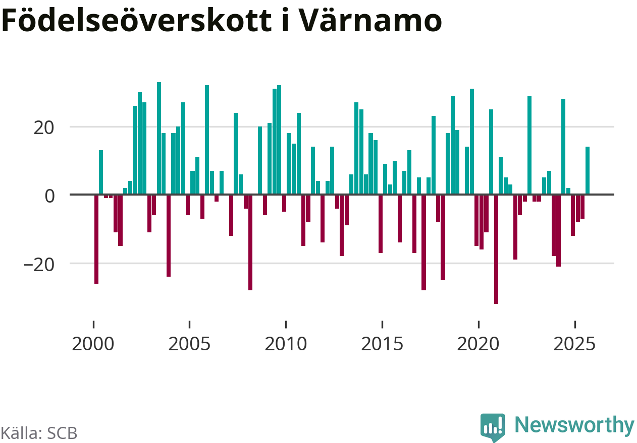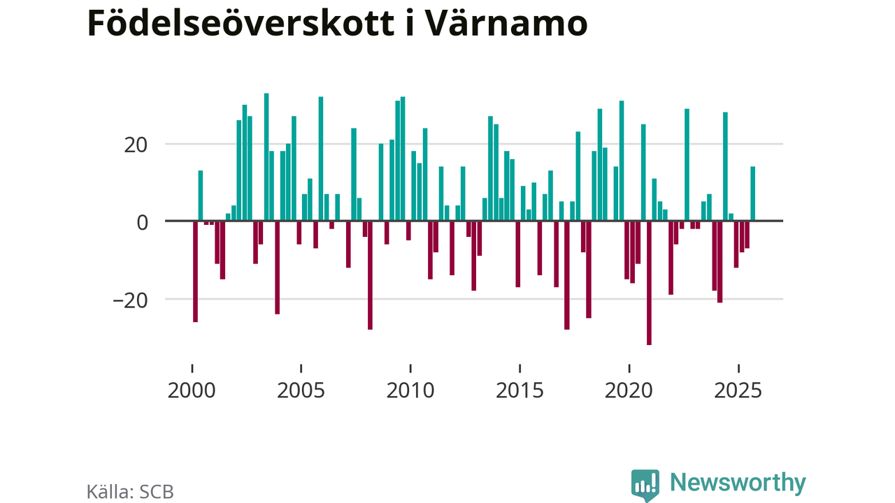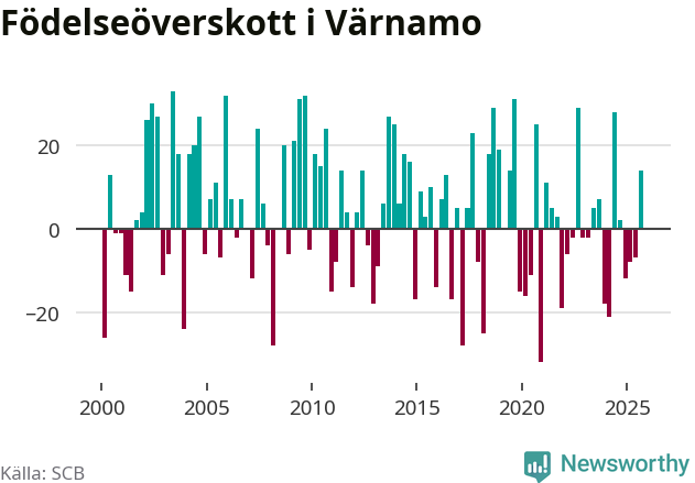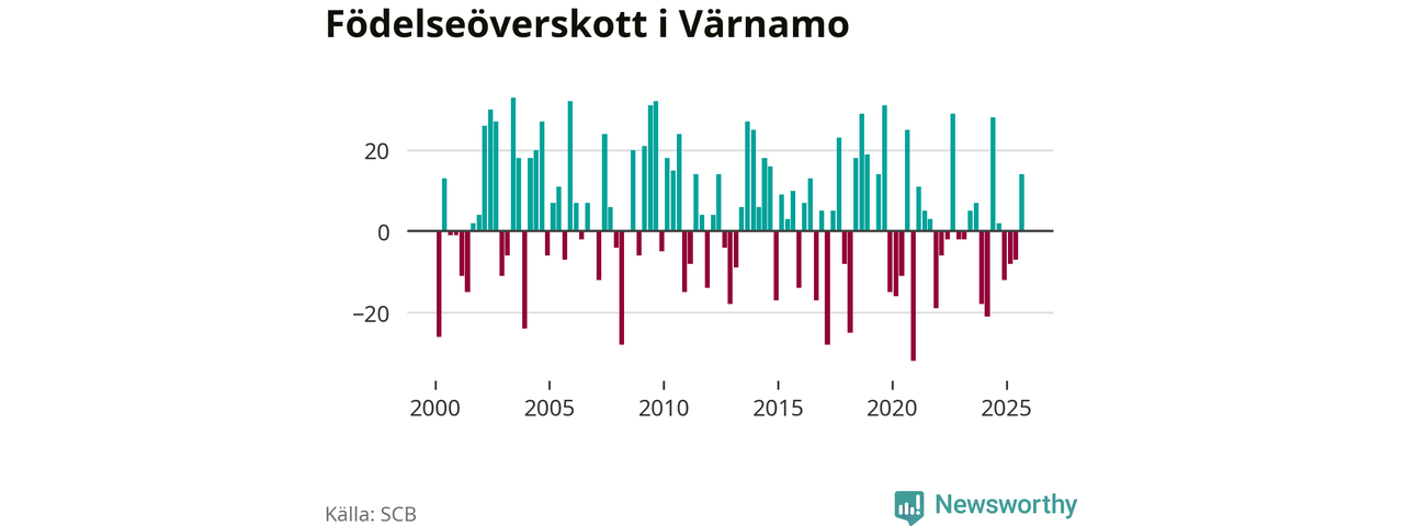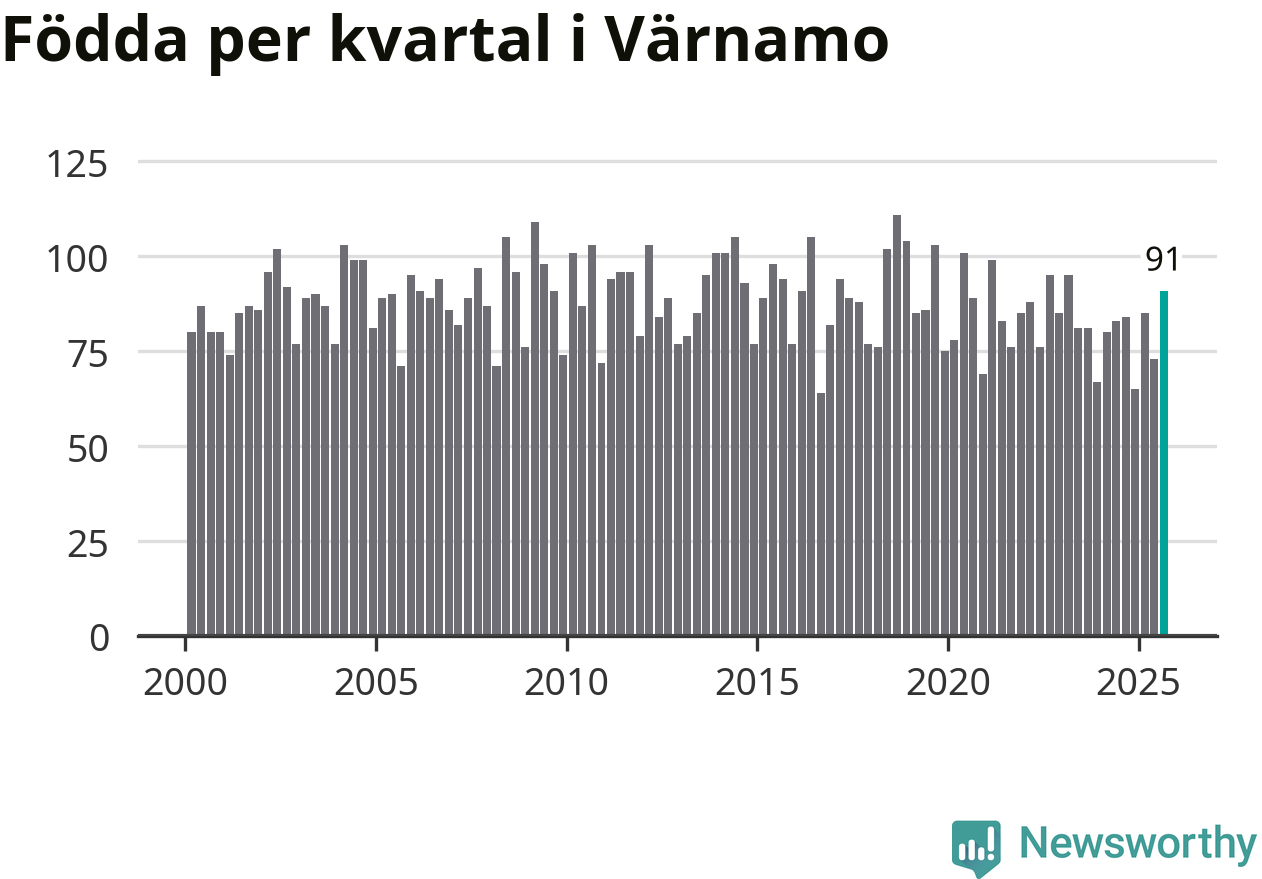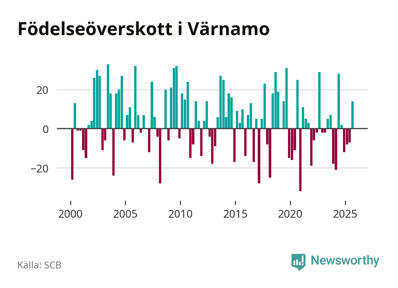 Enligt SCB:s siffror föddes 91 barn i Värnamo under det senaste kvartalet. Samtidigt avled 77 personer. Värnamo hade alltså ett positivt födelsenetto. Historiskt sett har kommunen haft ungefär lika många kvartal med positivt flyttnetto som negativt.
