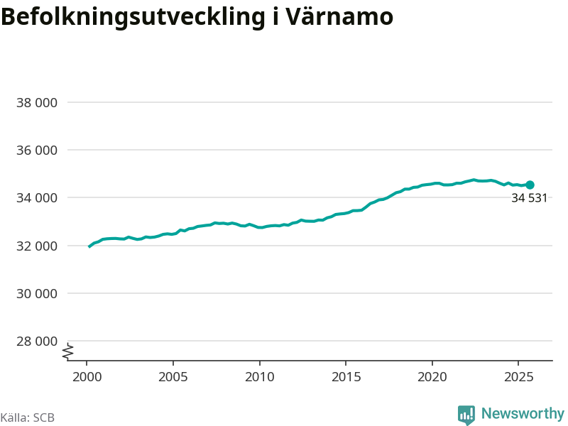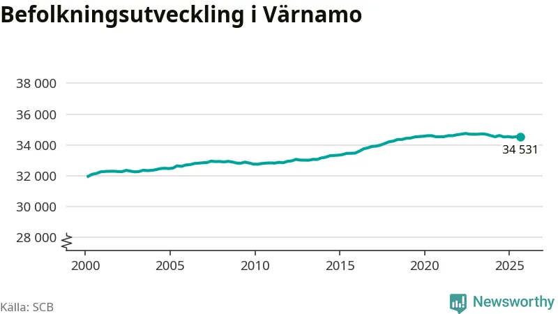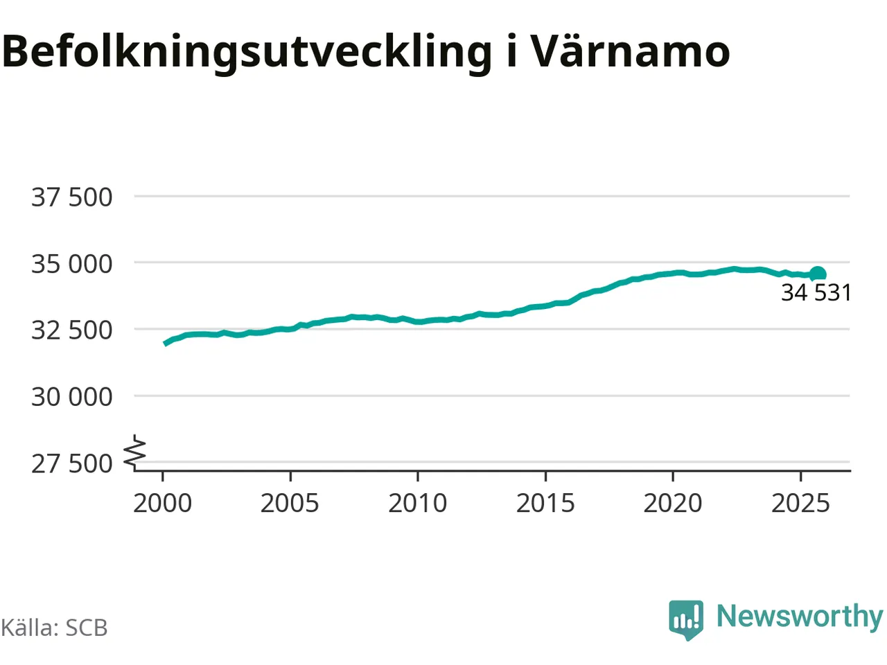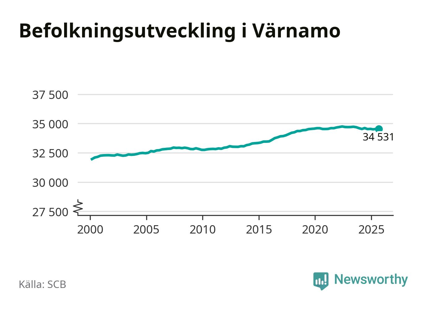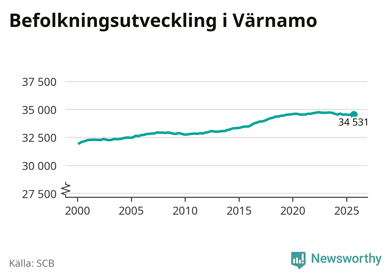 Den 30 september bodde 34 531 personer i Värnamo kommun, enligt SCB:s senaste siffror. Det är något färre än i slutet av andra kvartalet, men skillnaden är så liten att den lika gärna kan bero på den lilla justering som SCB gör av siffrorna för att skydda enskilda individers identitet.