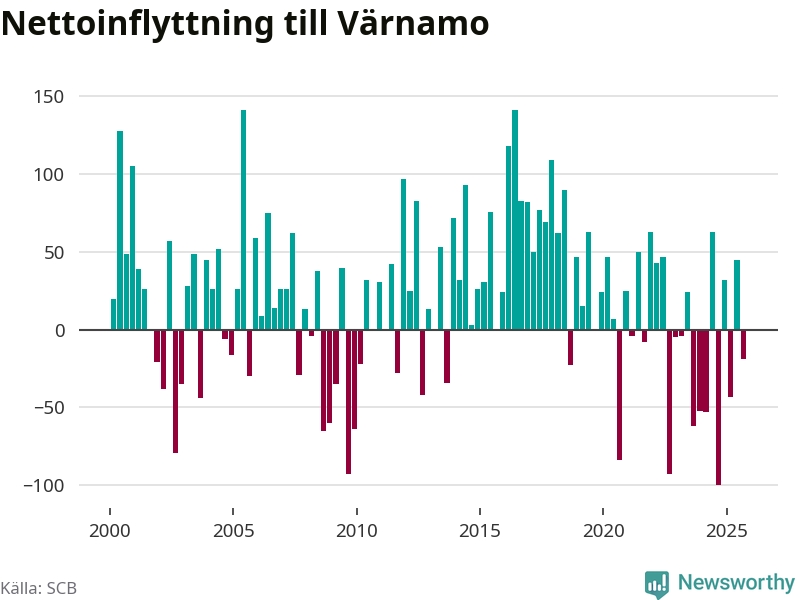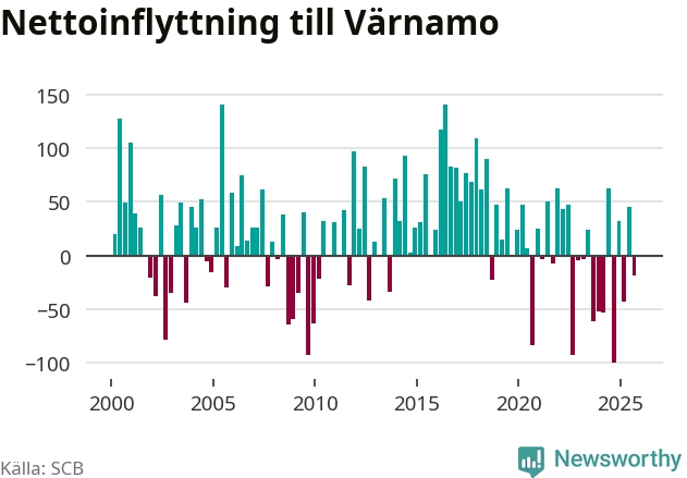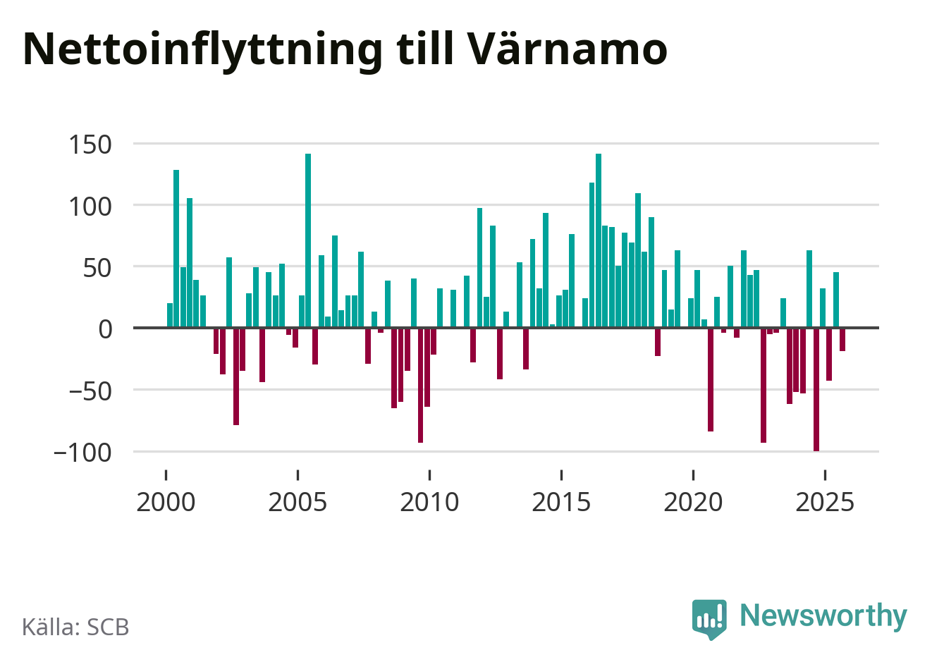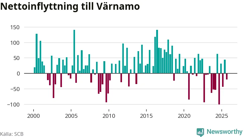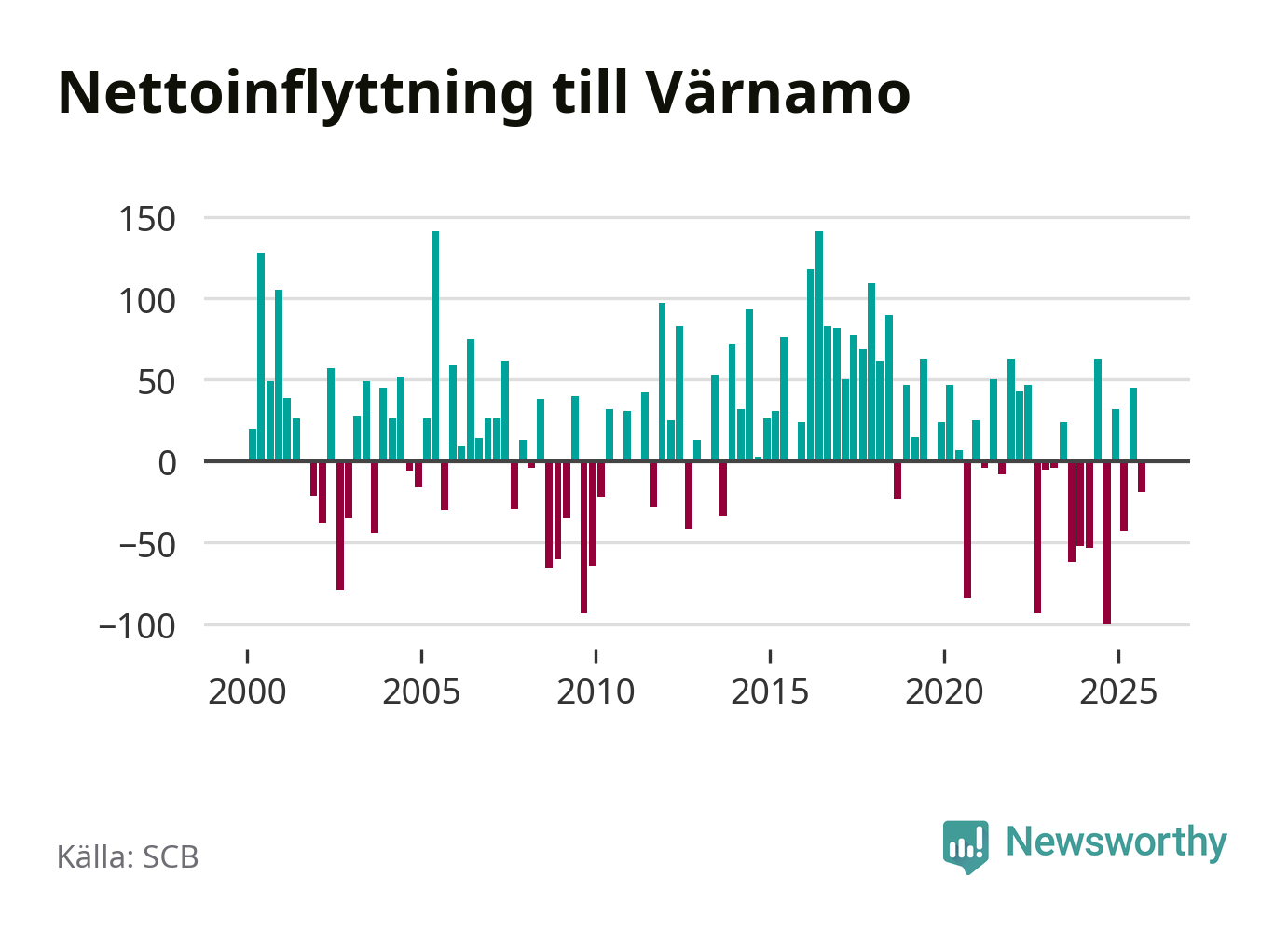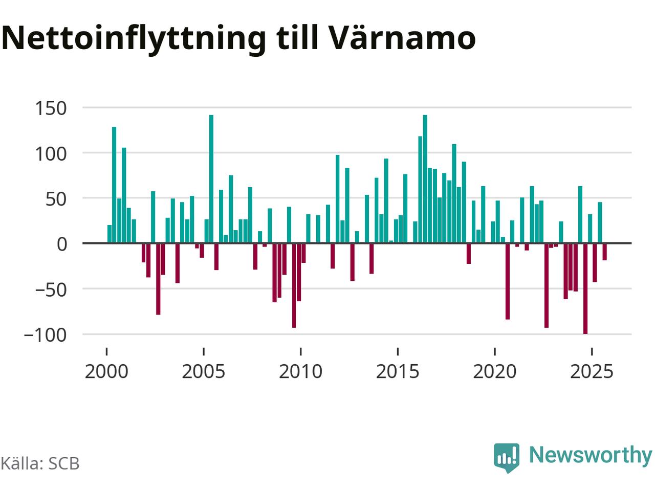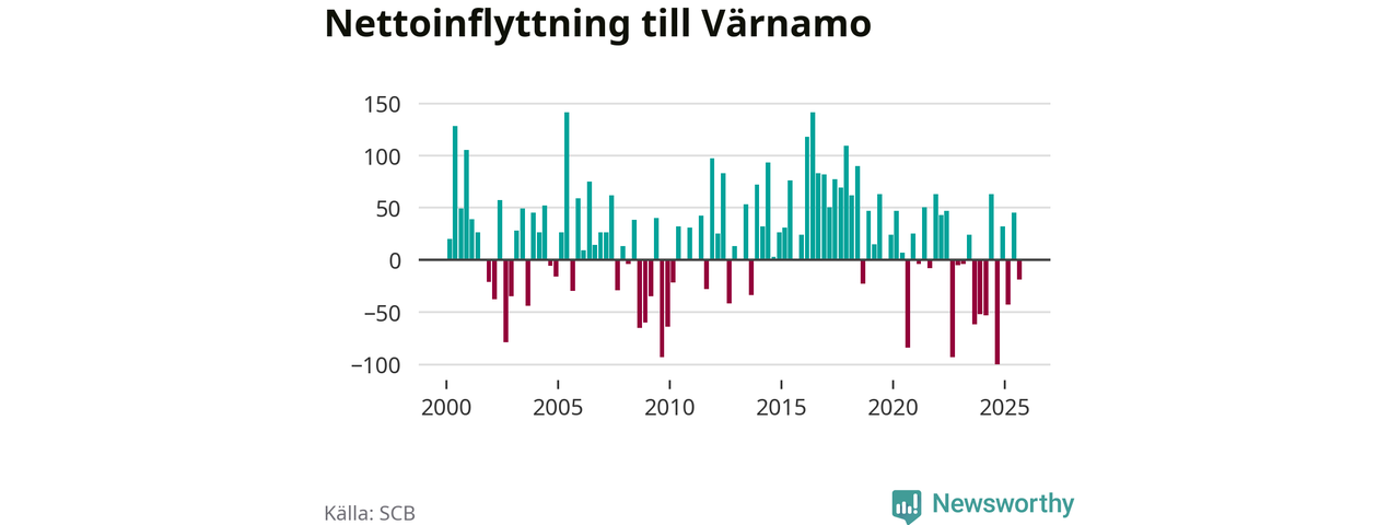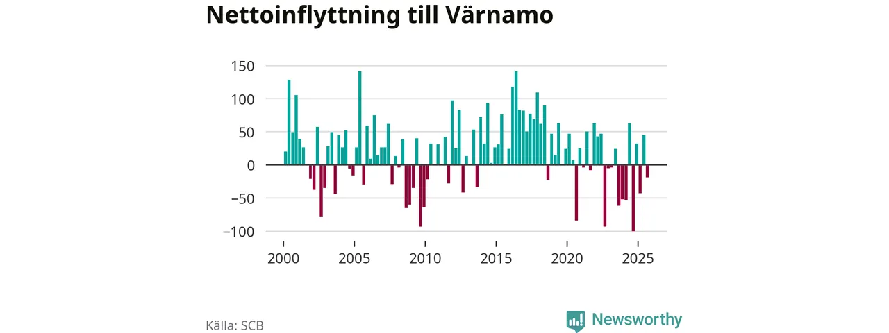 Under tredje kvartalet 2025 flyttade 495 personer till kommunen medan 514 personer flyttade därifrån. Det är historiskt sett en stor inflyttning under ett kvartal – men samtidigt var utflyttningen relativt stor. Sedan seklets början har Värnamo oftast haft ett positivt flyttnetto.