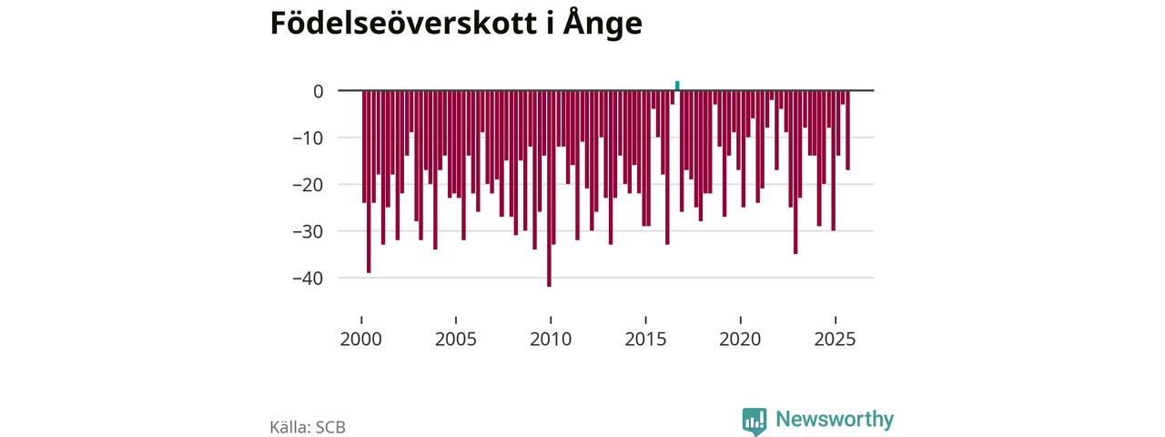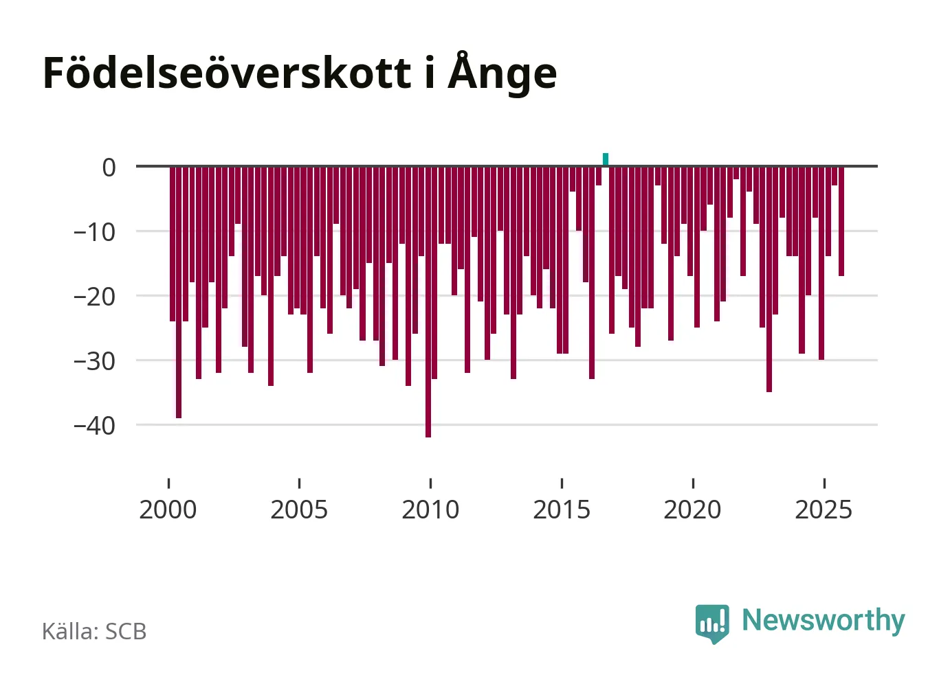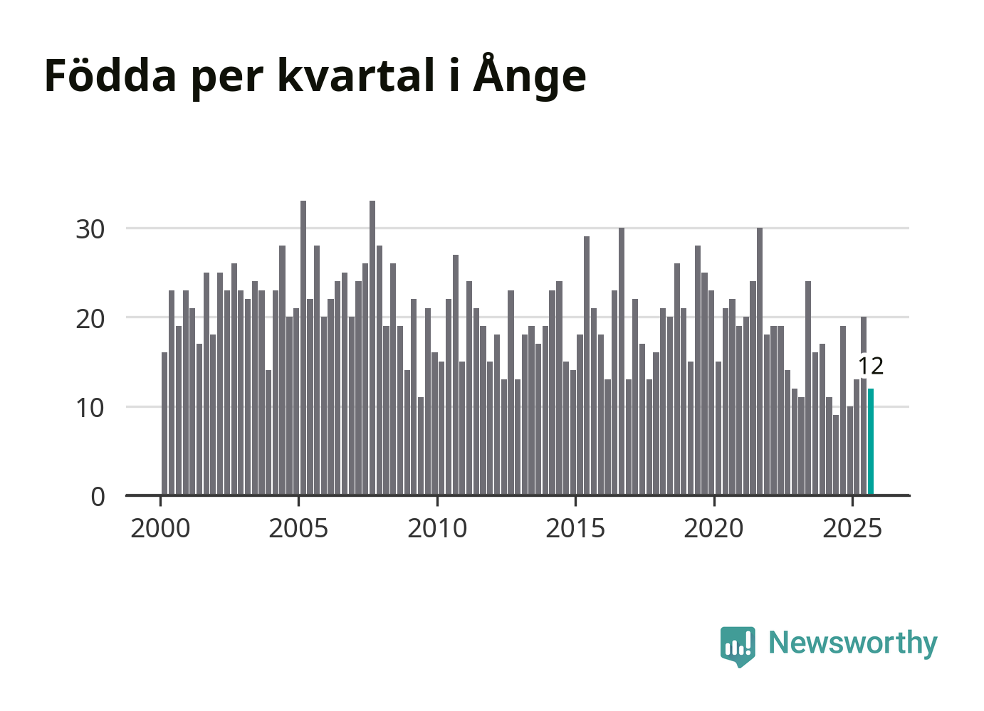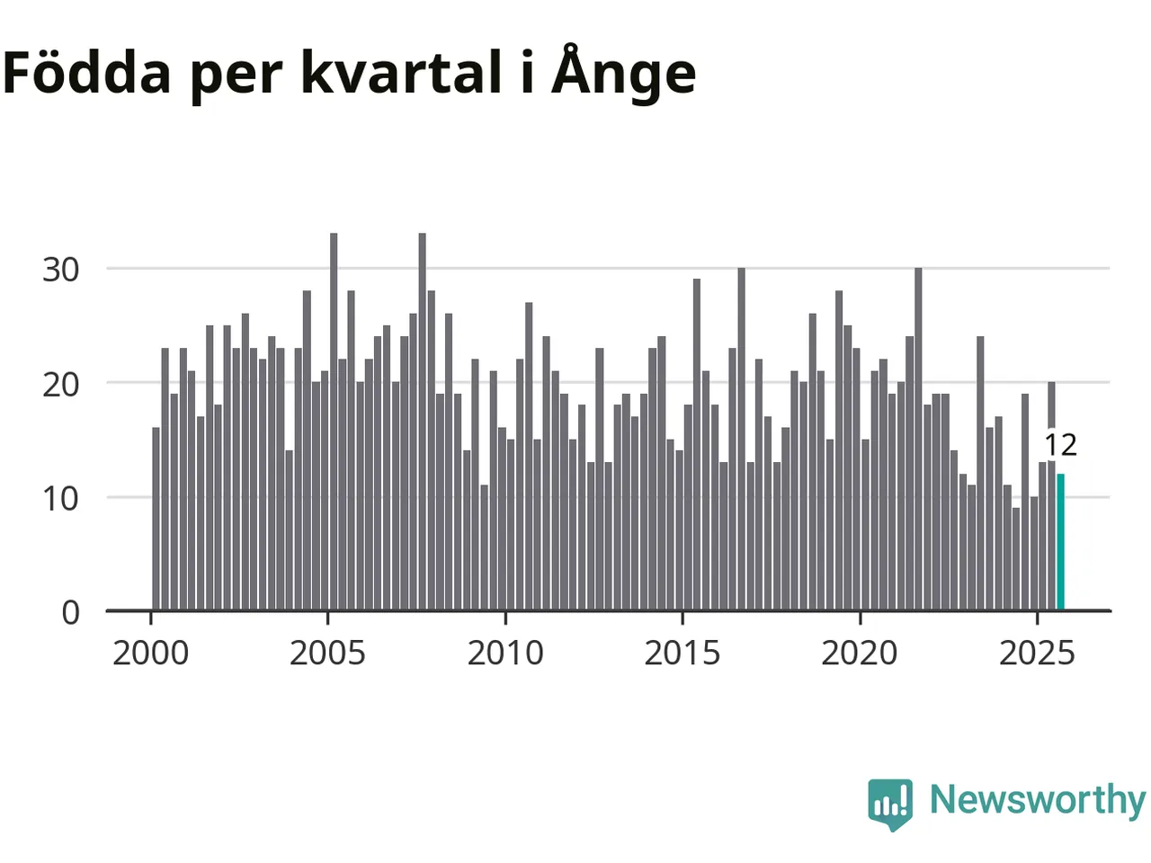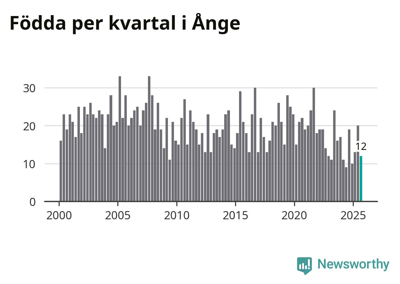 Enligt SCB:s siffror föddes tolv barn i Ånge under det senaste kvartalet. Samtidigt avled 29 personer. Ånge hade alltså ett negativt födelsenetto, vilket kommunen historiskt sett nästan alltid har haft.