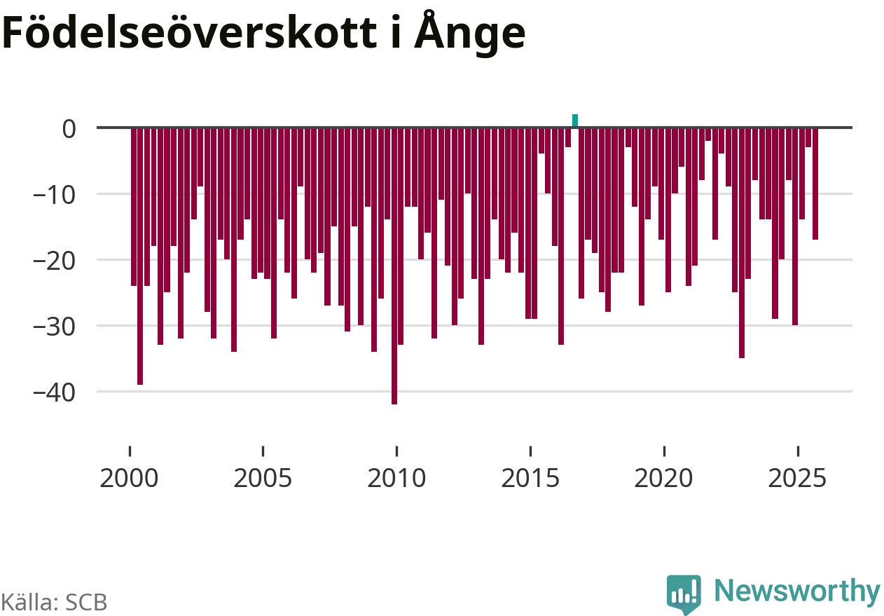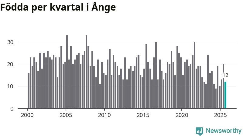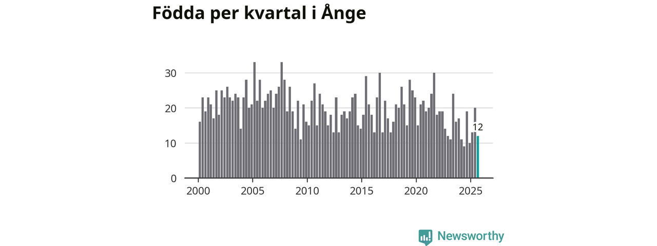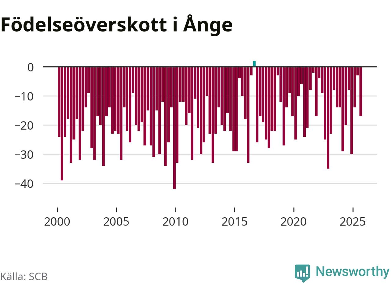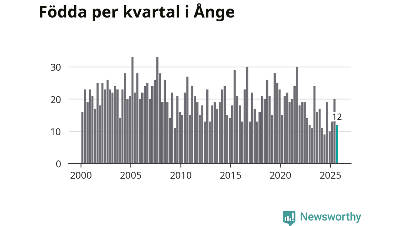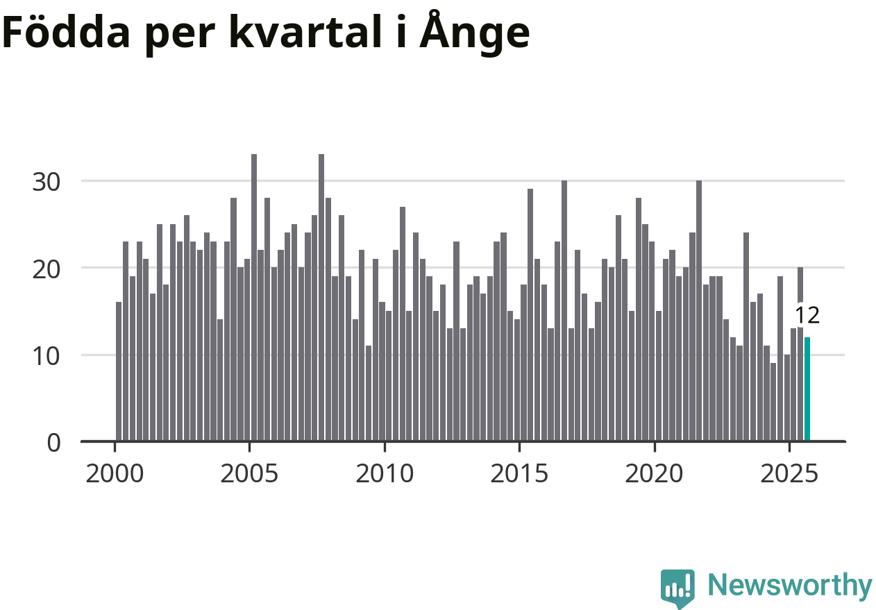 Enligt SCB:s siffror föddes tolv barn i Ånge under det senaste kvartalet. Samtidigt avled 29 personer. Ånge hade alltså ett negativt födelsenetto, vilket kommunen historiskt sett nästan alltid har haft.