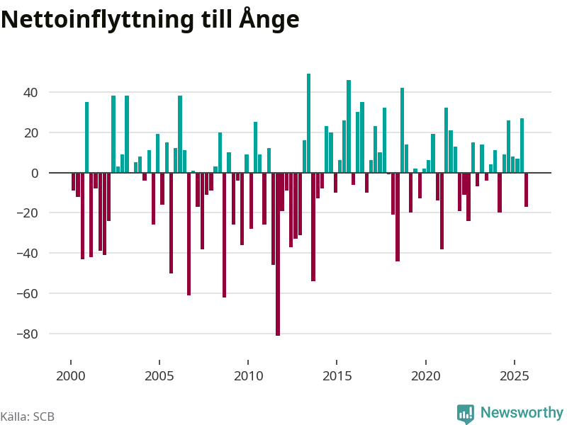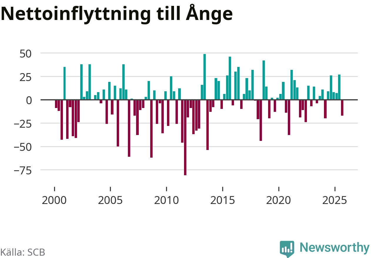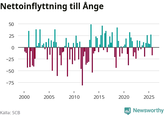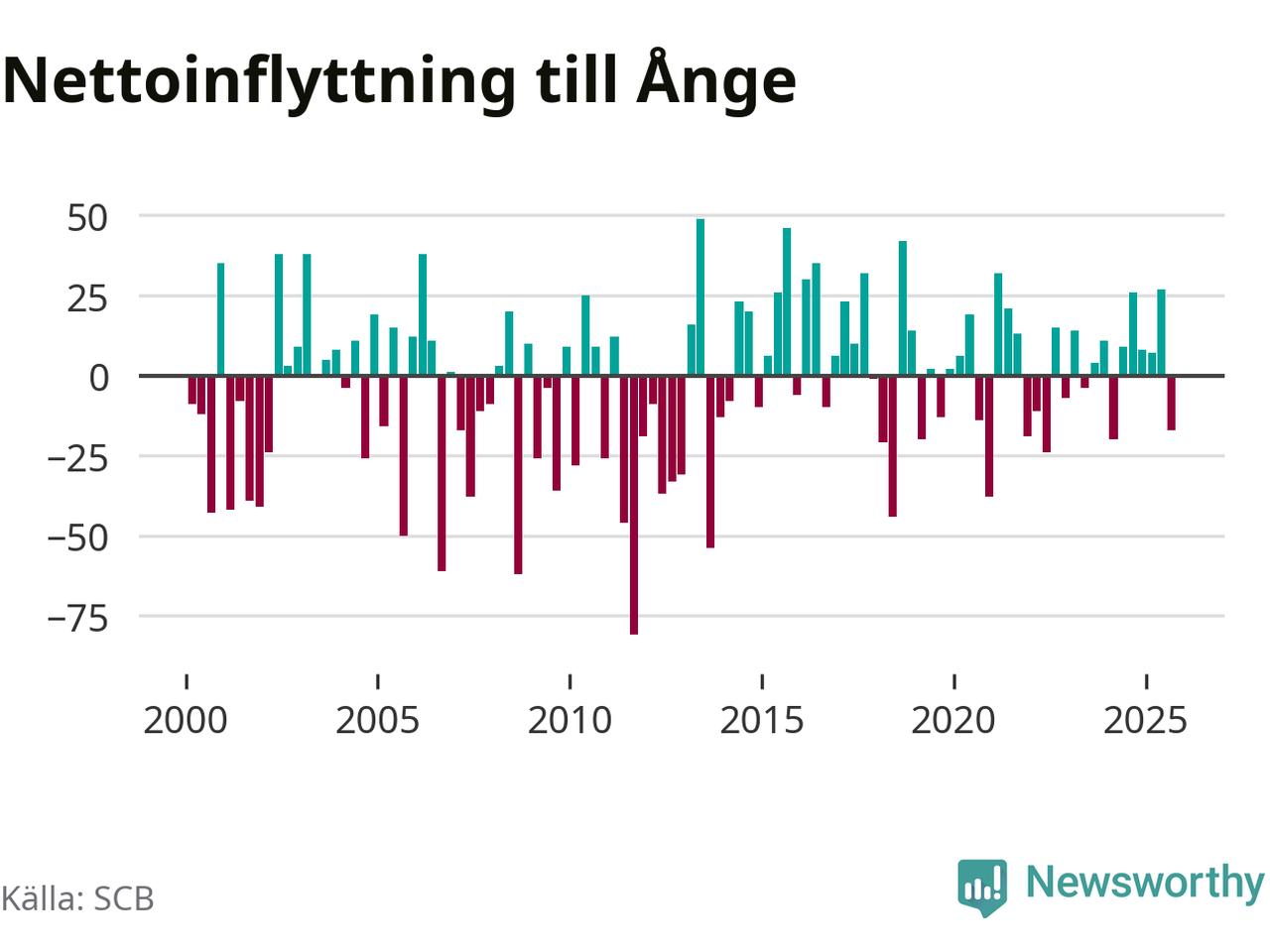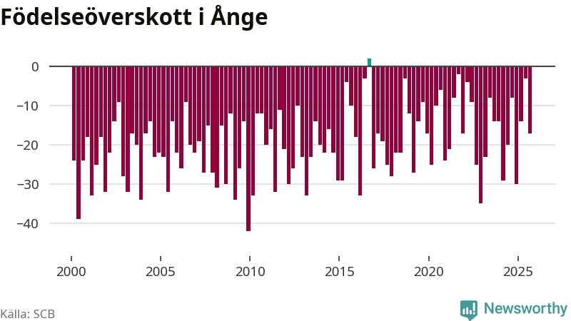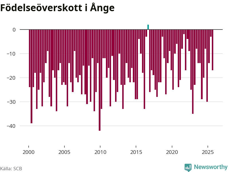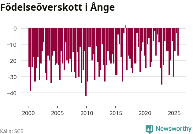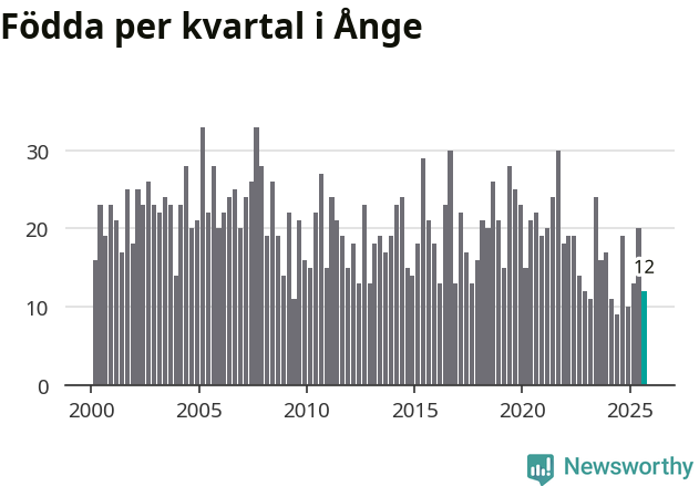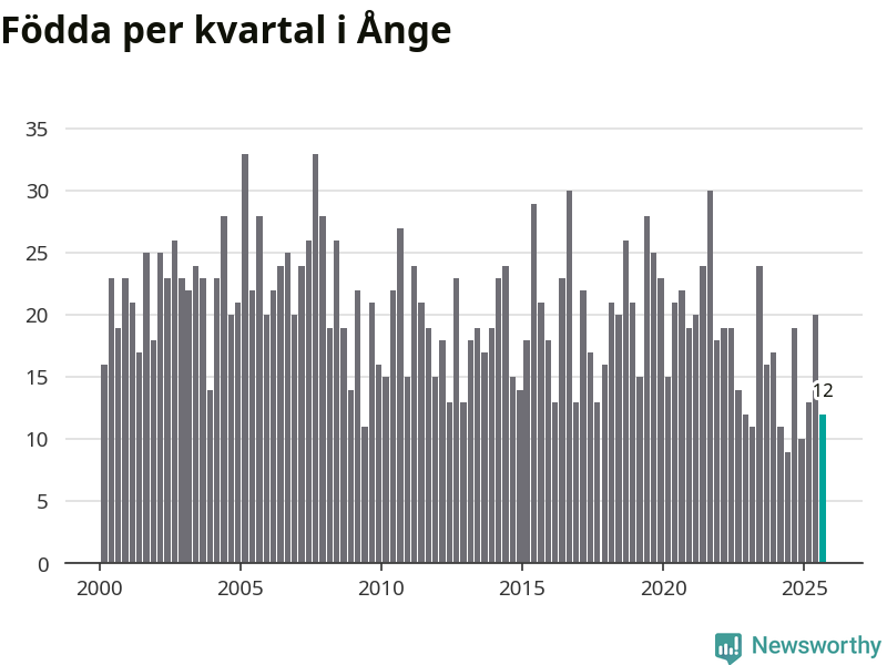 Enligt SCB:s siffror föddes tolv barn i Ånge under det senaste kvartalet. Samtidigt avled 29 personer. Ånge hade alltså ett negativt födelsenetto, vilket kommunen historiskt sett nästan alltid har haft.