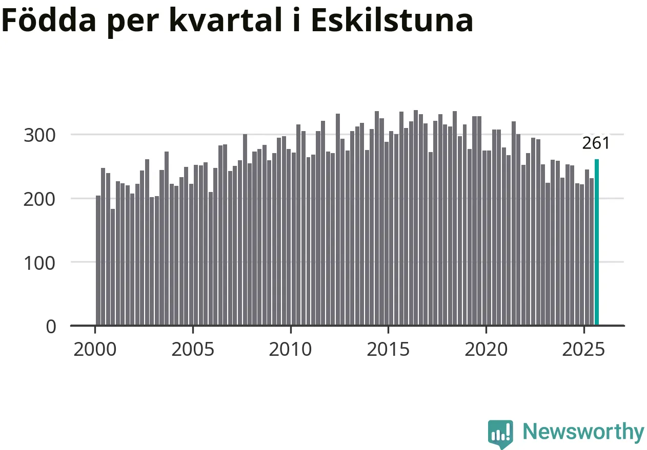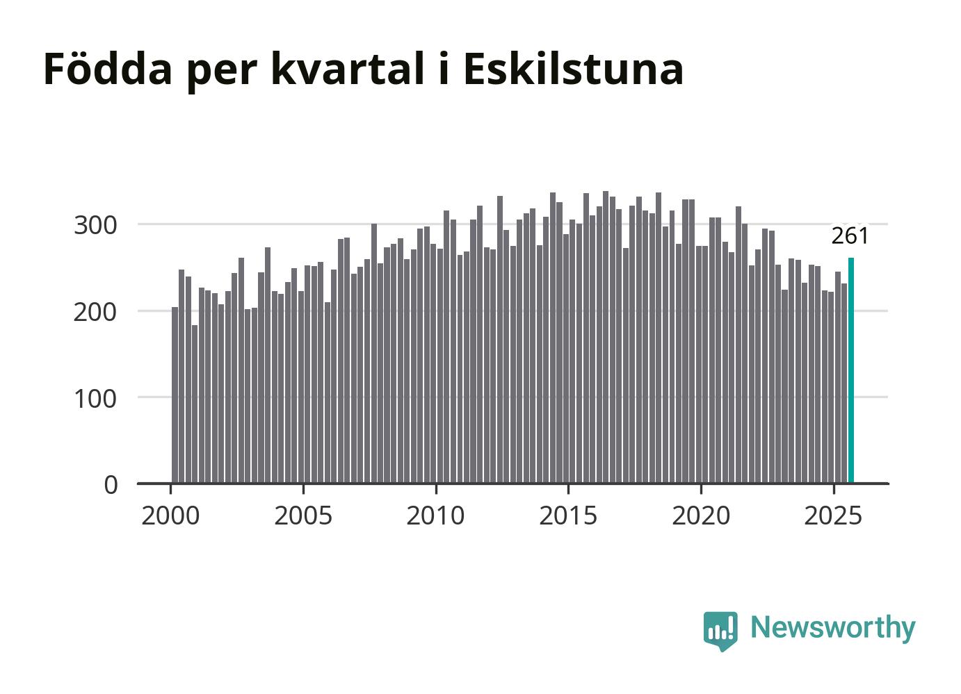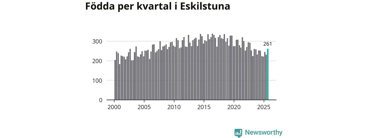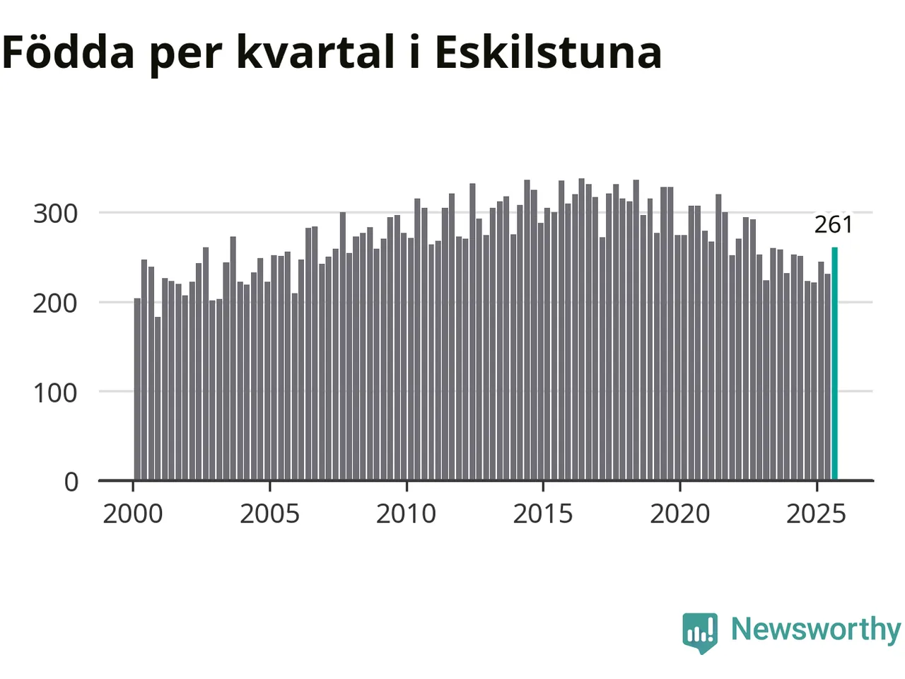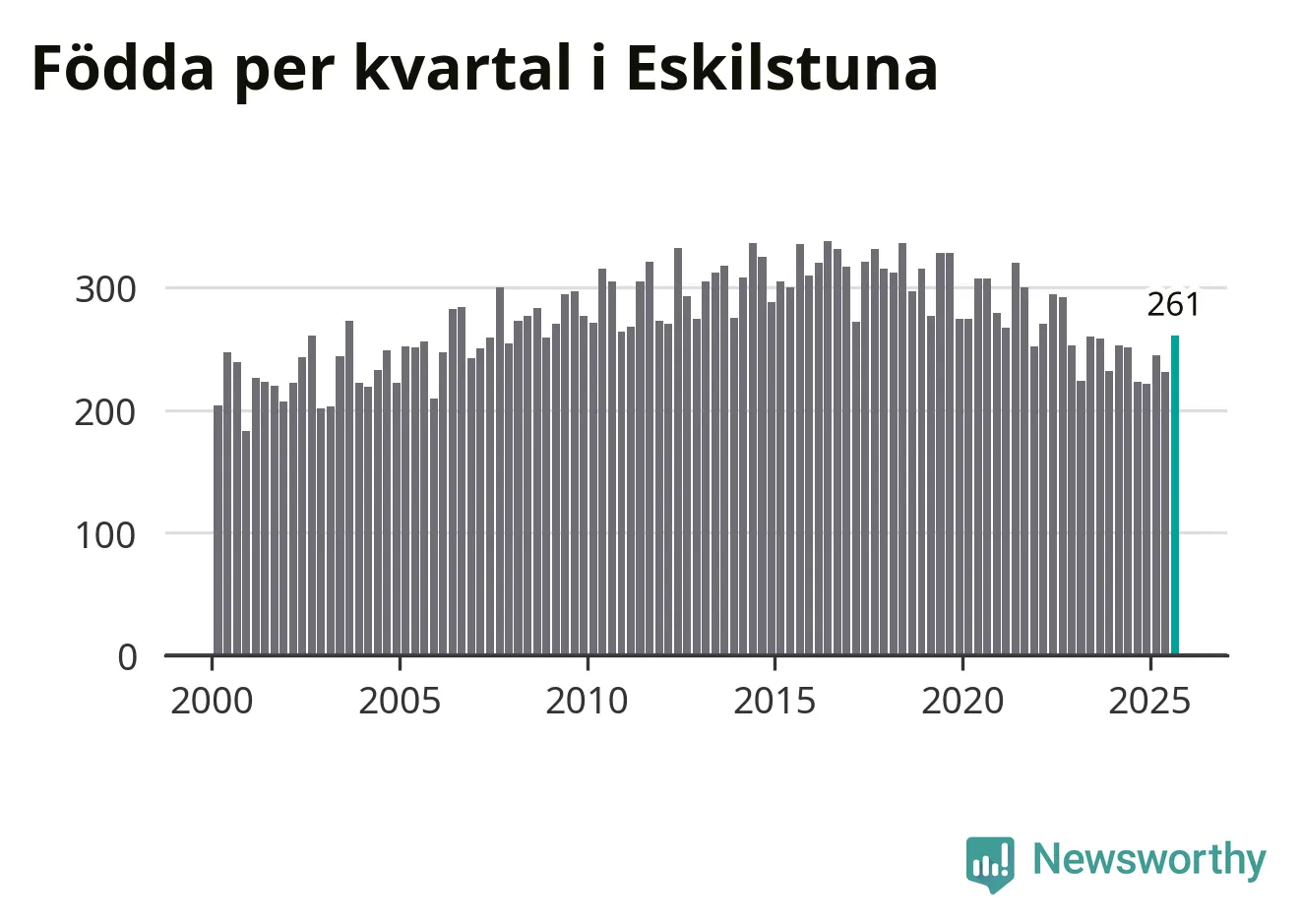 Enligt SCB:s siffror föddes 261 barn i Eskilstuna under det senaste kvartalet. Samtidigt avled 246 personer. Eskilstuna hade alltså ett positivt födelsenetto, vilket kommunen historiskt sett oftast har haft.