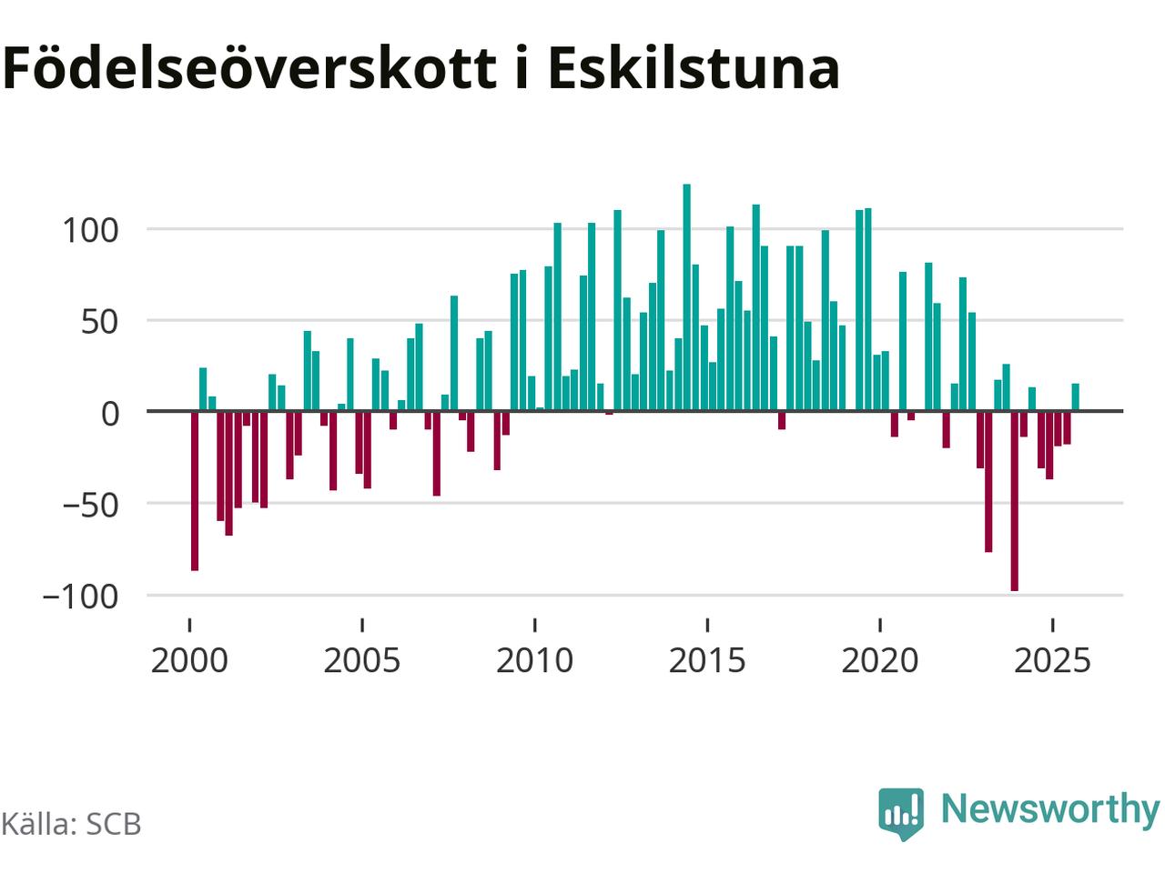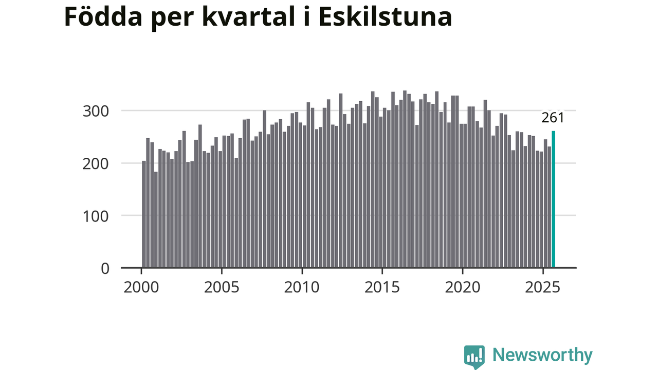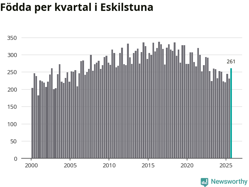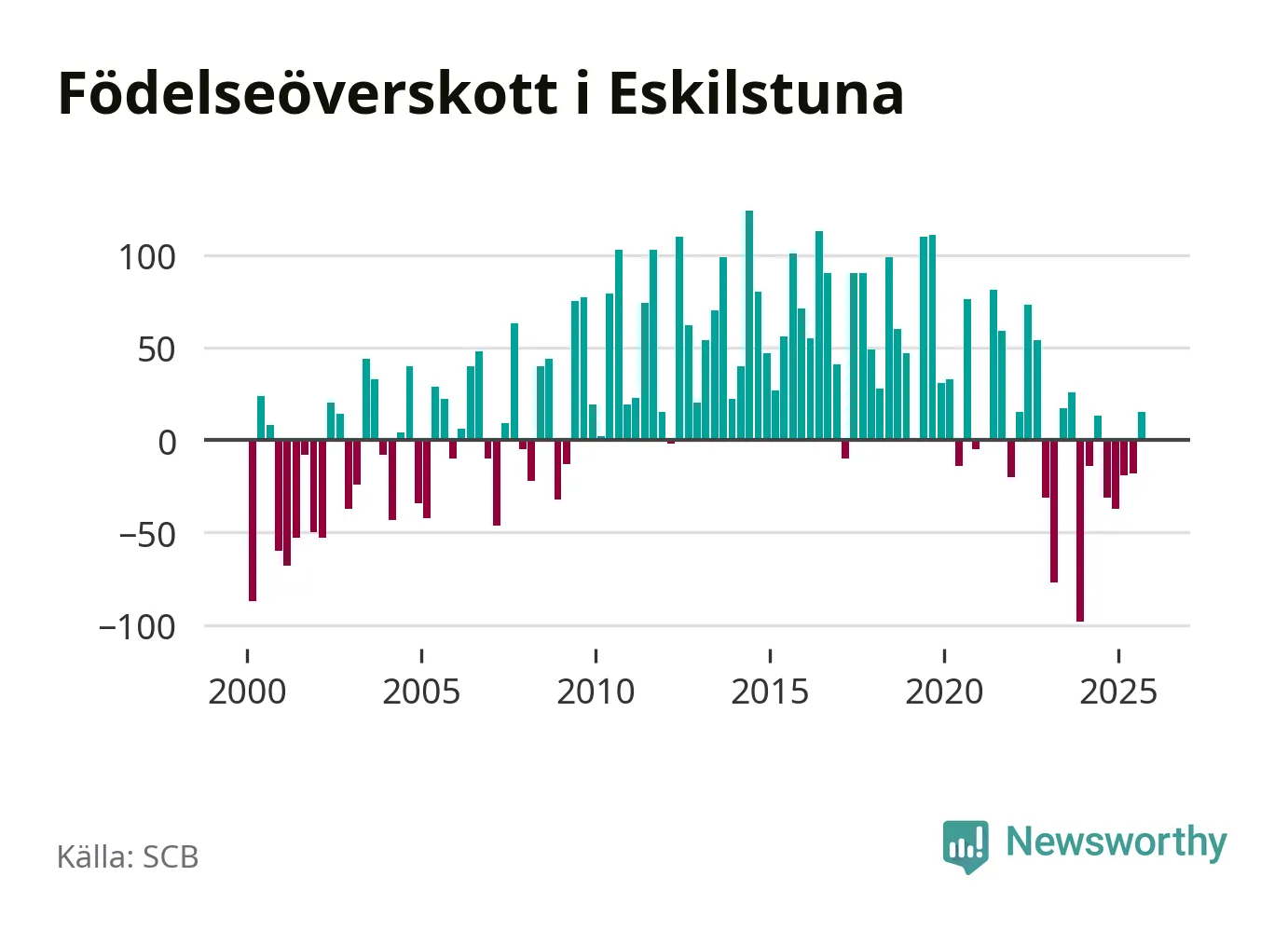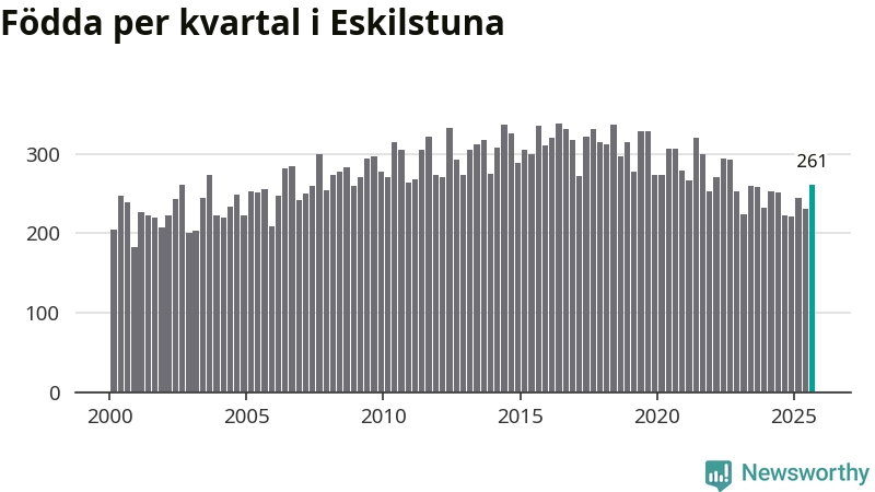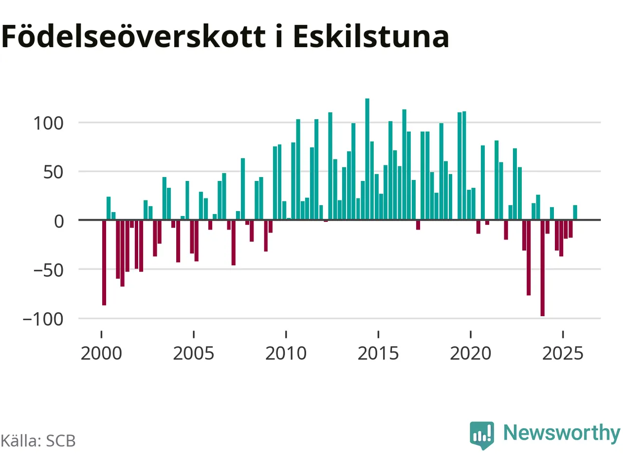 Enligt SCB:s siffror föddes 261 barn i Eskilstuna under det senaste kvartalet. Samtidigt avled 246 personer. Eskilstuna hade alltså ett positivt födelsenetto, vilket kommunen historiskt sett oftast har haft.