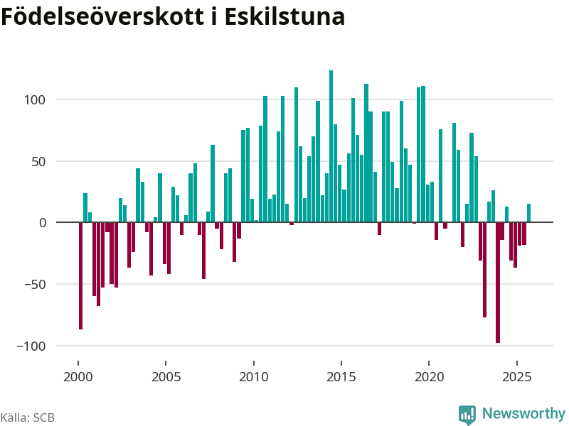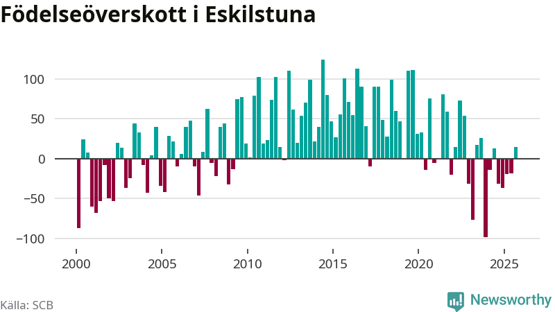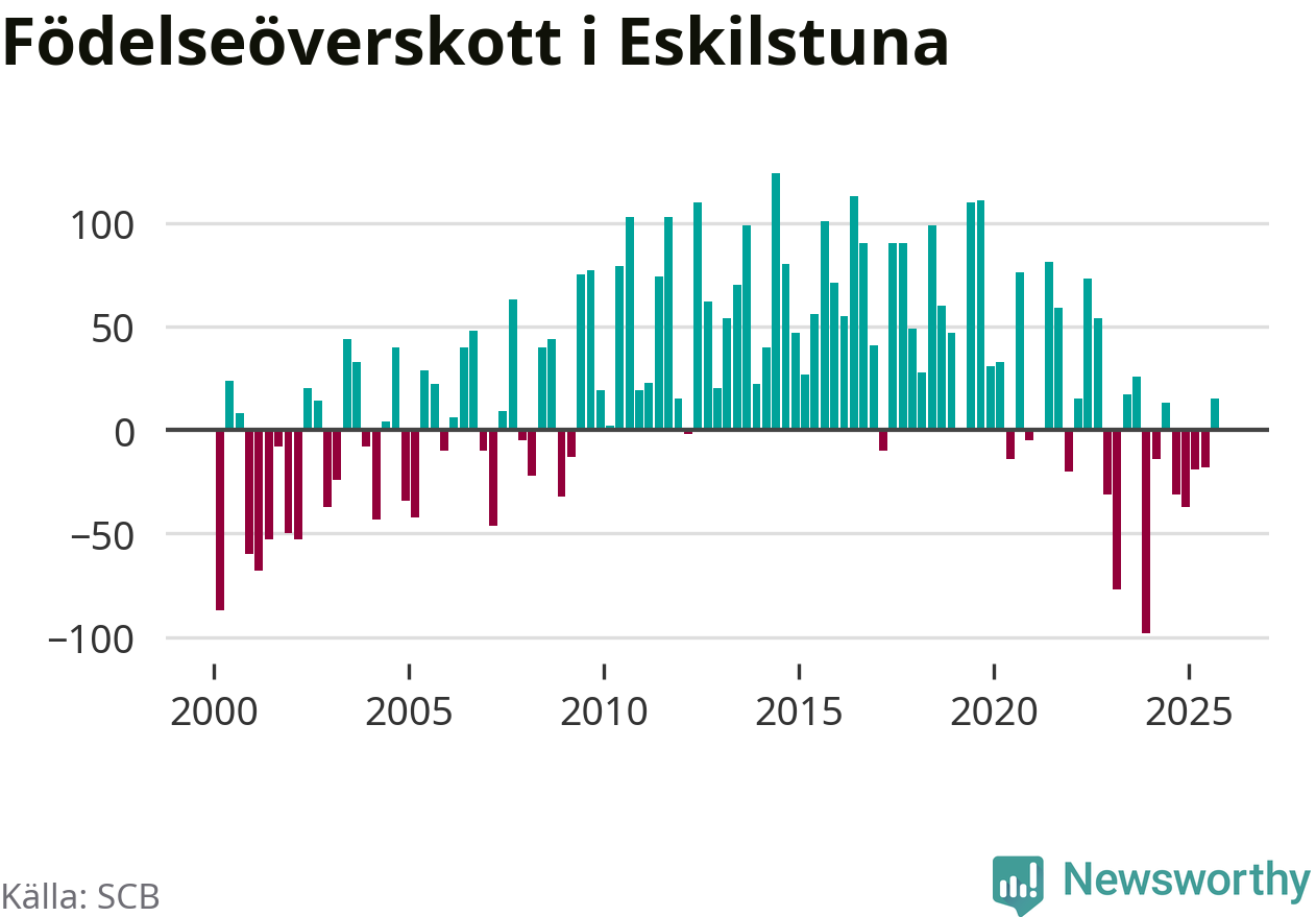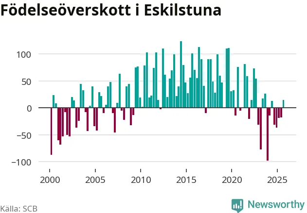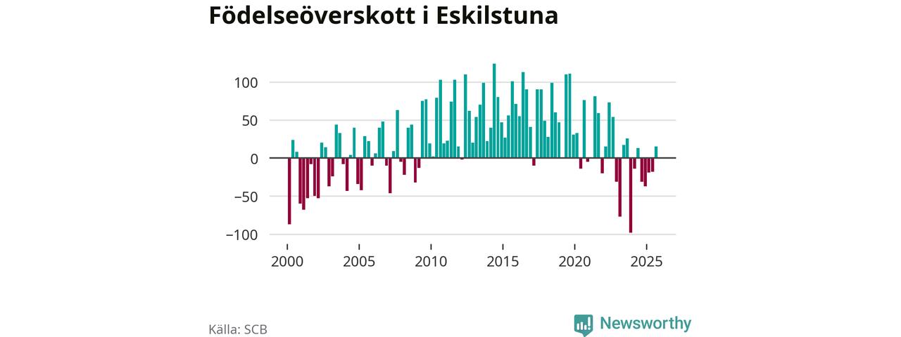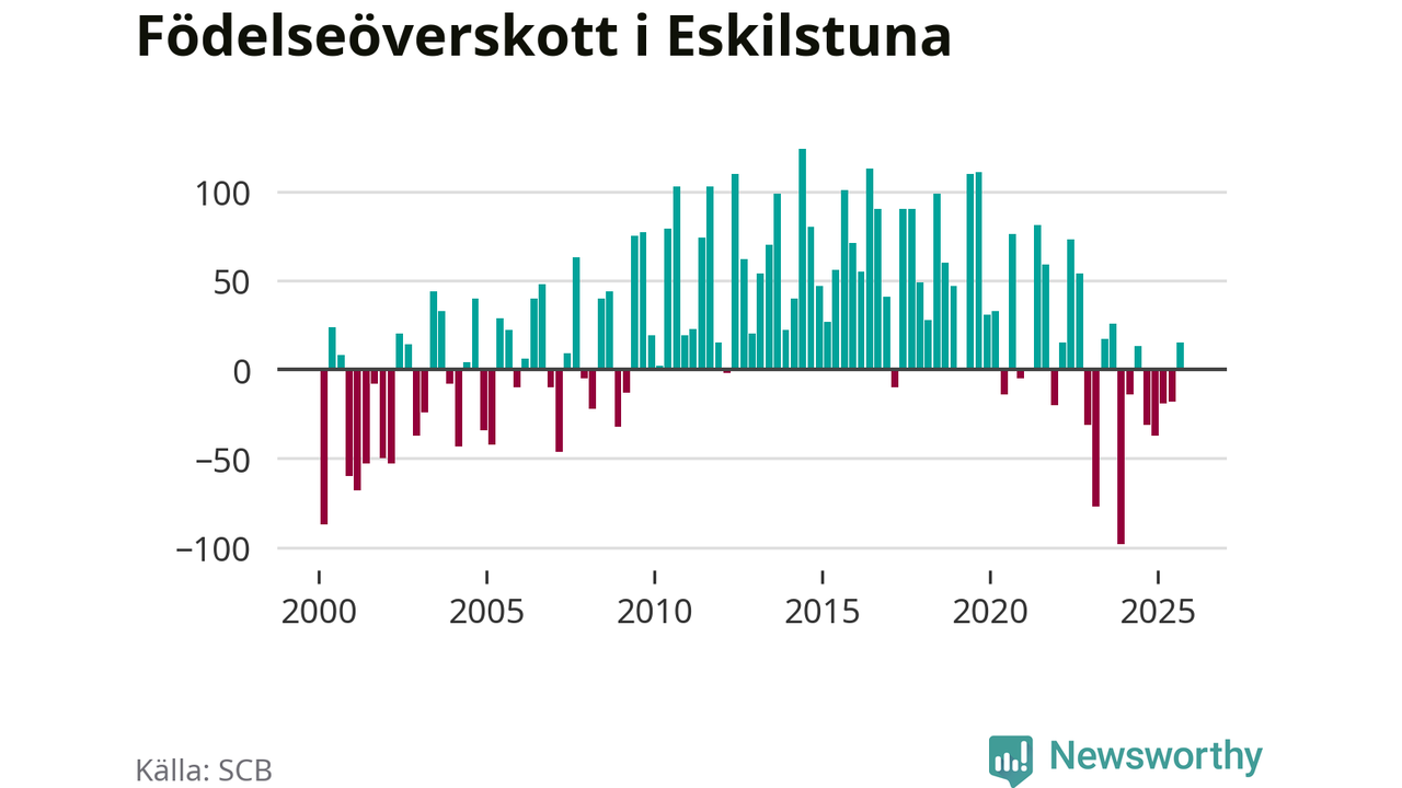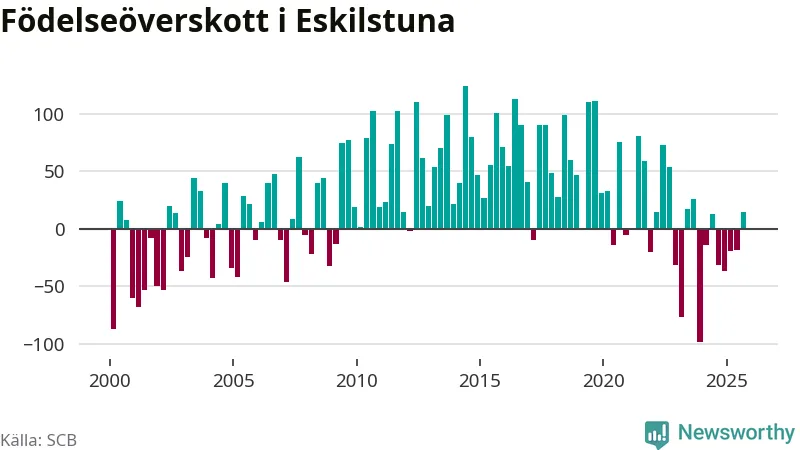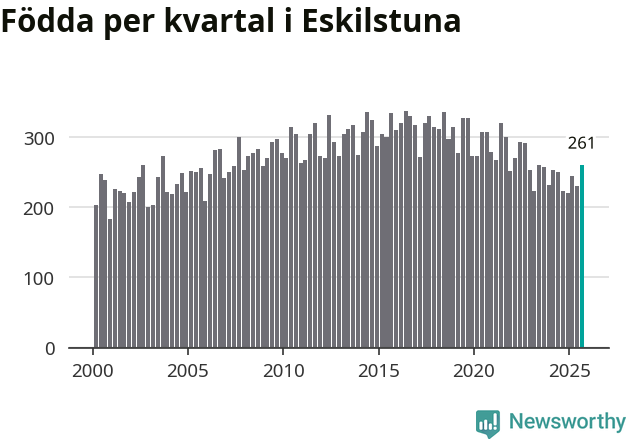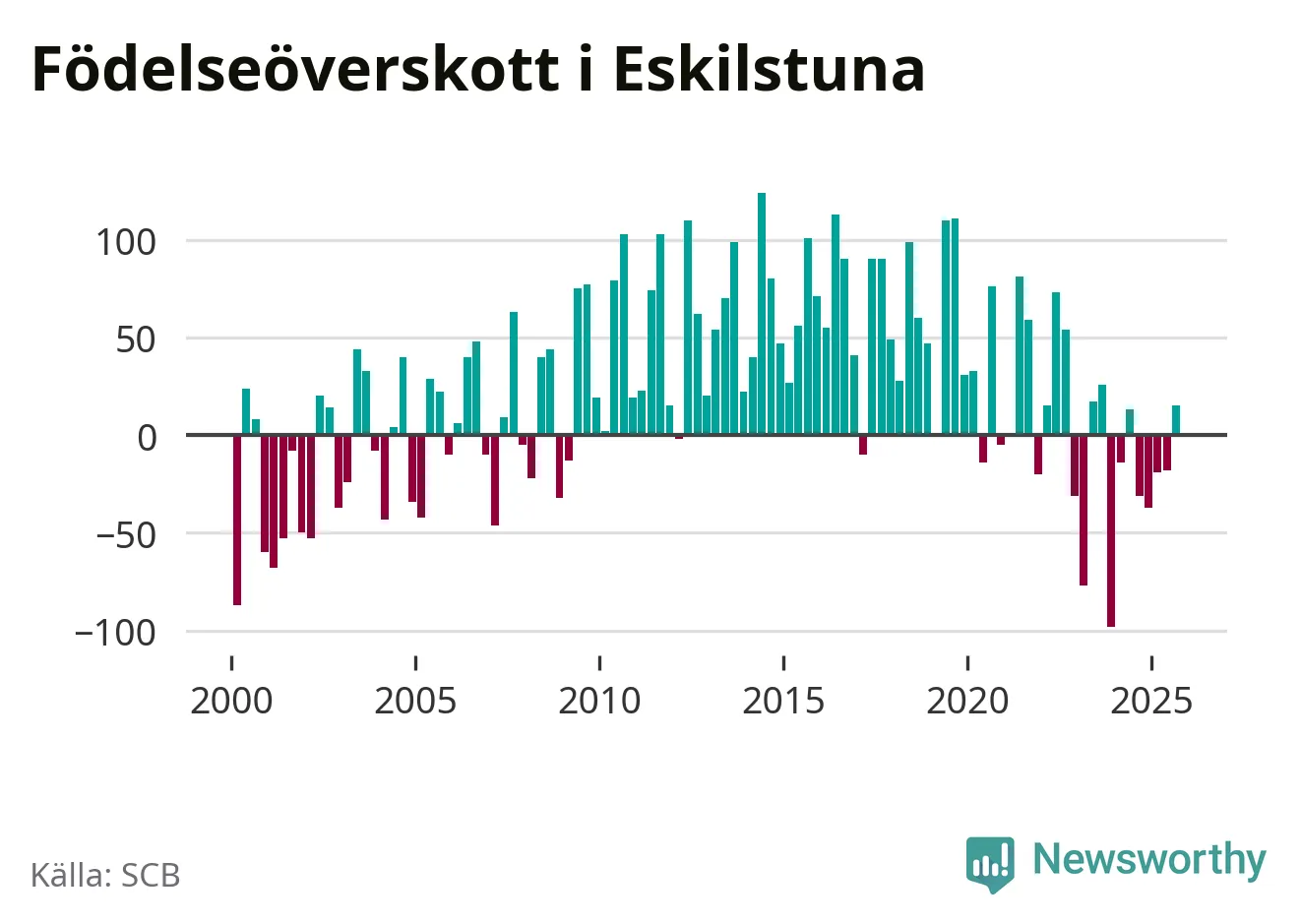 Enligt SCB:s siffror föddes 261 barn i Eskilstuna under det senaste kvartalet. Samtidigt avled 246 personer. Eskilstuna hade alltså ett positivt födelsenetto, vilket kommunen historiskt sett oftast har haft.