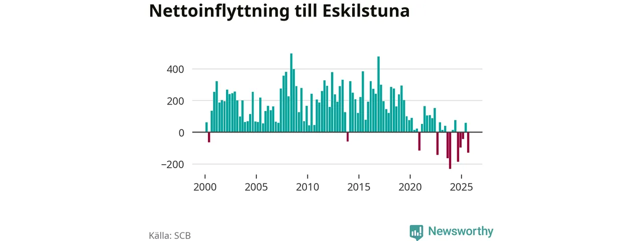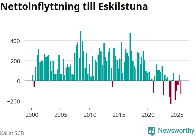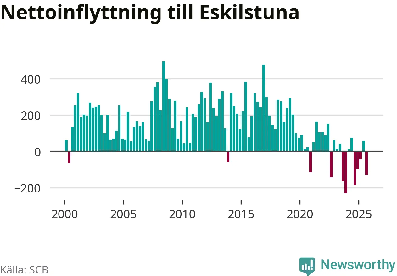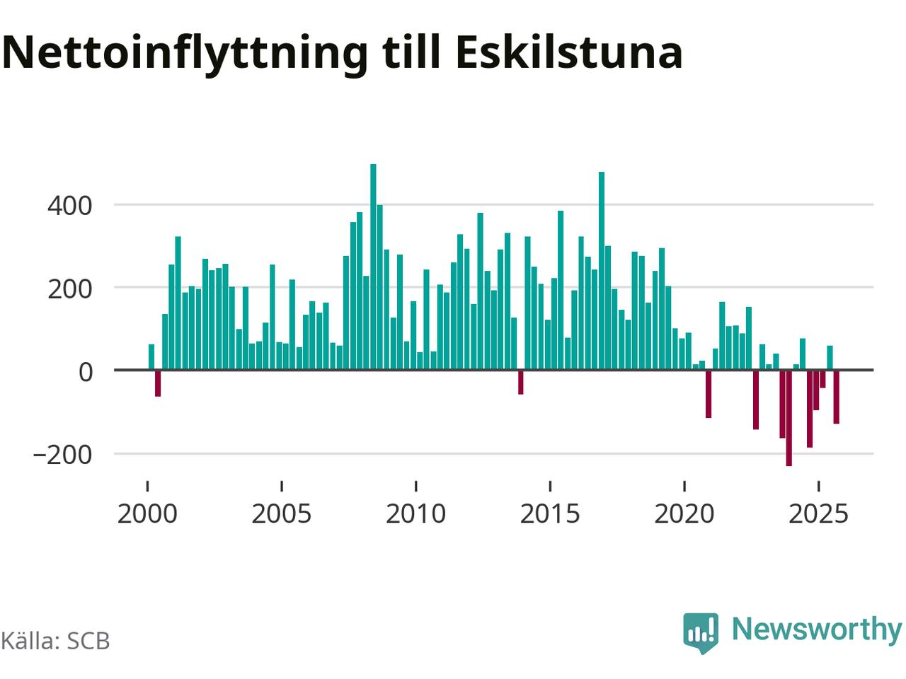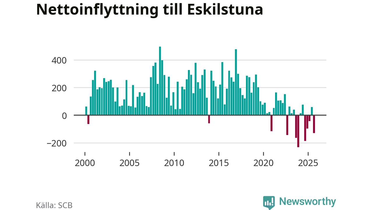 Under tredje kvartalet 2025 flyttade 1 297 personer till kommunen medan 1 427 personer flyttade därifrån. Det är historiskt sett en stor utflyttning under ett kvartal. Sedan seklets början har Eskilstuna haft ett positivt flyttnetto under nästan alla kvartal.