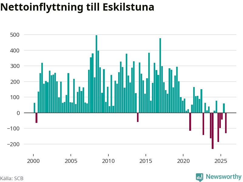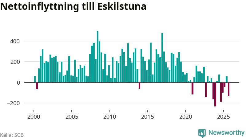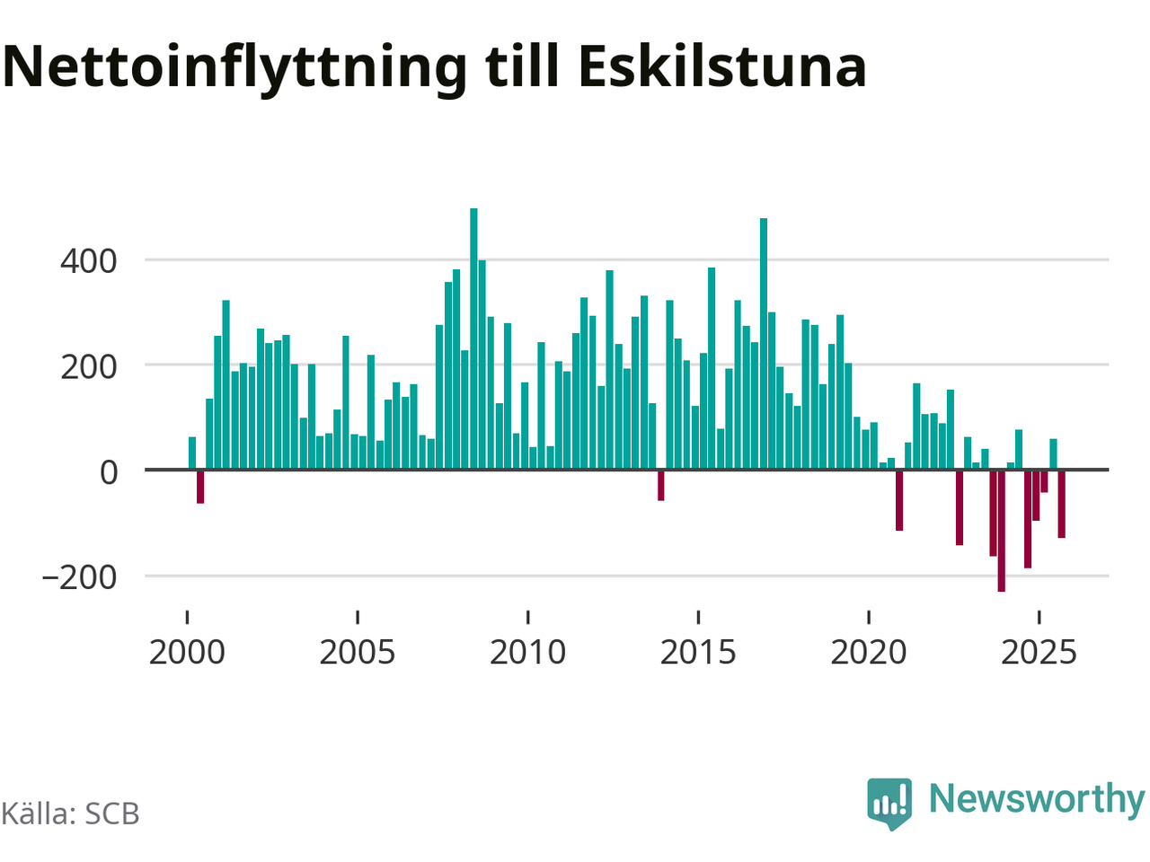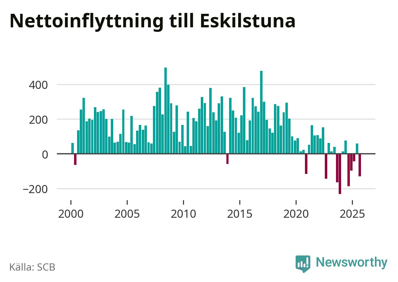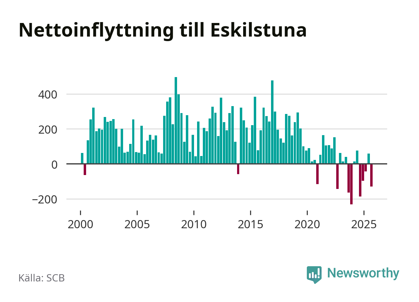 Under tredje kvartalet 2025 flyttade 1 297 personer till kommunen medan 1 427 personer flyttade därifrån. Det är historiskt sett en stor utflyttning under ett kvartal. Sedan seklets början har Eskilstuna haft ett positivt flyttnetto under nästan alla kvartal.