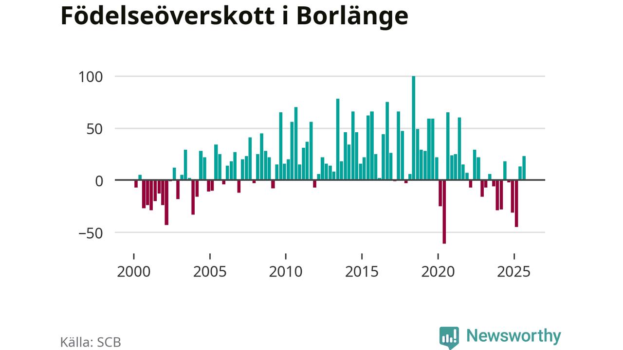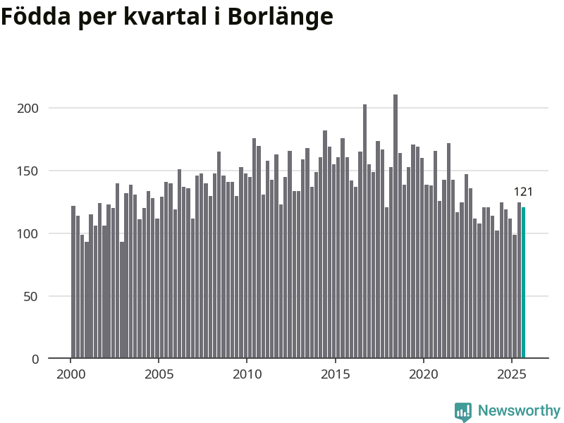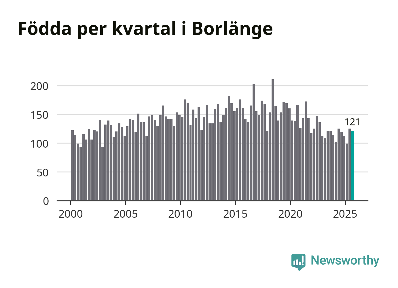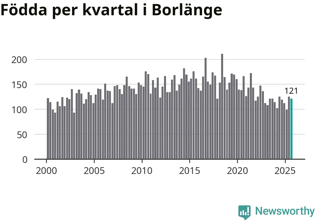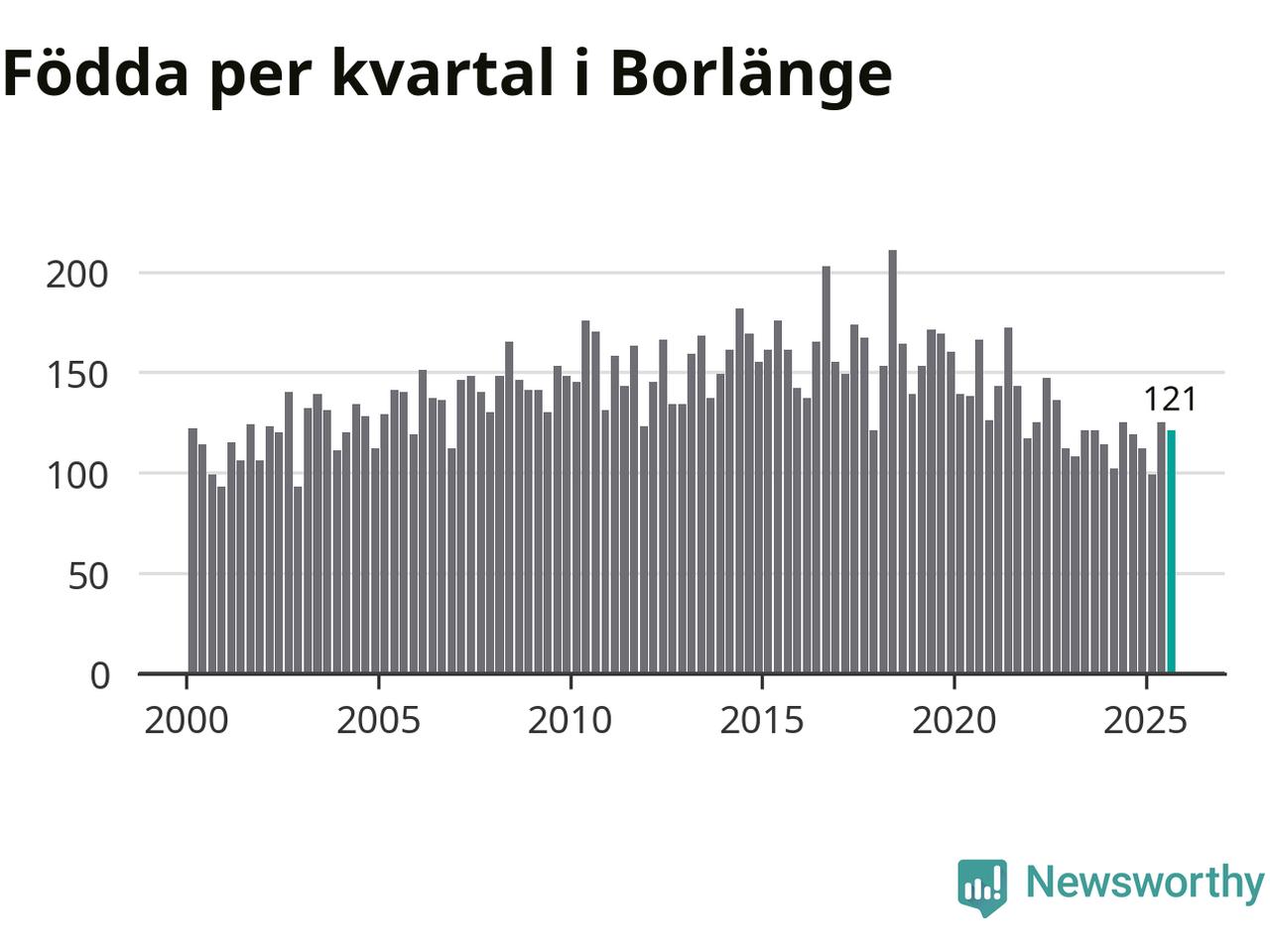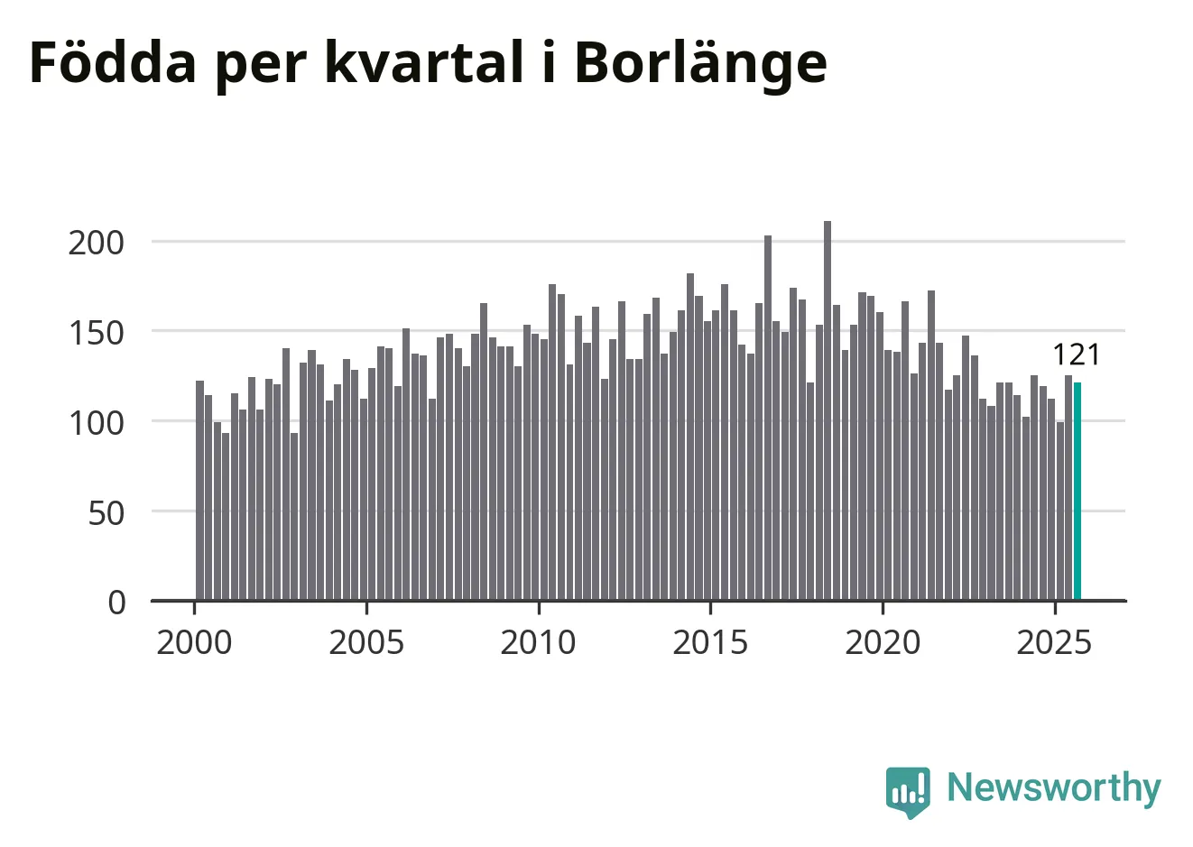 Enligt SCB:s siffror föddes 121 barn i Borlänge under det senaste kvartalet. Samtidigt avled relativt få – 98 personer. Borlänge hade alltså ett positivt födelsenetto, vilket kommunen historiskt sett oftast har haft.