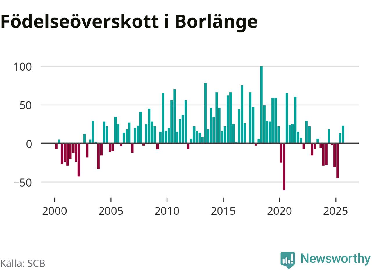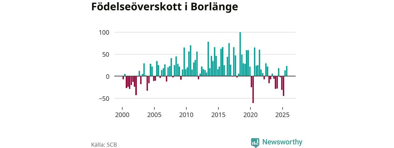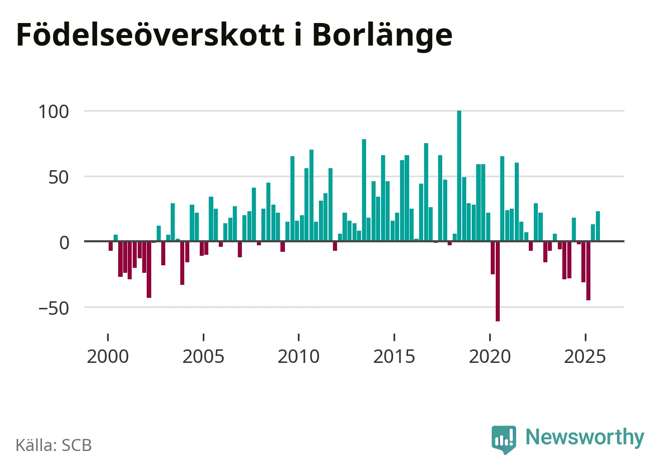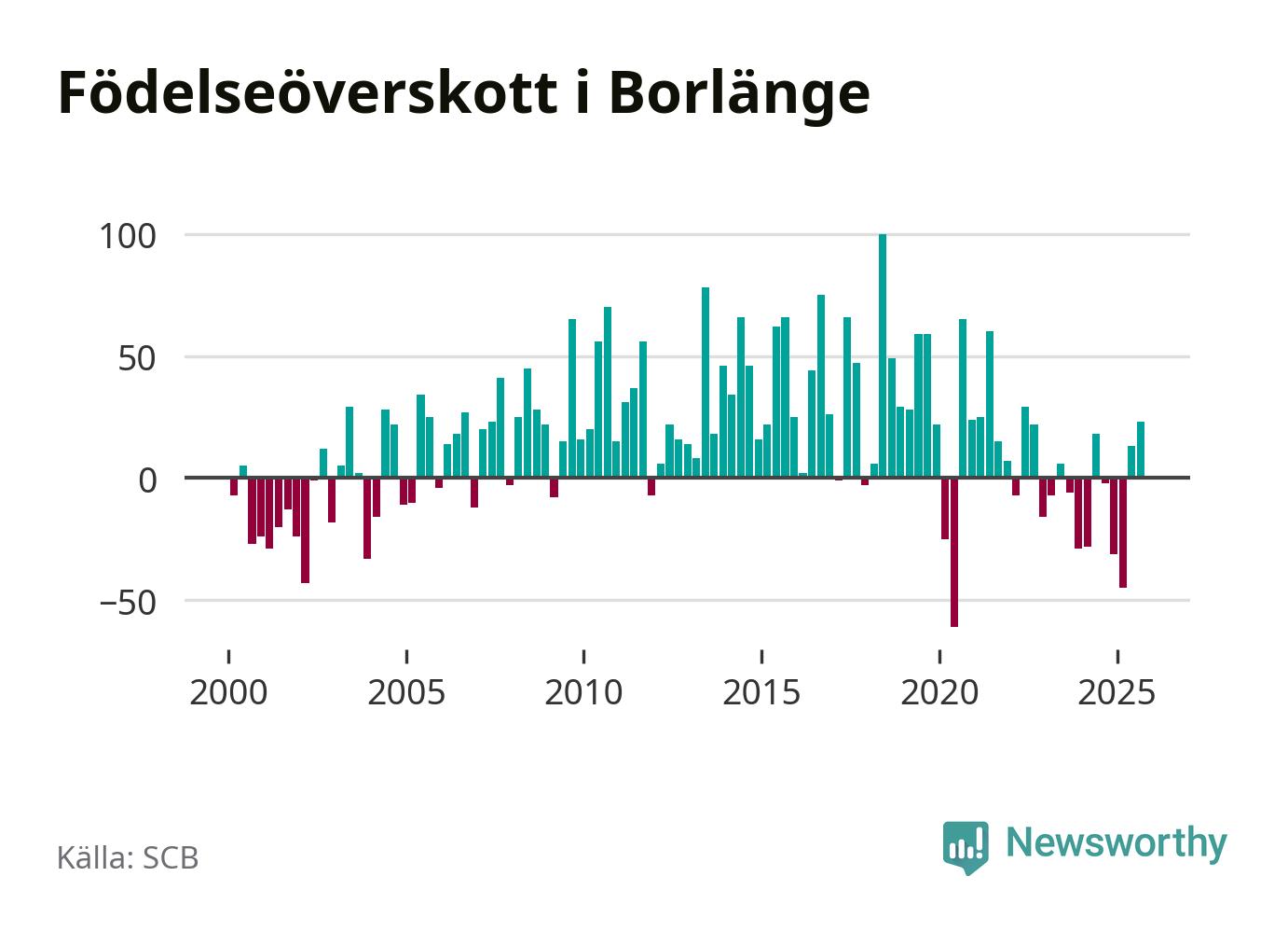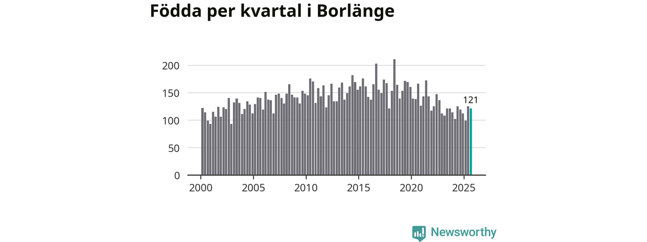 Enligt SCB:s siffror föddes 121 barn i Borlänge under det senaste kvartalet. Samtidigt avled relativt få – 98 personer. Borlänge hade alltså ett positivt födelsenetto, vilket kommunen historiskt sett oftast har haft.