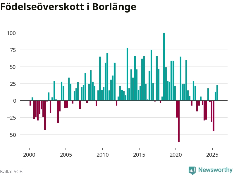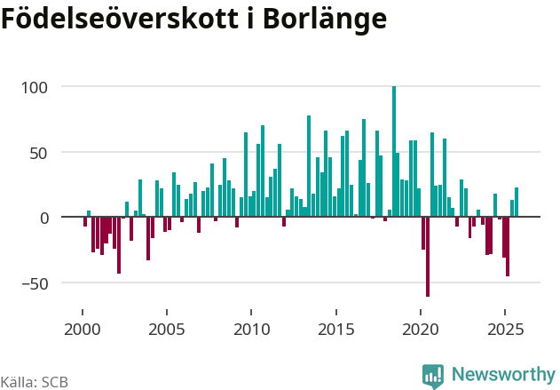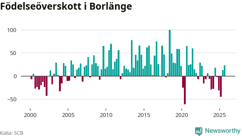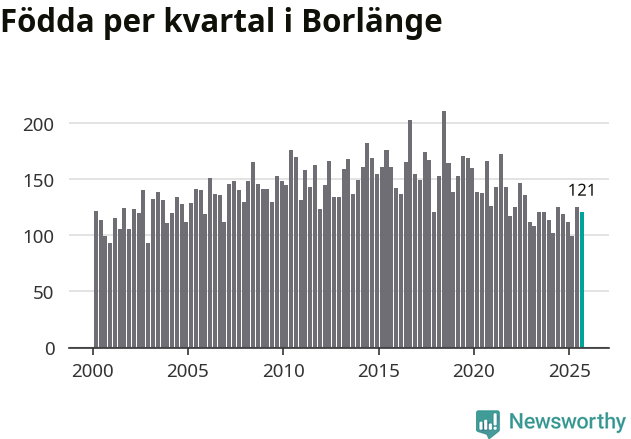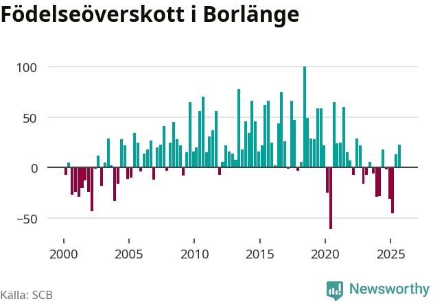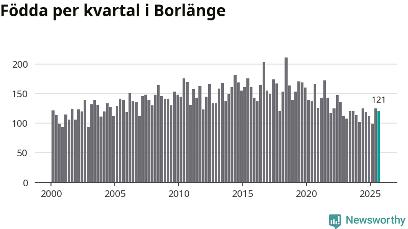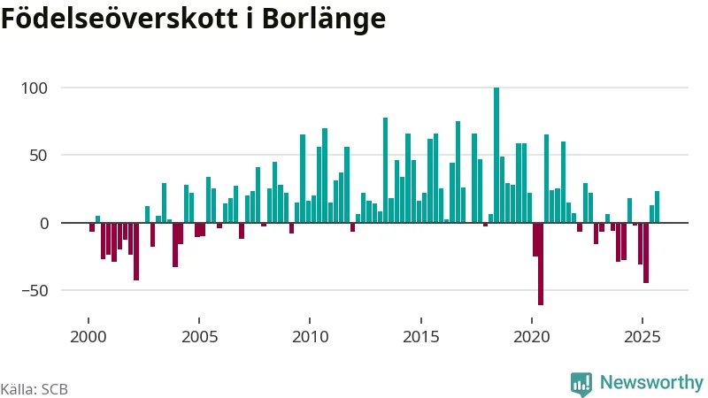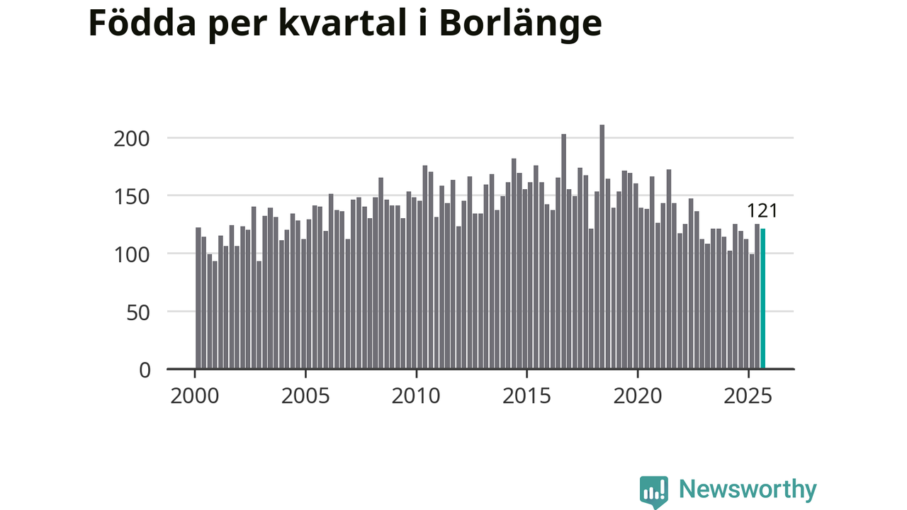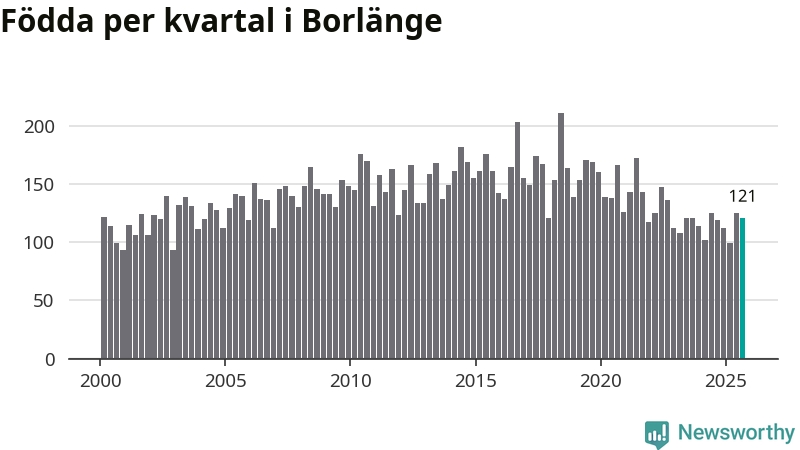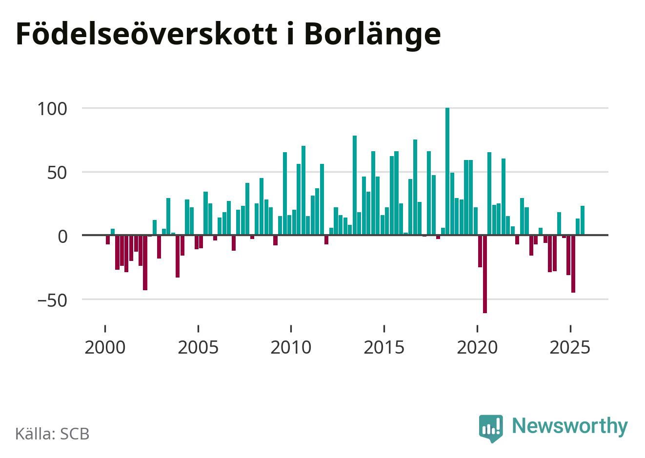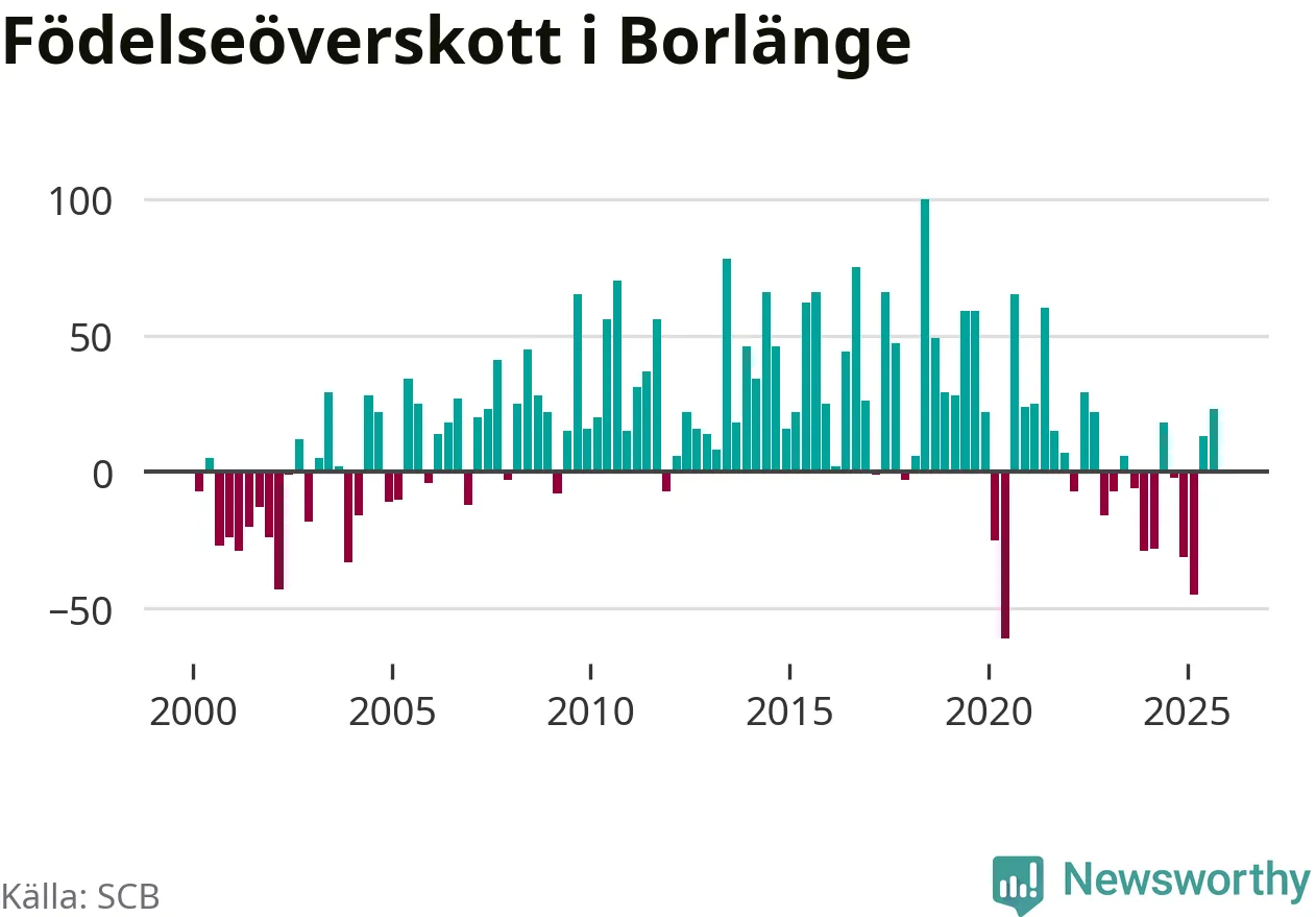 Enligt SCB:s siffror föddes 121 barn i Borlänge under det senaste kvartalet. Samtidigt avled relativt få – 98 personer. Borlänge hade alltså ett positivt födelsenetto, vilket kommunen historiskt sett oftast har haft.