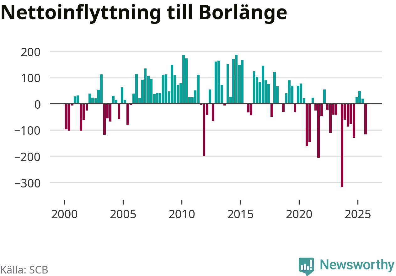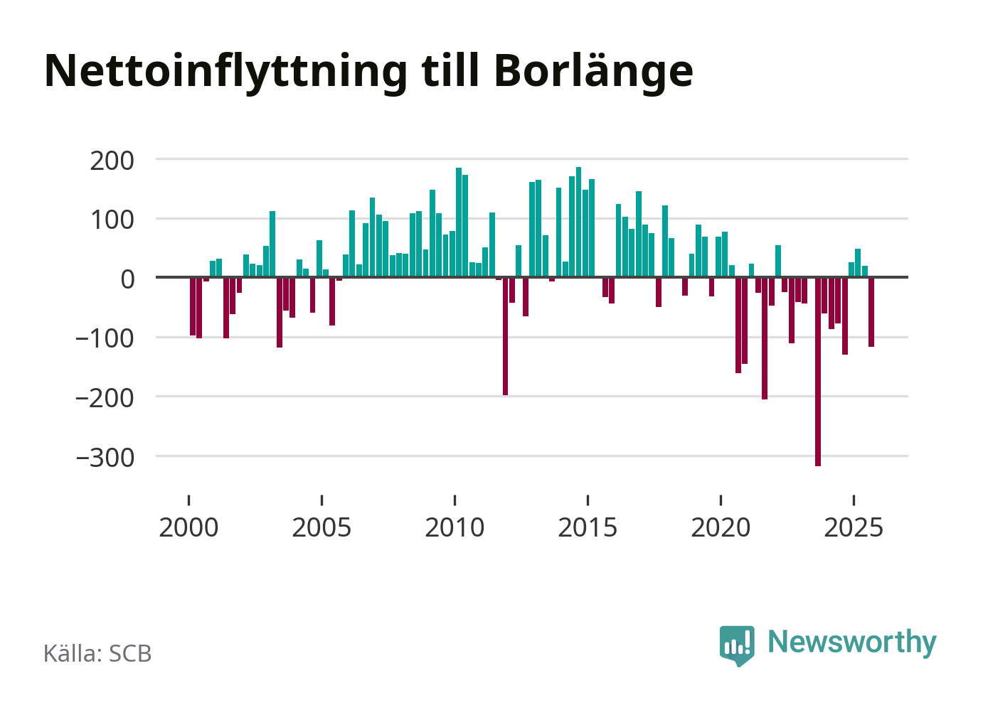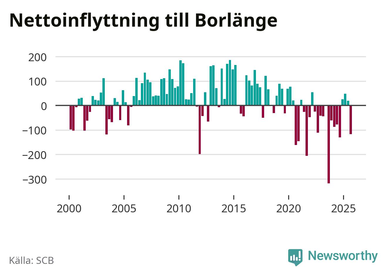 Under tredje kvartalet 2025 flyttade 728 personer till kommunen medan 845 personer flyttade därifrån. Det är historiskt sett en stor utflyttning under ett kvartal. Sedan seklets början har Borlänge haft ungefär lika många kvartal med positivt flyttnetto som negativt.