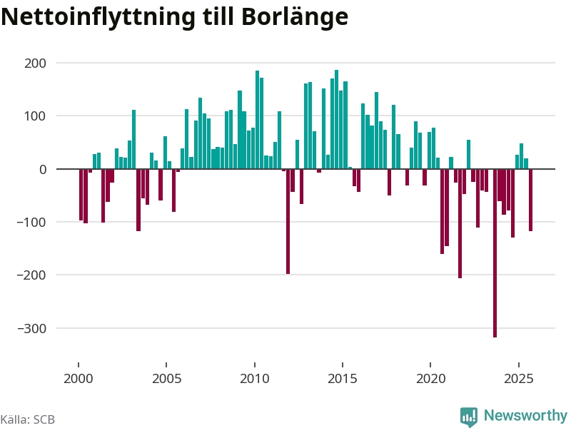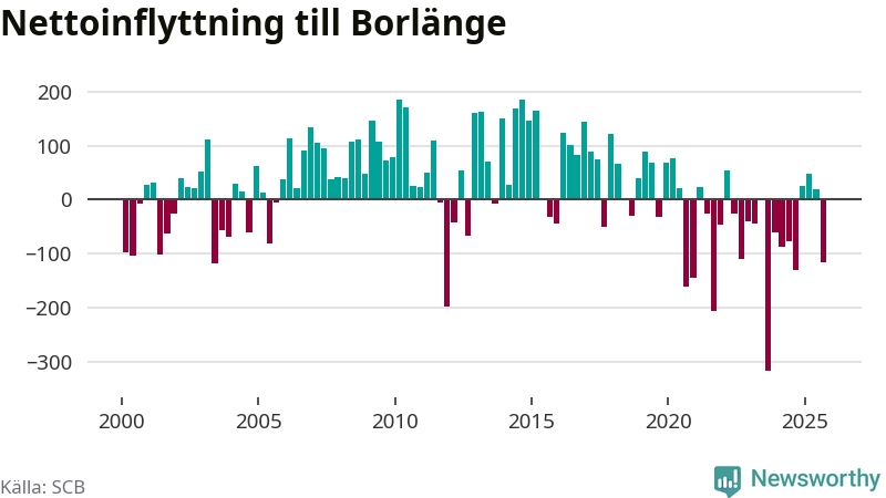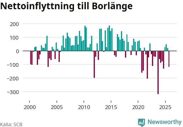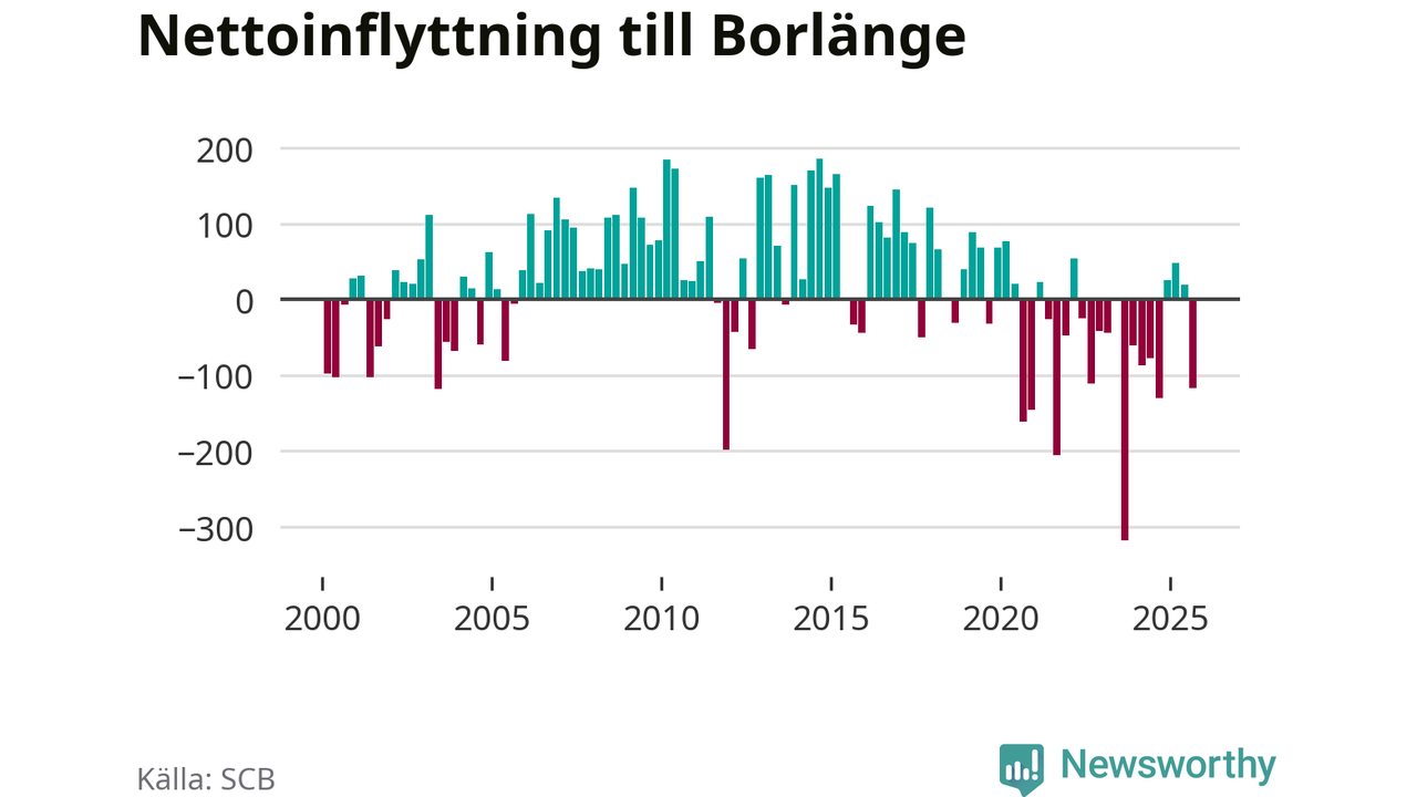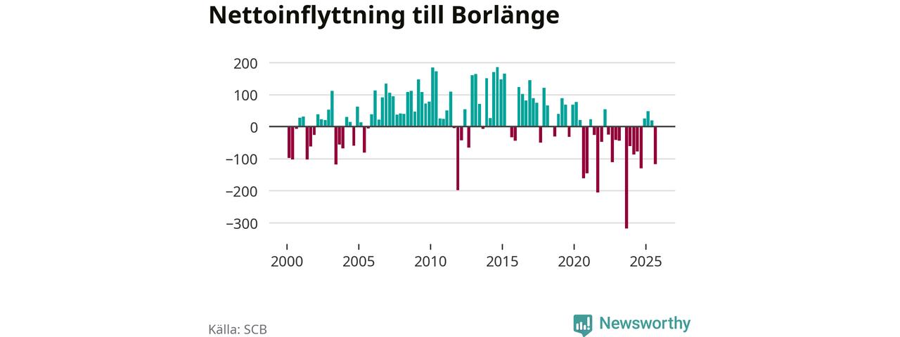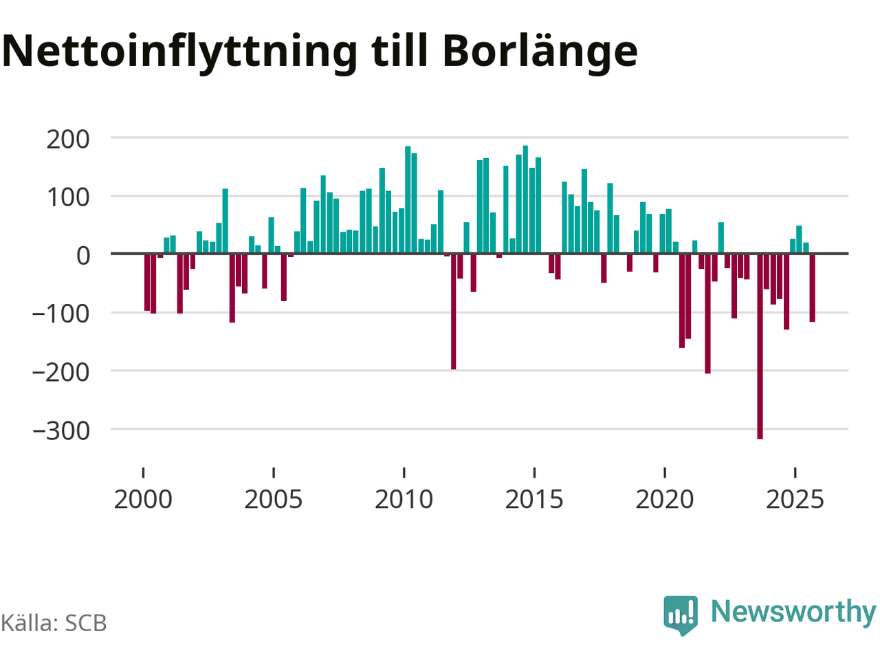Under tredje kvartalet 2025 flyttade 728 personer till kommunen medan 845 personer flyttade därifrån. Det är historiskt sett en stor utflyttning under ett kvartal. Sedan seklets början har Borlänge haft ungefär lika många kvartal med positivt flyttnetto som negativt.
