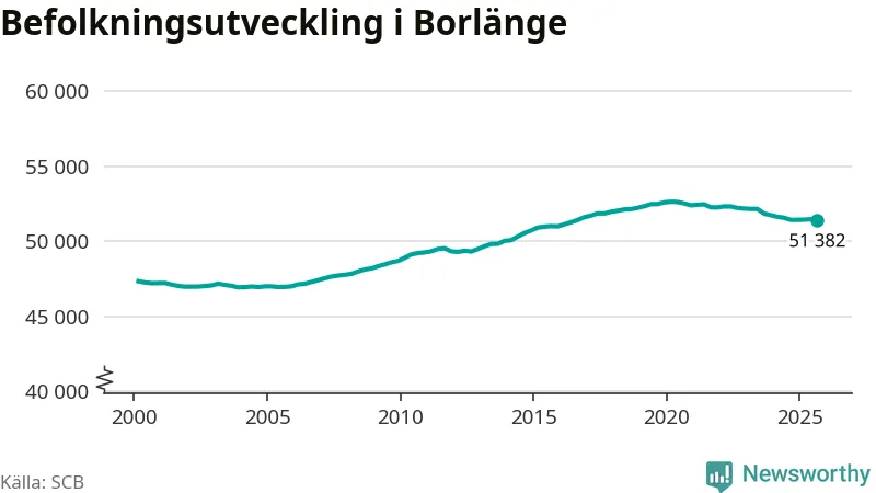 Jämfört med för ett år sedan har befolkningen i Borlänge minskat med drygt 40 personer. Sedan millennieskiftet har folkmängden ökat med runt 4 050 personer, eller 9 procent.