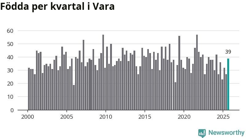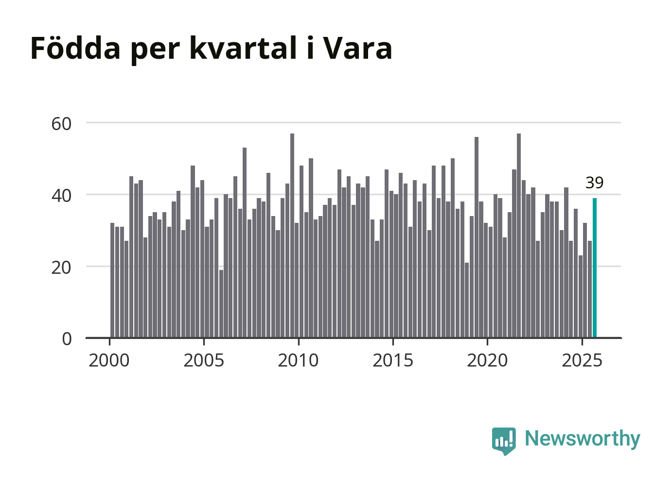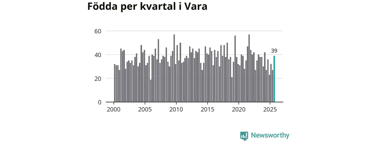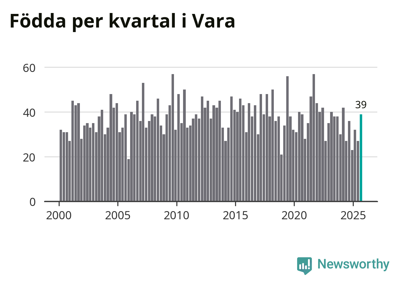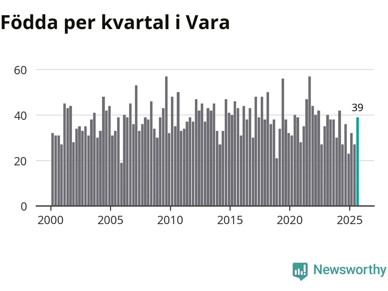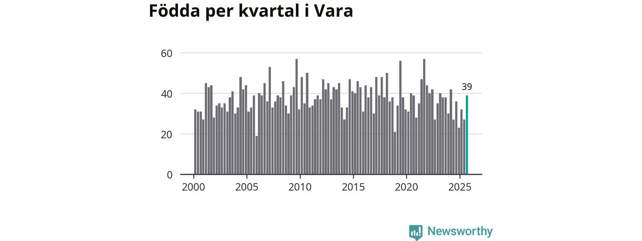 Enligt SCB:s siffror föddes 39 barn i Vara under det senaste kvartalet. Samtidigt avled relativt få – 37 personer. Skillnaden mellan antal födda och döda är så liten att det inte går att säga om det beror på något annat än SCB:s röjandeskydd. Kommunen har oftast haft negativt födelsenetto tidigare.