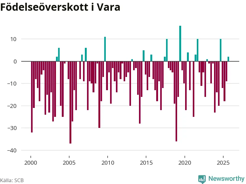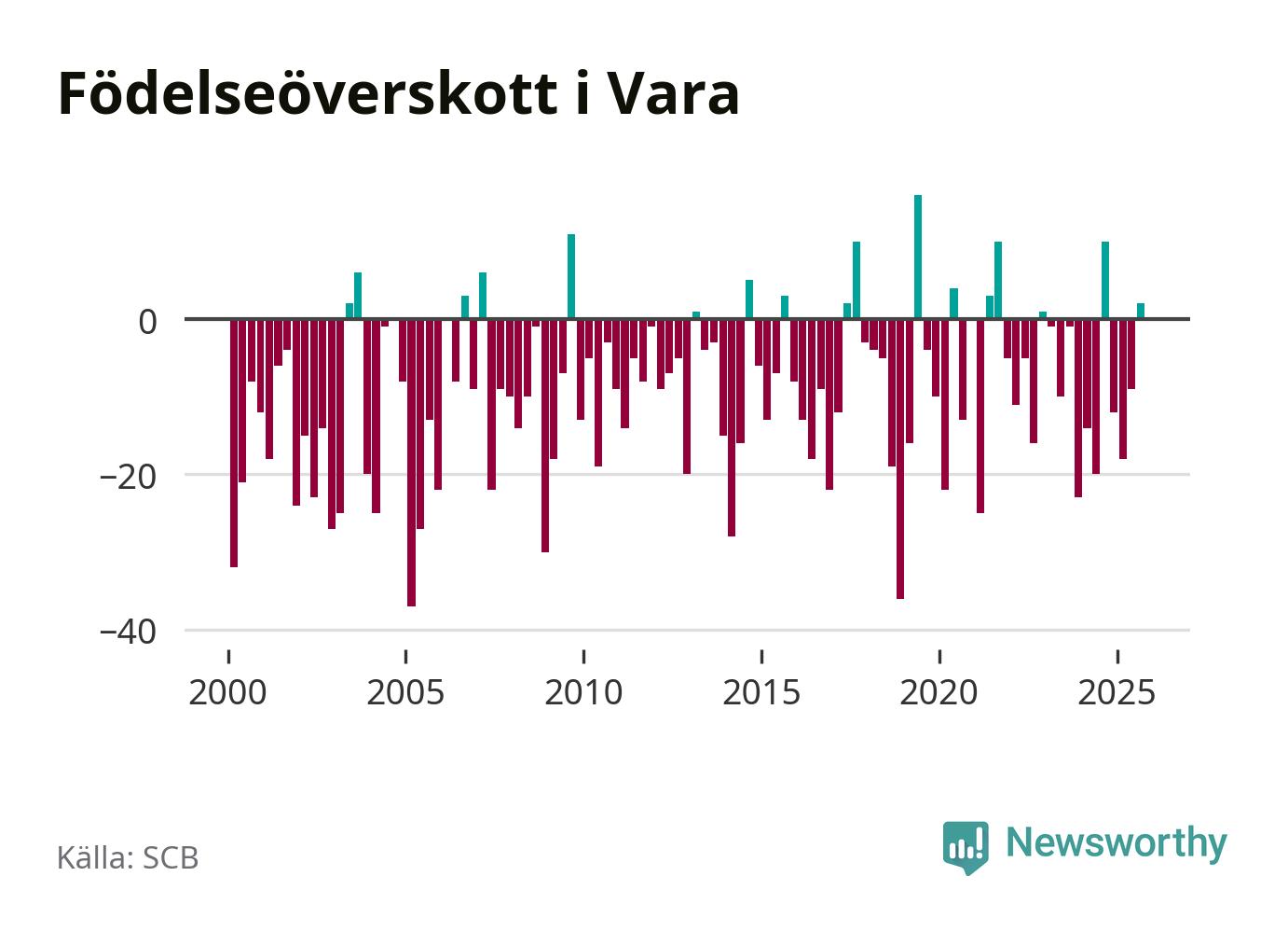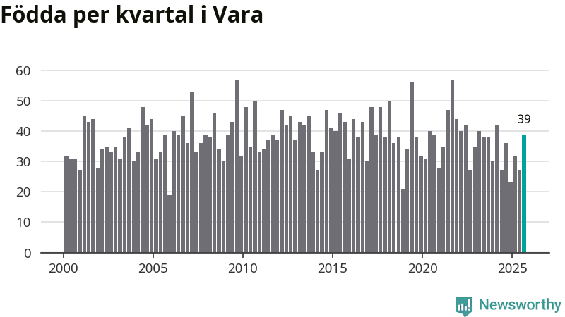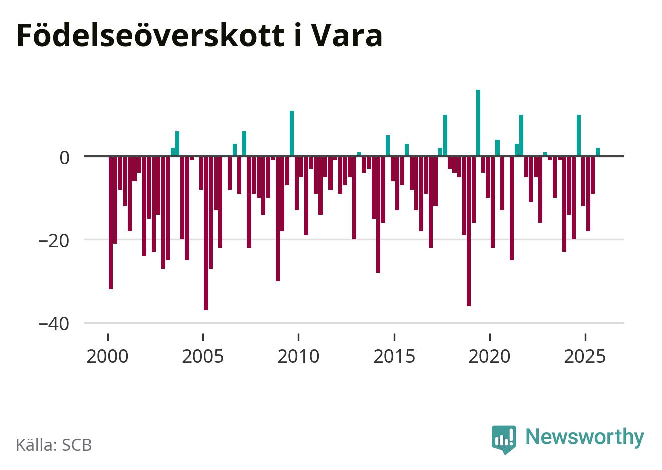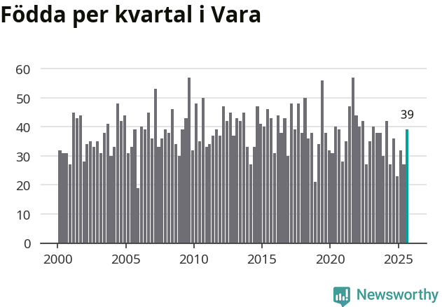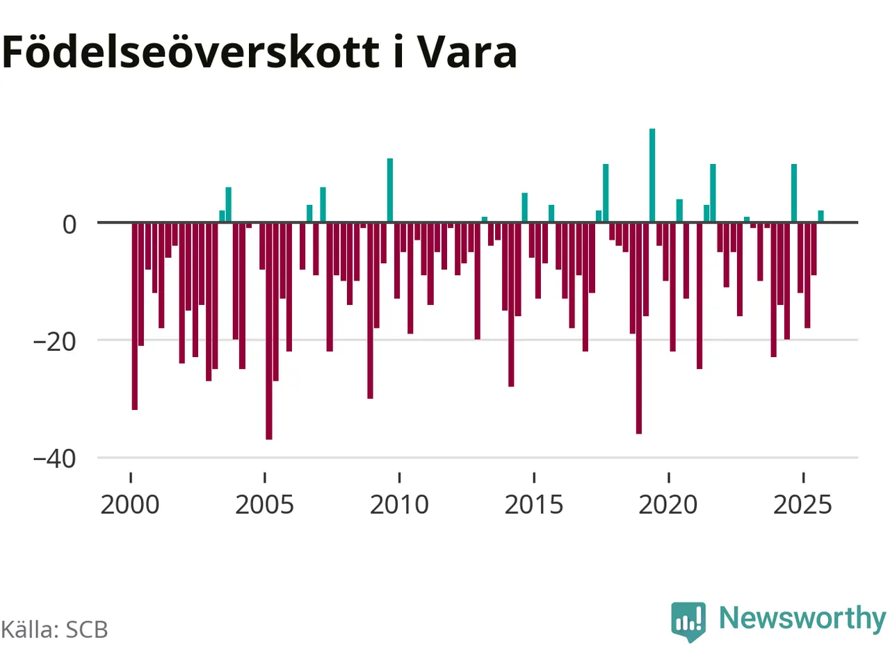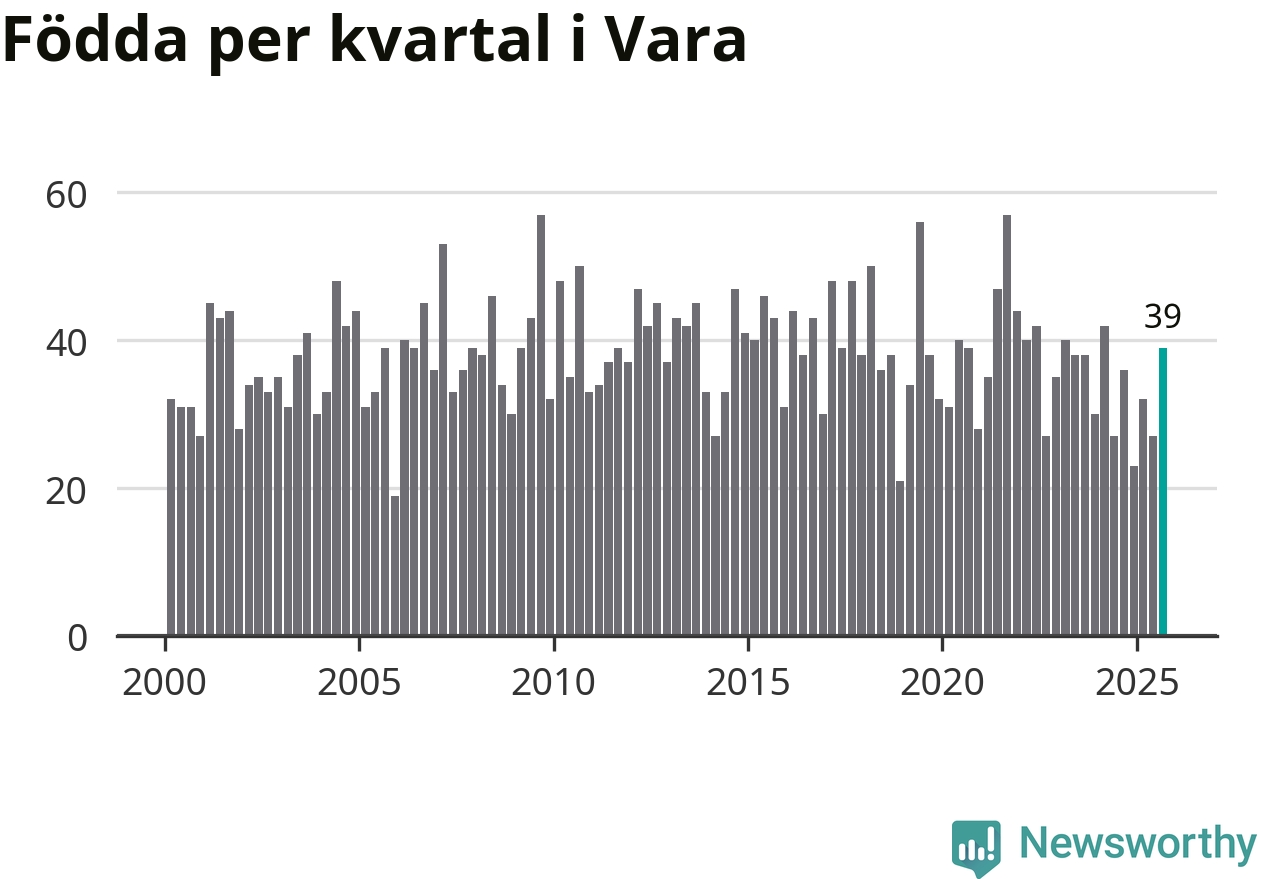 Enligt SCB:s siffror föddes 39 barn i Vara under det senaste kvartalet. Samtidigt avled relativt få – 37 personer. Skillnaden mellan antal födda och döda är så liten att det inte går att säga om det beror på något annat än SCB:s röjandeskydd. Kommunen har oftast haft negativt födelsenetto tidigare.