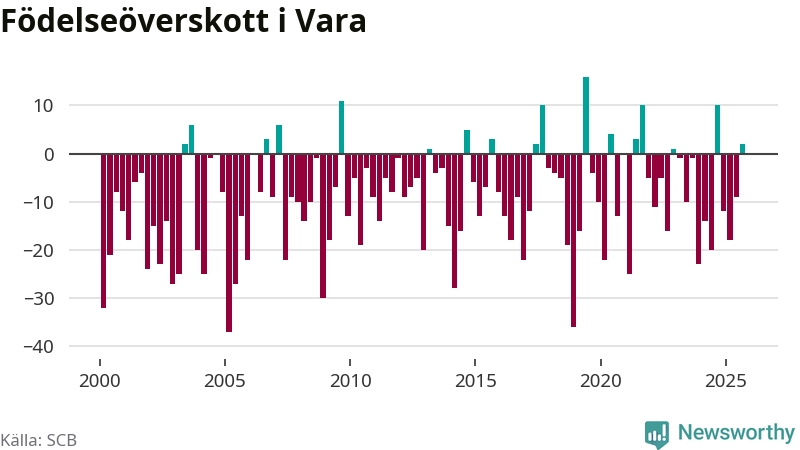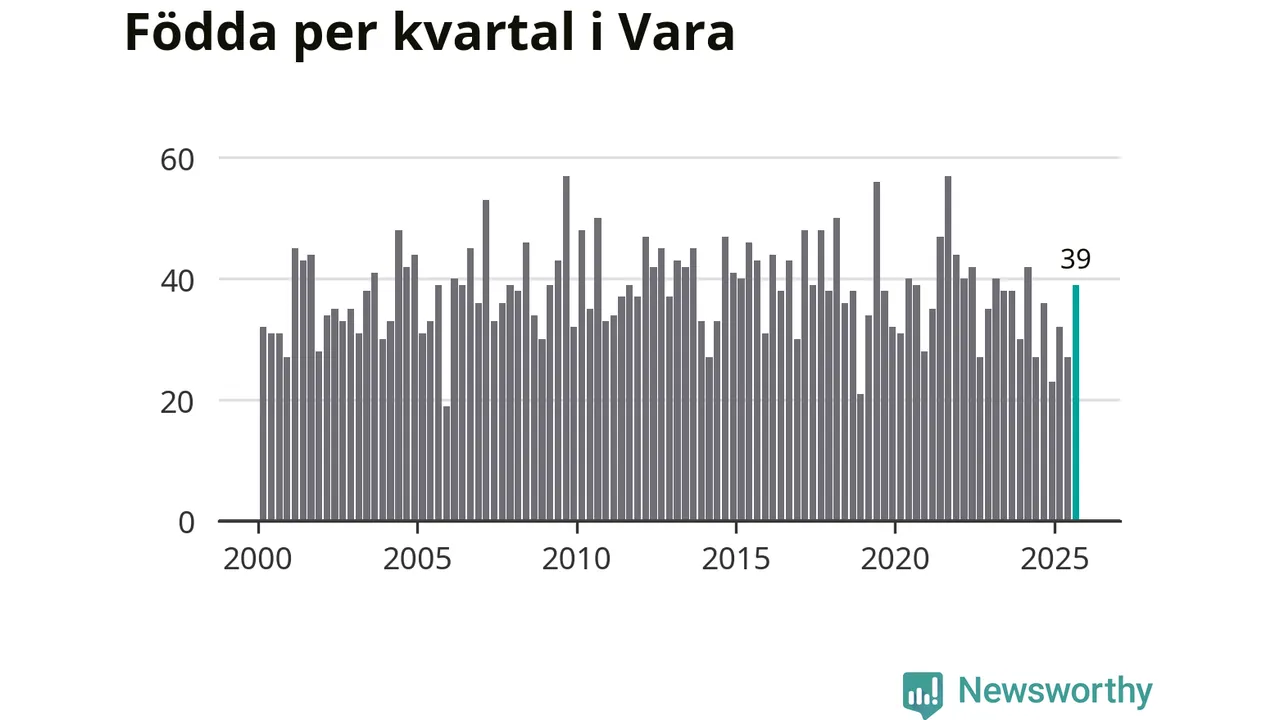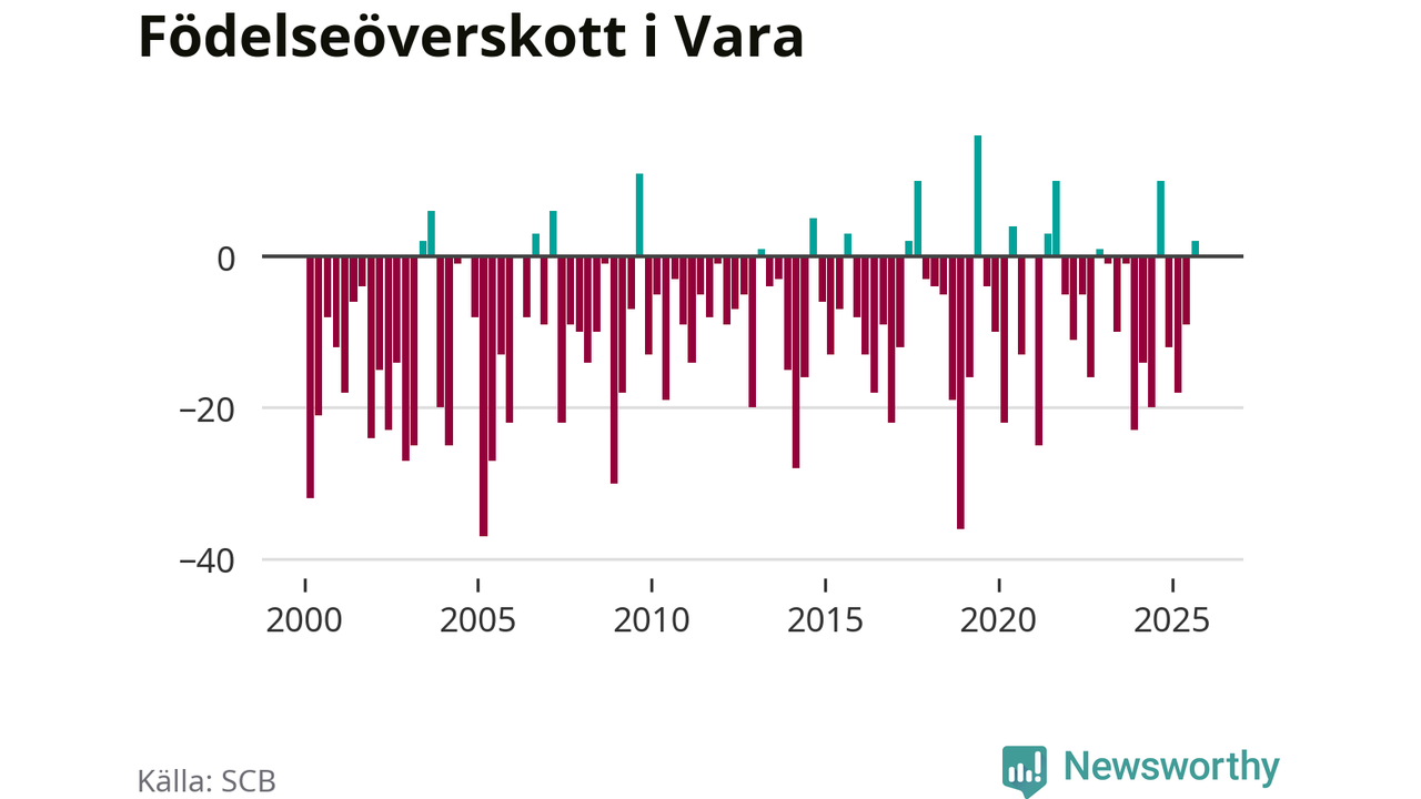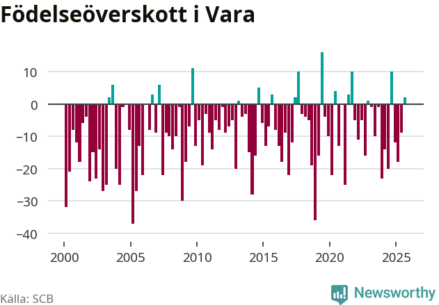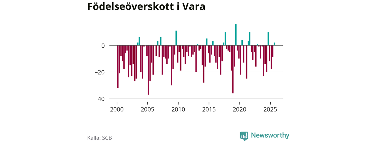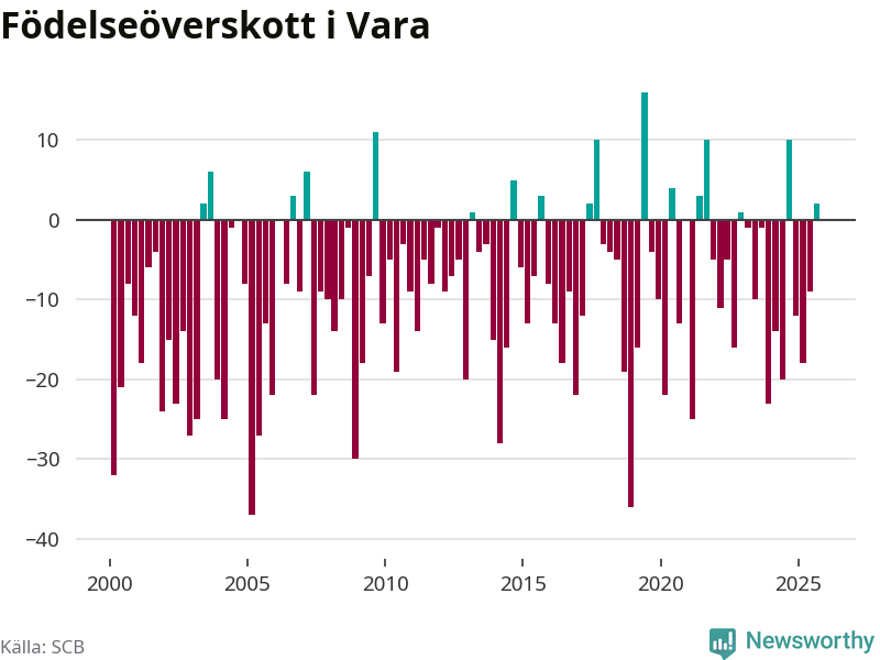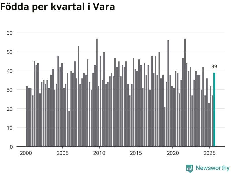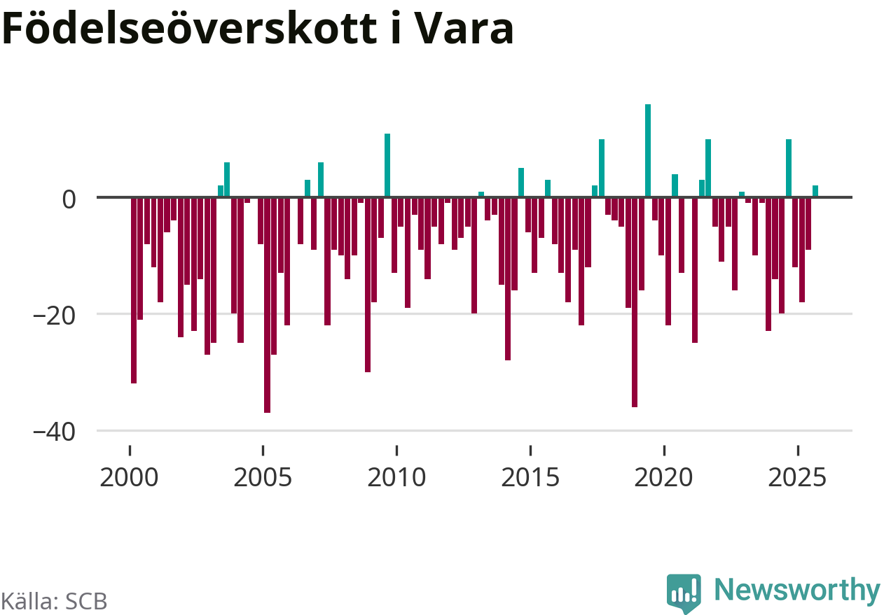 Enligt SCB:s siffror föddes 39 barn i Vara under det senaste kvartalet. Samtidigt avled relativt få – 37 personer. Skillnaden mellan antal födda och döda är så liten att det inte går att säga om det beror på något annat än SCB:s röjandeskydd. Kommunen har oftast haft negativt födelsenetto tidigare.