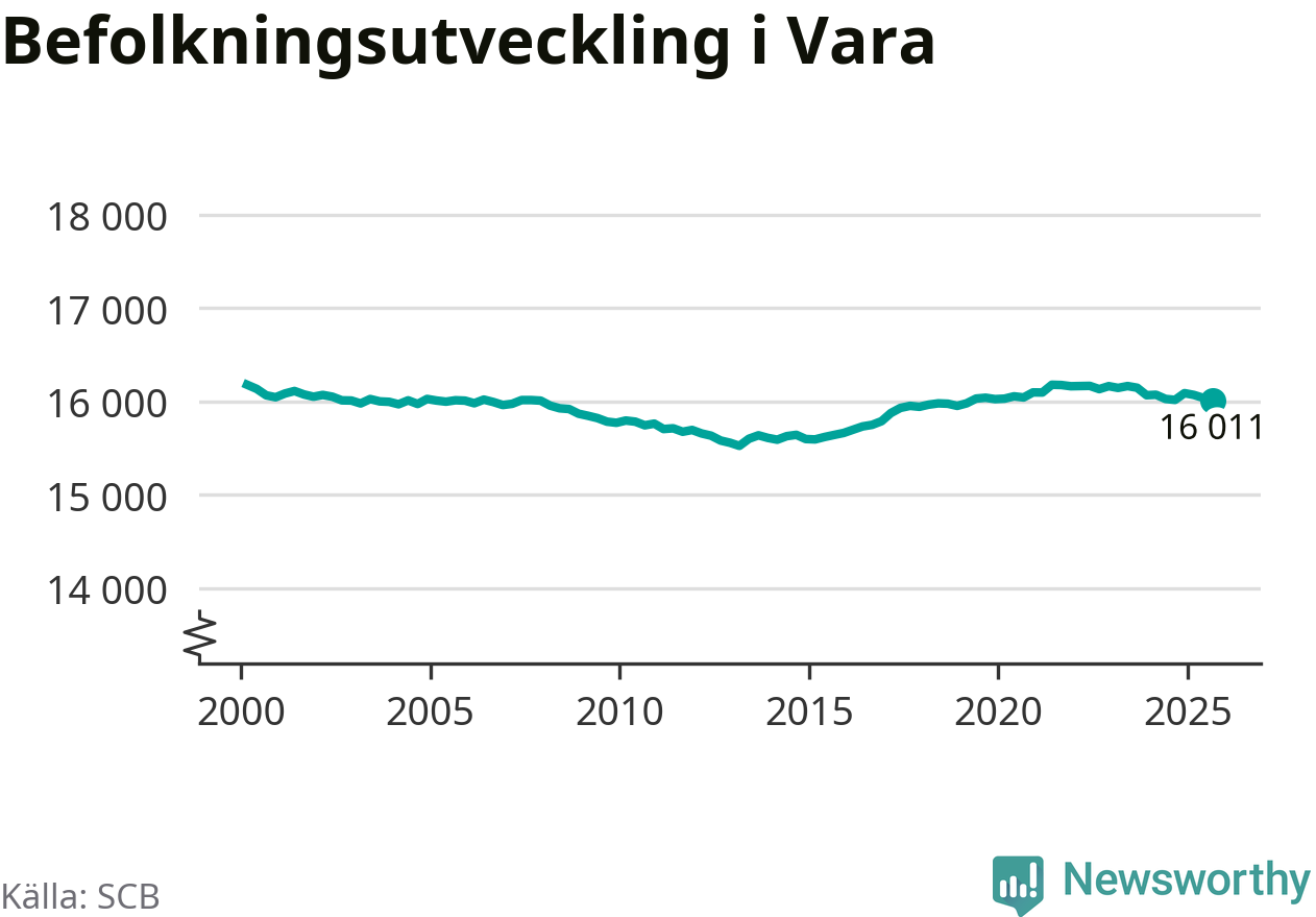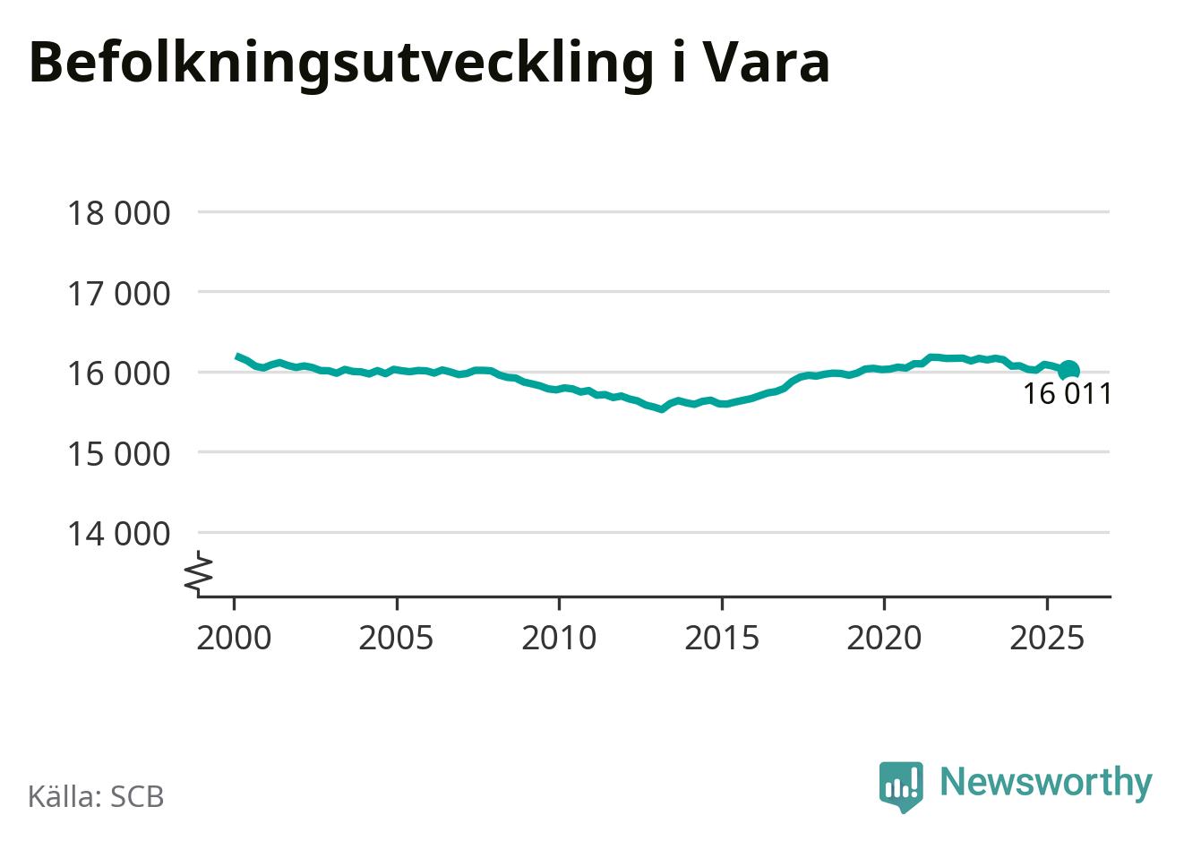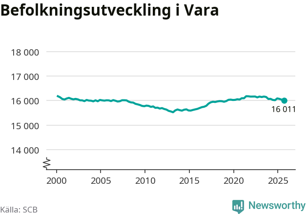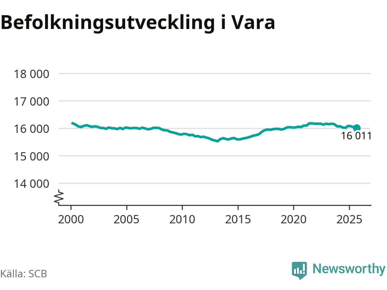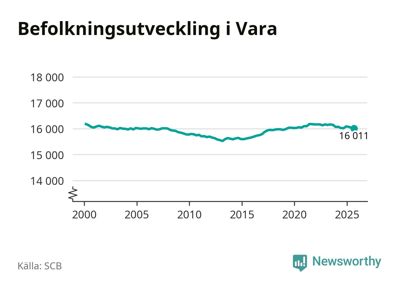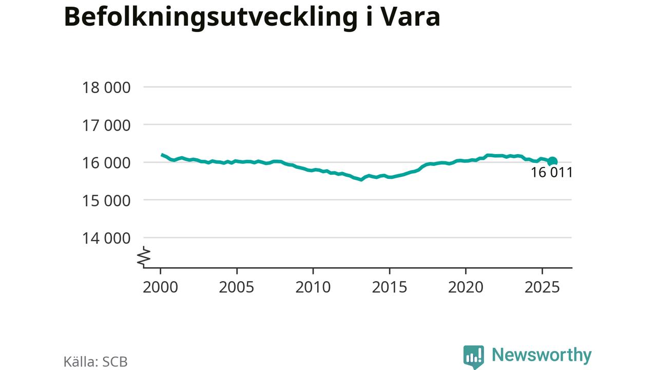 Befolkningen minskade i Vara kommun under det tredje kvartalet 2025. Den 30 september bodde enligt SCB:s senaste siffror 16 011 personer i kommunen, vilket är 26 färre än i slutet av andra kvartalet.