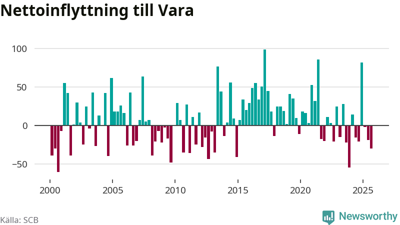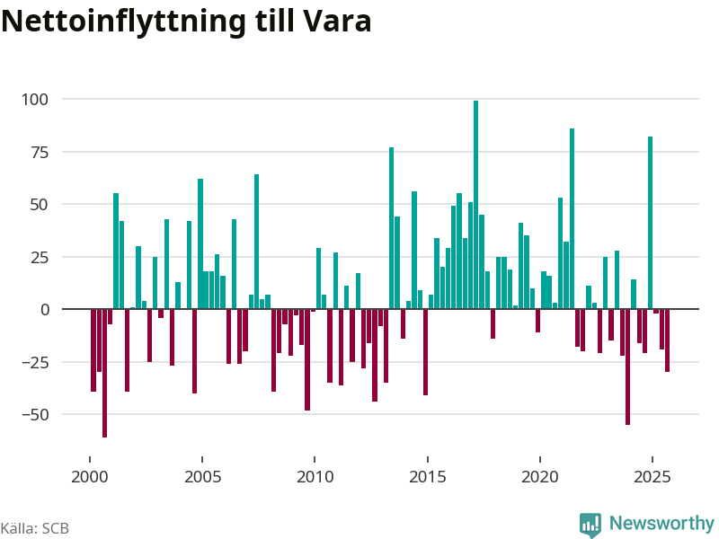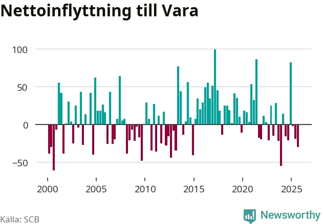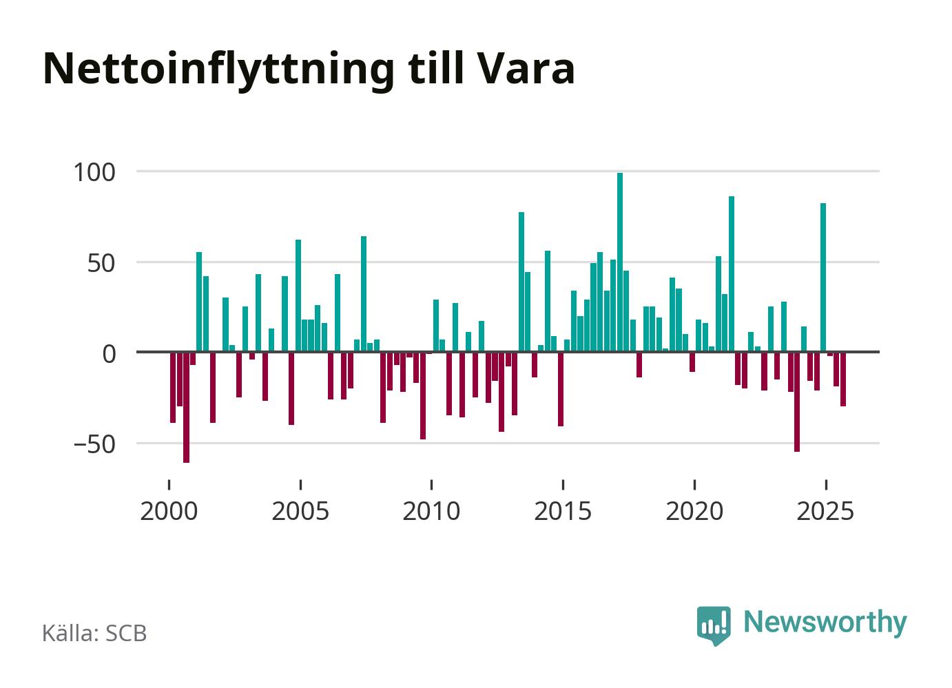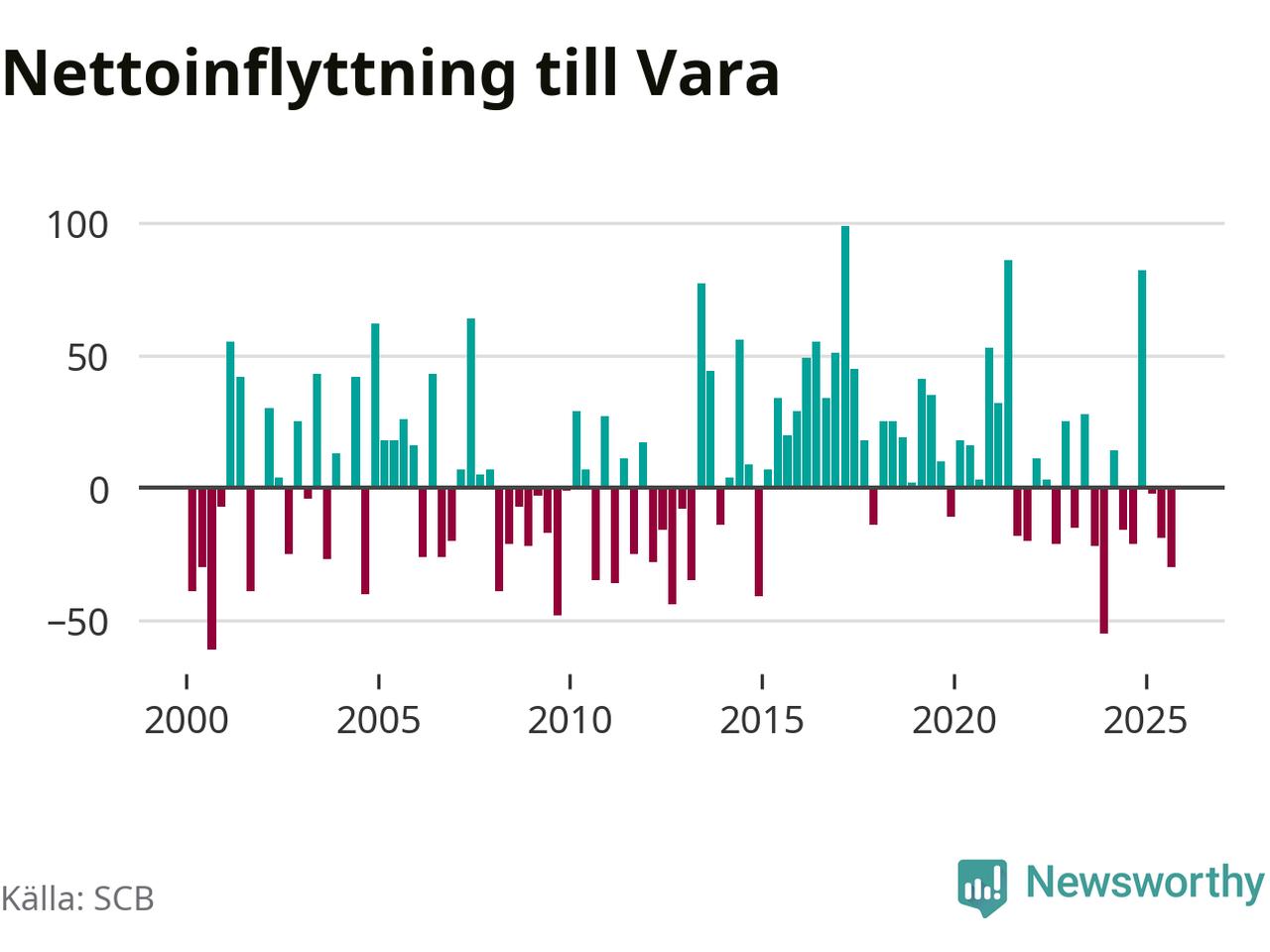 Under tredje kvartalet 2025 flyttade 249 personer till kommunen medan 279 personer flyttade därifrån. Det är historiskt sett en stor inflyttning under ett kvartal – men samtidigt var utflyttningen den största hittills. Sedan seklets början har Vara oftast haft ett positivt flyttnetto.