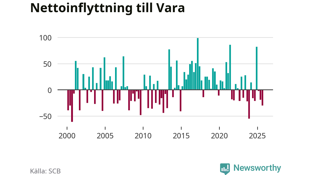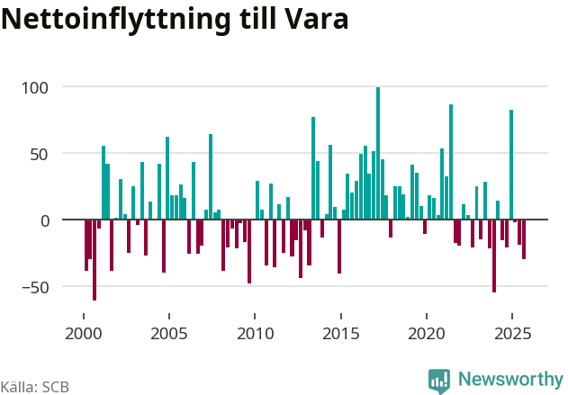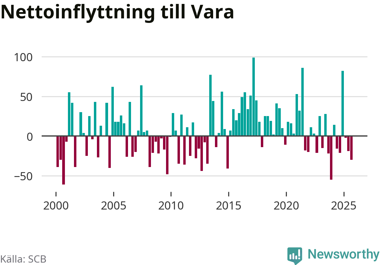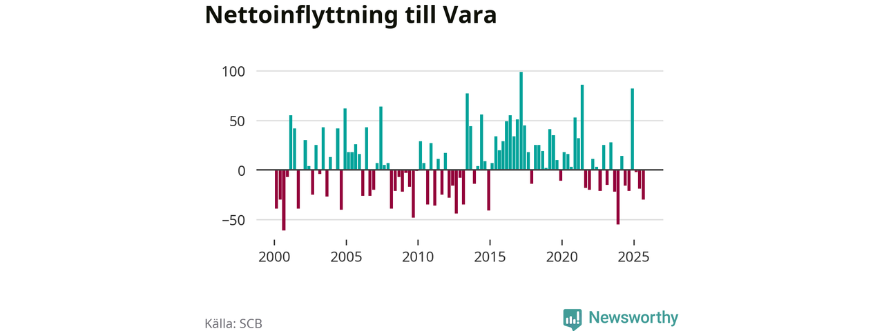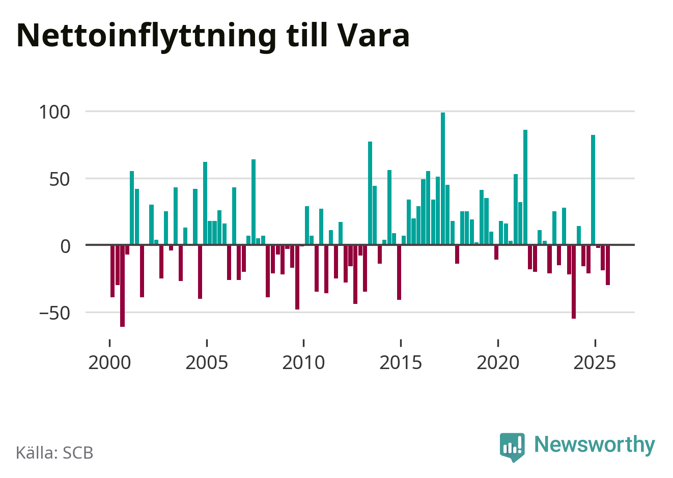 Under tredje kvartalet 2025 flyttade 249 personer till kommunen medan 279 personer flyttade därifrån. Det är historiskt sett en stor inflyttning under ett kvartal – men samtidigt var utflyttningen den största hittills. Sedan seklets början har Vara oftast haft ett positivt flyttnetto.