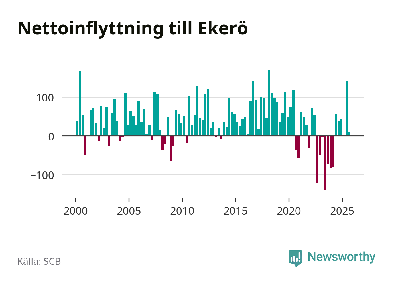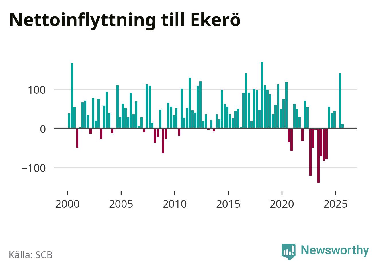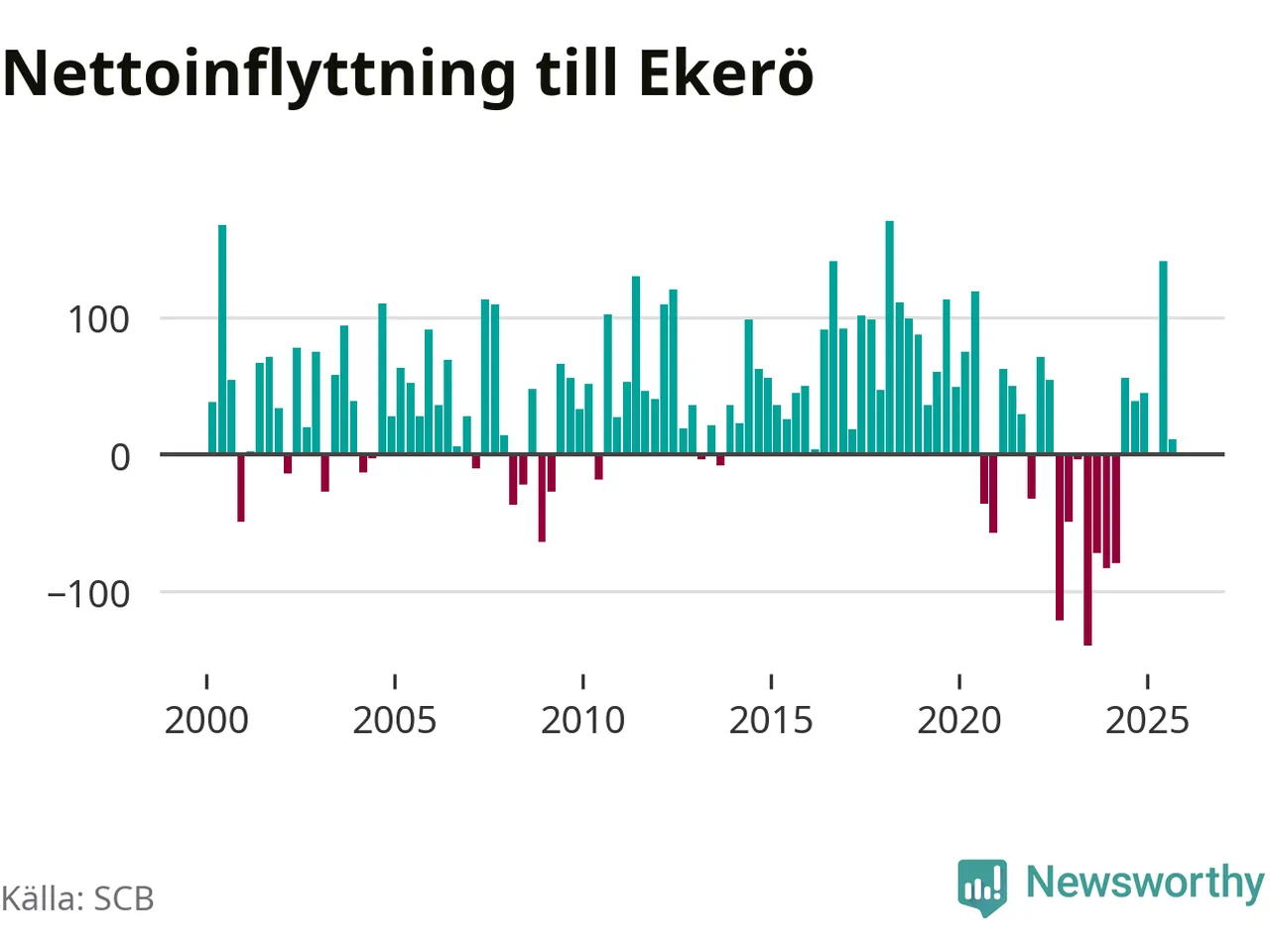 Under tredje kvartalet 2025 flyttade 497 personer till kommunen medan 486 personer flyttade därifrån. Det är historiskt sett en stor utflyttning under ett kvartal. Sedan seklets början har Ekerö oftast haft ett positivt flyttnetto, inklusive det senaste kvartalet.