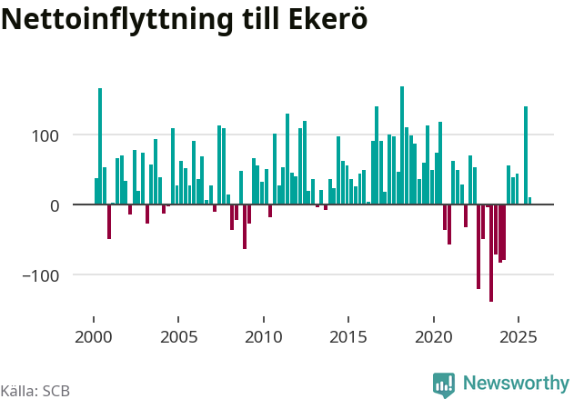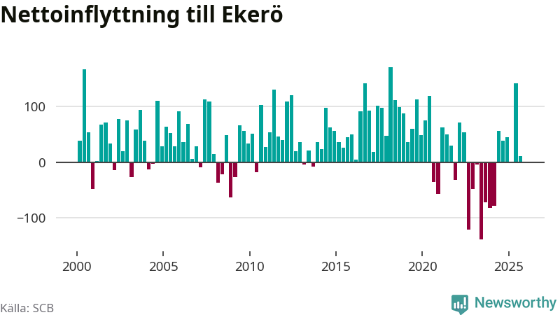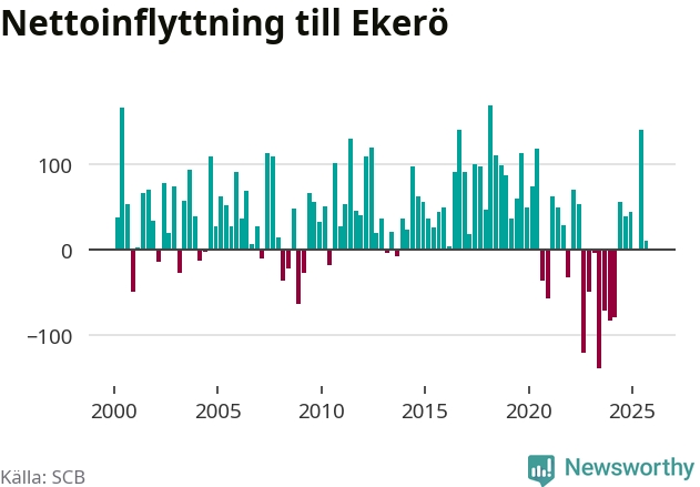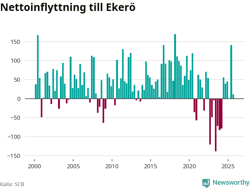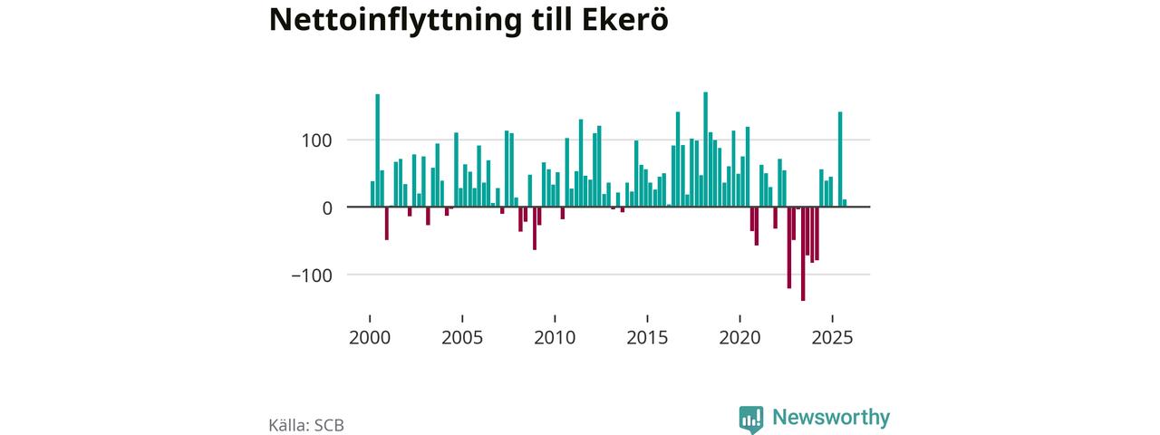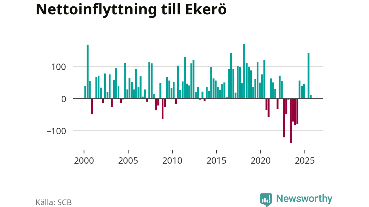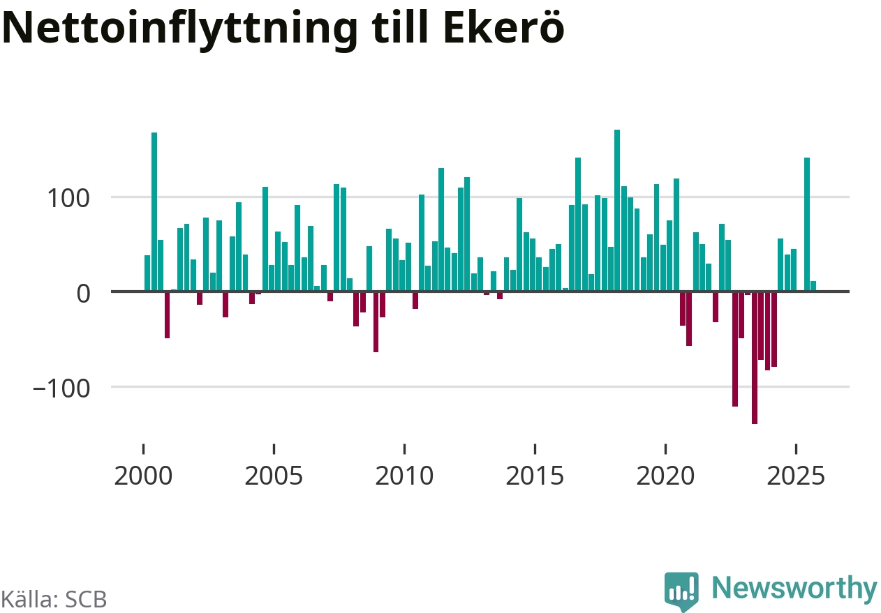 Under tredje kvartalet 2025 flyttade 497 personer till kommunen medan 486 personer flyttade därifrån. Det är historiskt sett en stor utflyttning under ett kvartal. Sedan seklets början har Ekerö oftast haft ett positivt flyttnetto, inklusive det senaste kvartalet.