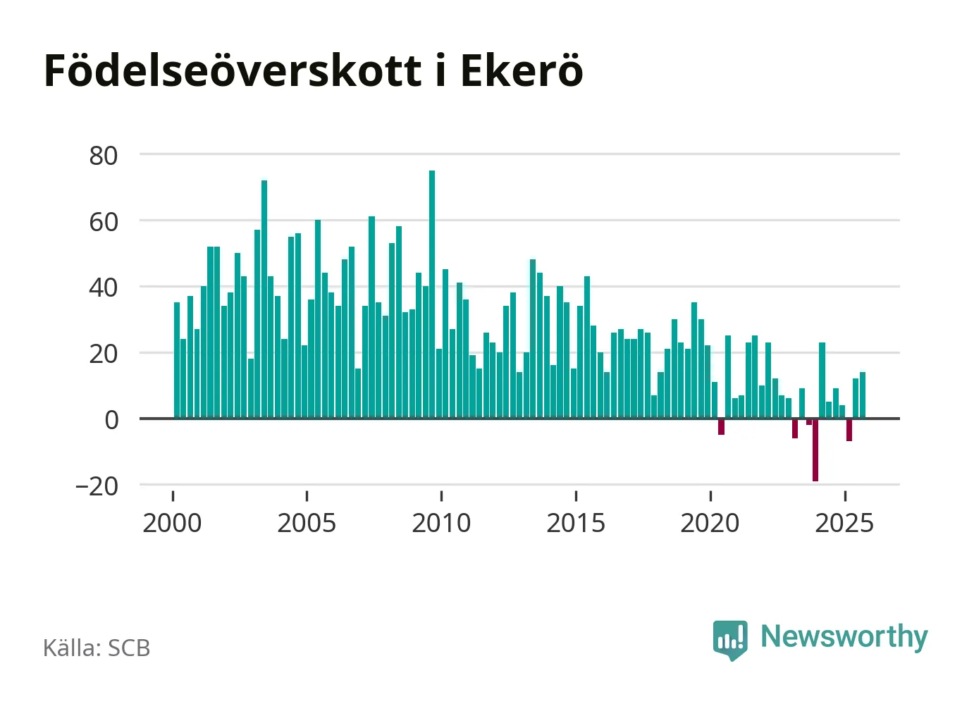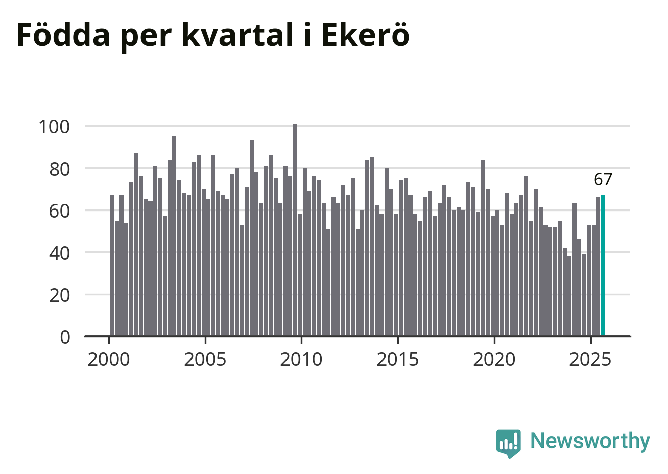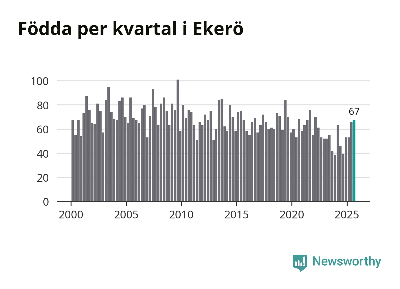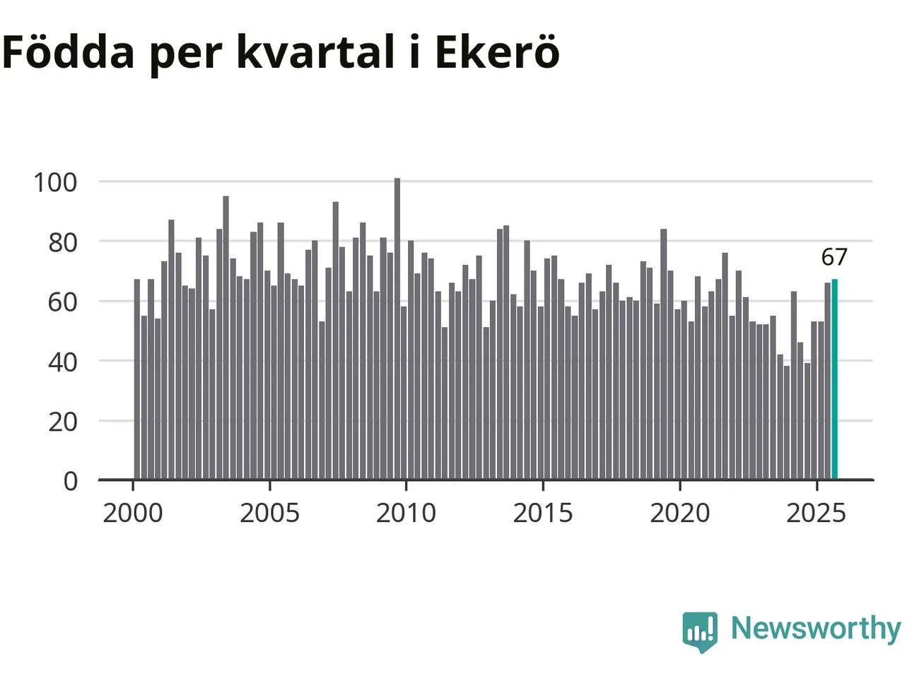 Enligt SCB:s siffror föddes 67 barn i Ekerö under det senaste kvartalet. Samtidigt avled 53 personer. Ekerö hade alltså ett positivt födelsenetto, vilket kommunen historiskt sett nästan alltid har haft.