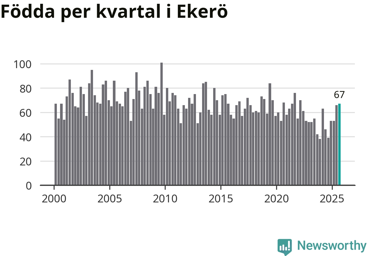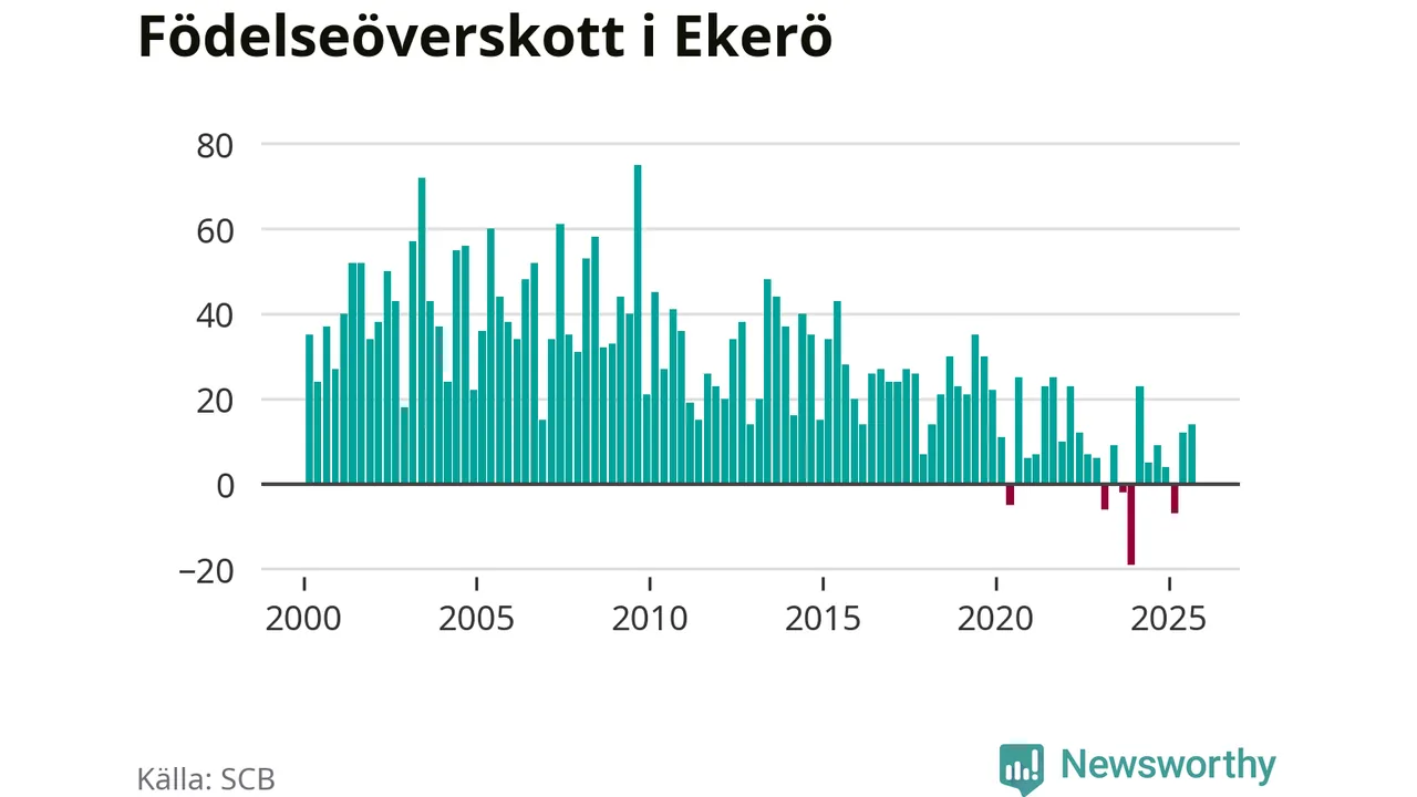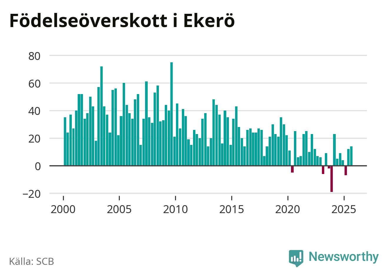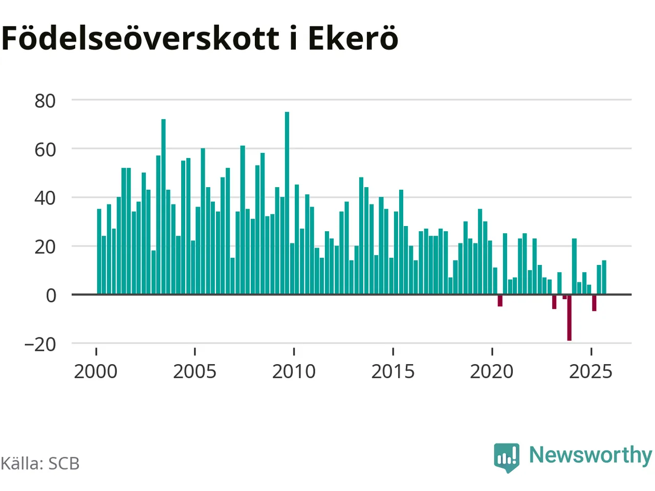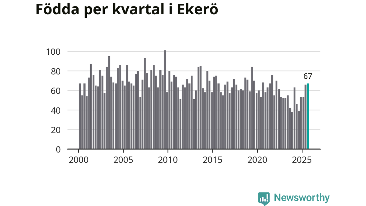 Enligt SCB:s siffror föddes 67 barn i Ekerö under det senaste kvartalet. Samtidigt avled 53 personer. Ekerö hade alltså ett positivt födelsenetto, vilket kommunen historiskt sett nästan alltid har haft.