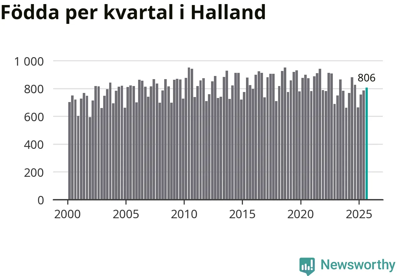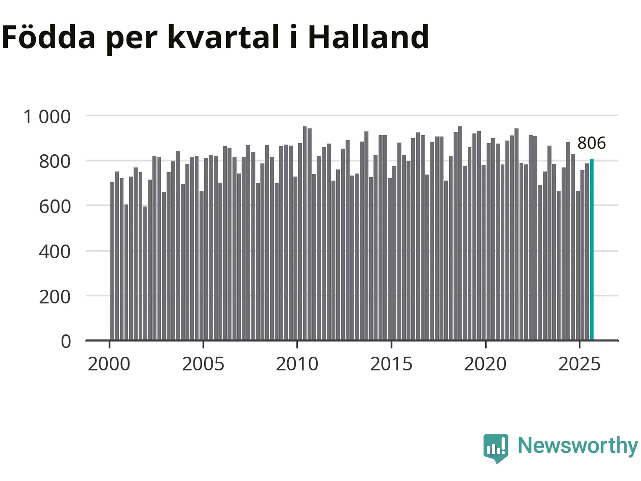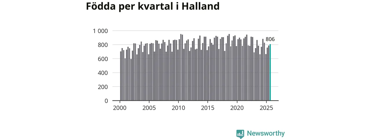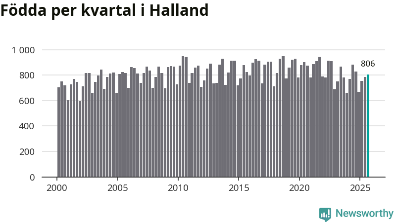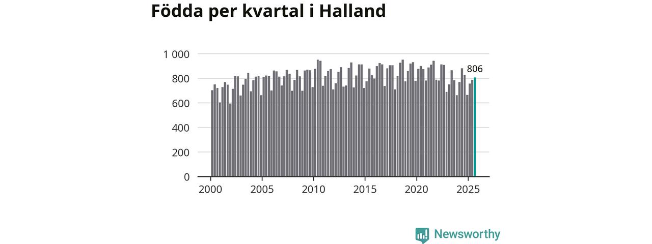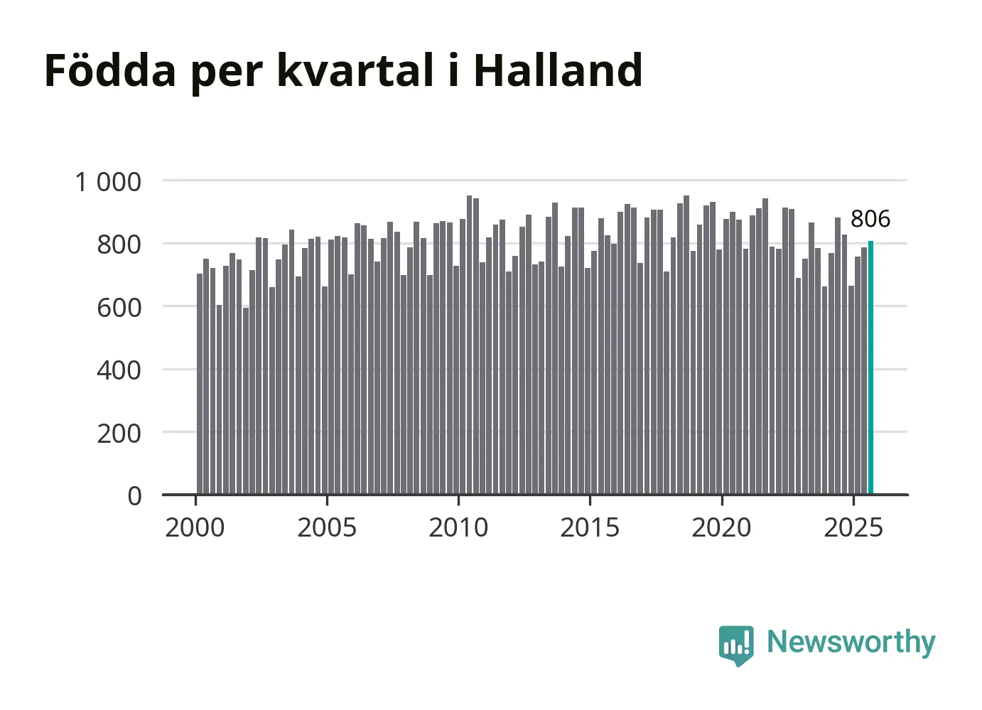 Enligt SCB:s siffror föddes 806 barn i Halland under det senaste kvartalet. Samtidigt avled 780 personer. Halland hade alltså ett positivt födelsenetto, vilket länet historiskt sett oftast har haft.