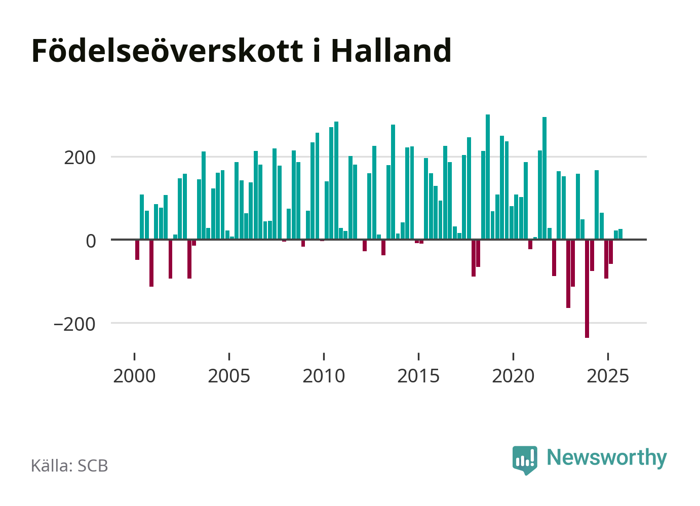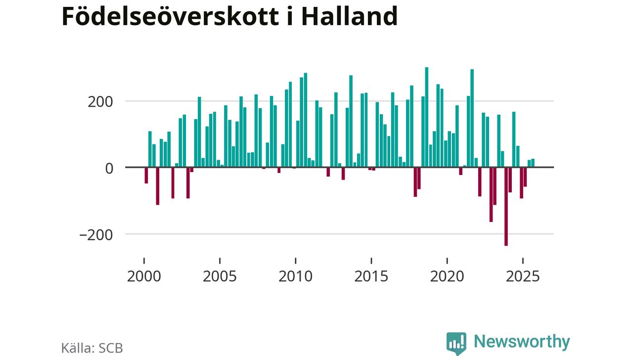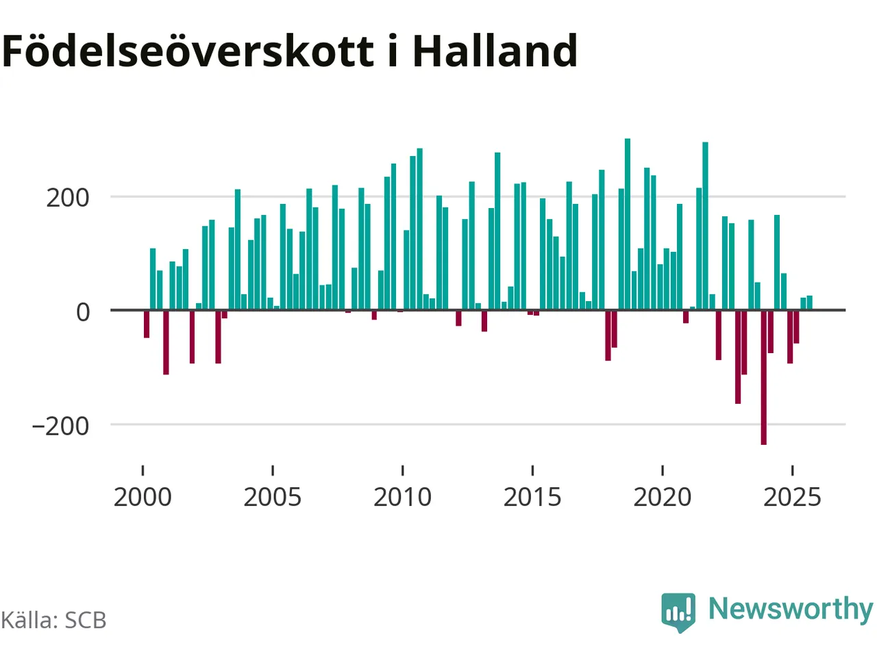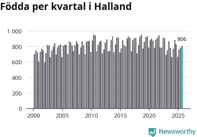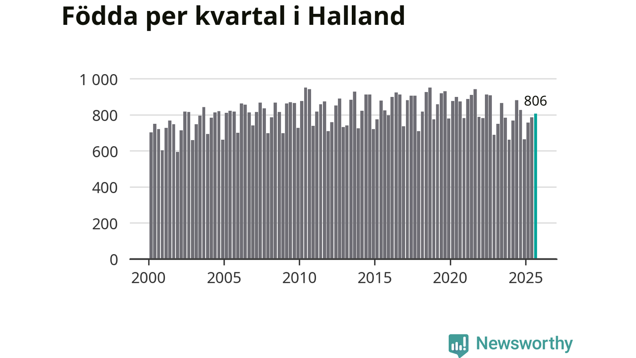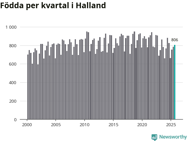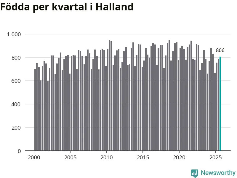 Enligt SCB:s siffror föddes 806 barn i Halland under det senaste kvartalet. Samtidigt avled 780 personer. Halland hade alltså ett positivt födelsenetto, vilket länet historiskt sett oftast har haft.