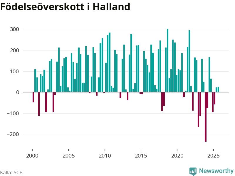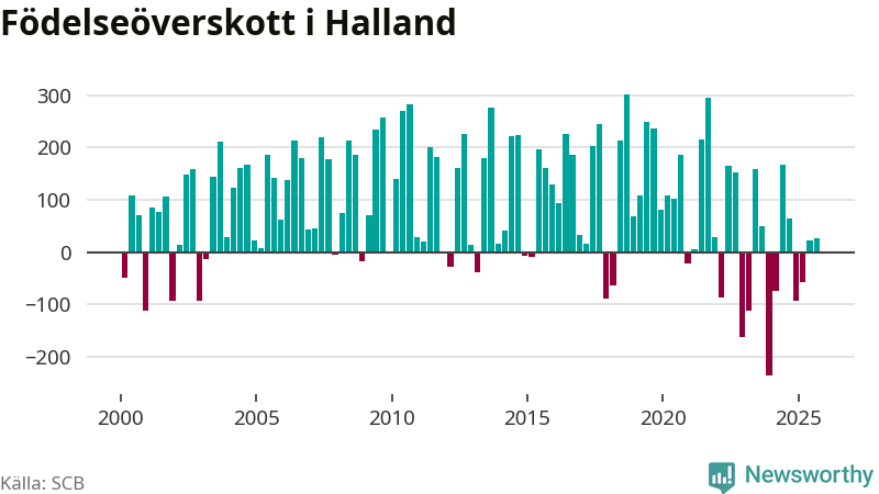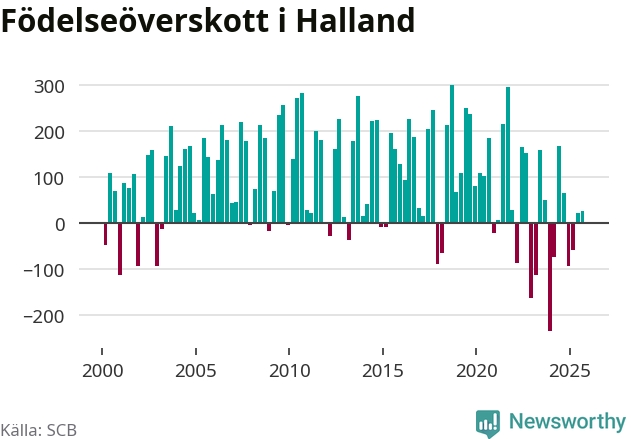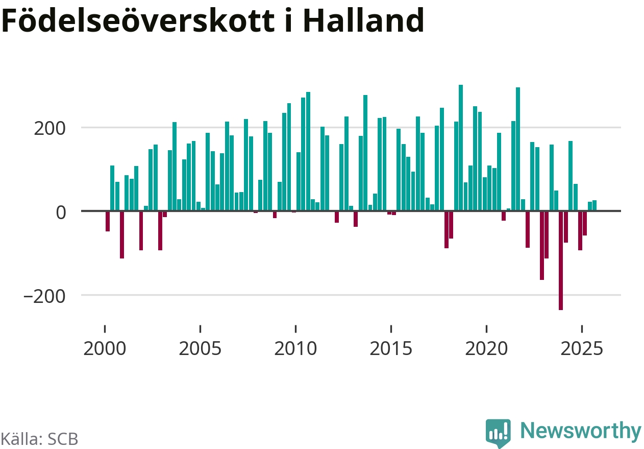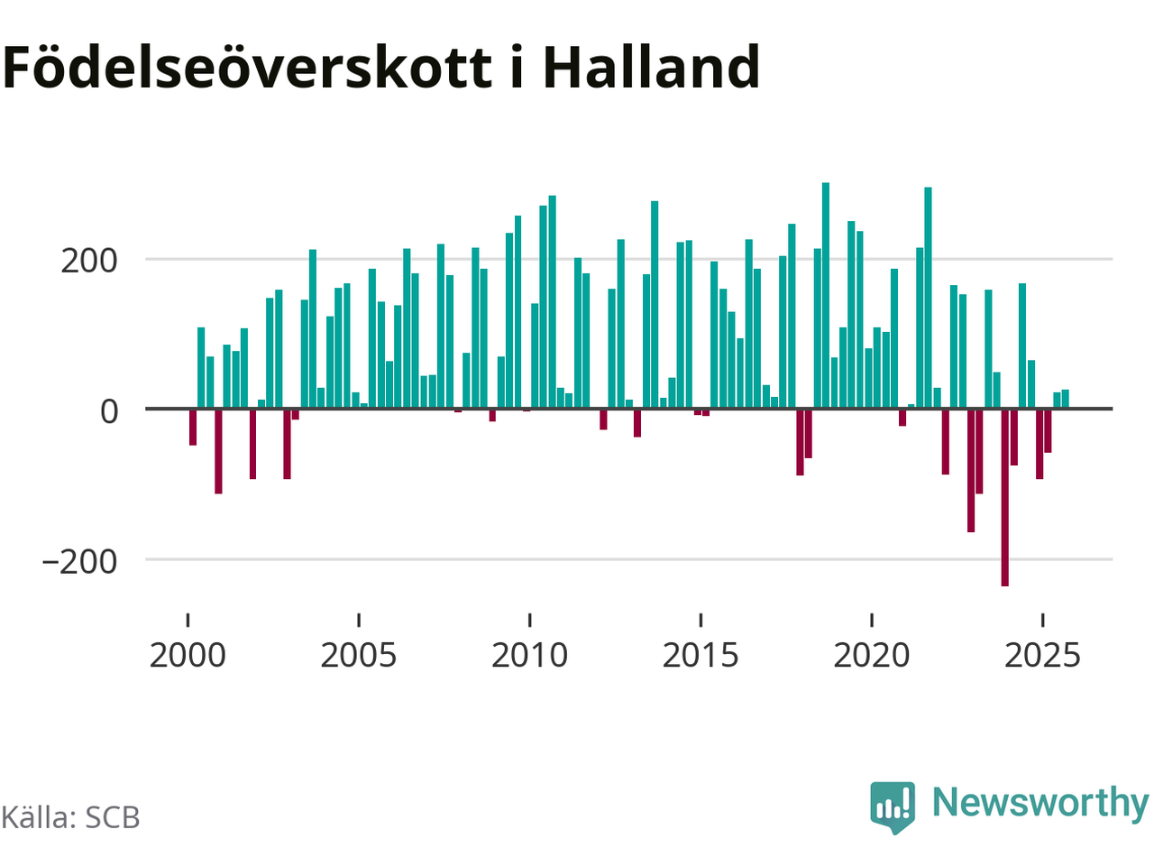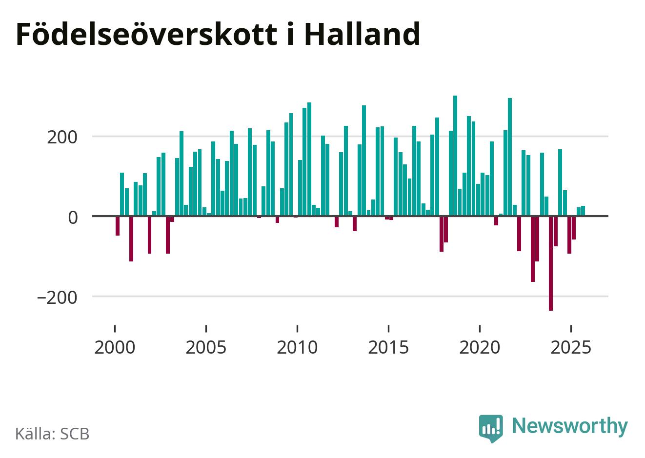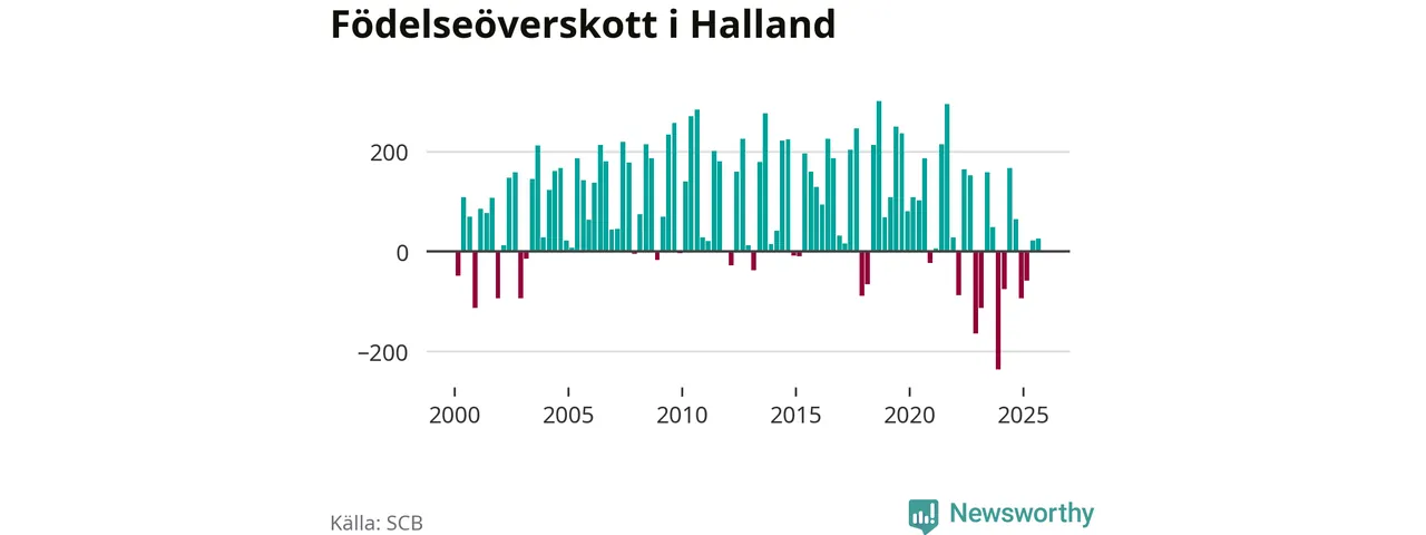 Enligt SCB:s siffror föddes 806 barn i Halland under det senaste kvartalet. Samtidigt avled 780 personer. Halland hade alltså ett positivt födelsenetto, vilket länet historiskt sett oftast har haft.