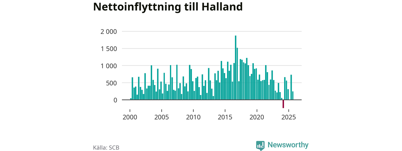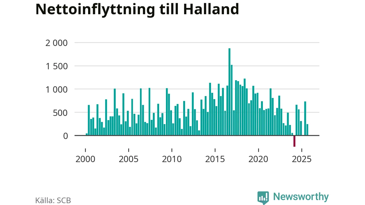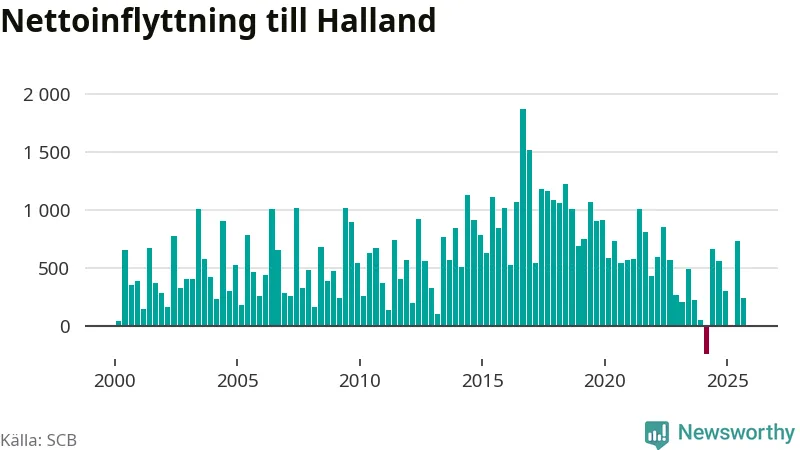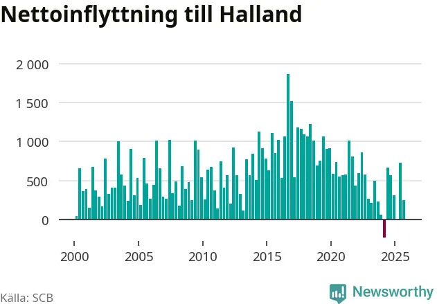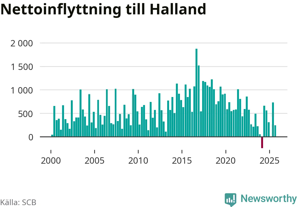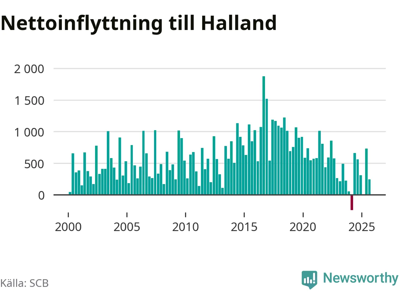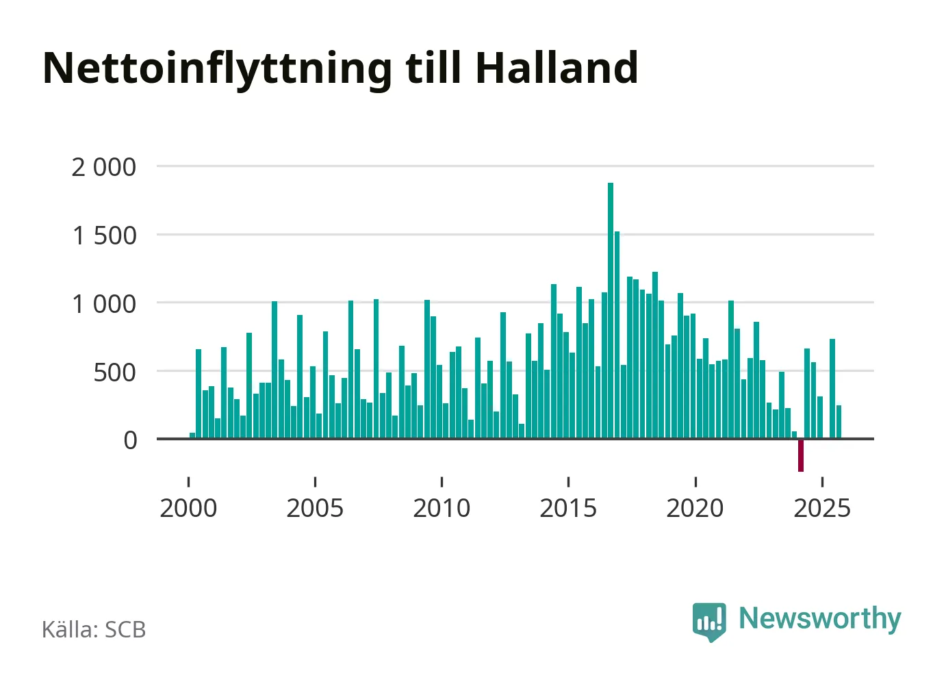 Under tredje kvartalet 2025 flyttade 3 946 personer till länet medan 3 702 personer flyttade därifrån. Det är historiskt sett en stor utflyttning under ett kvartal. Sedan seklets början har Halland haft ett positivt flyttnetto under nästan alla kvartal, inklusive det senaste kvartalet.
