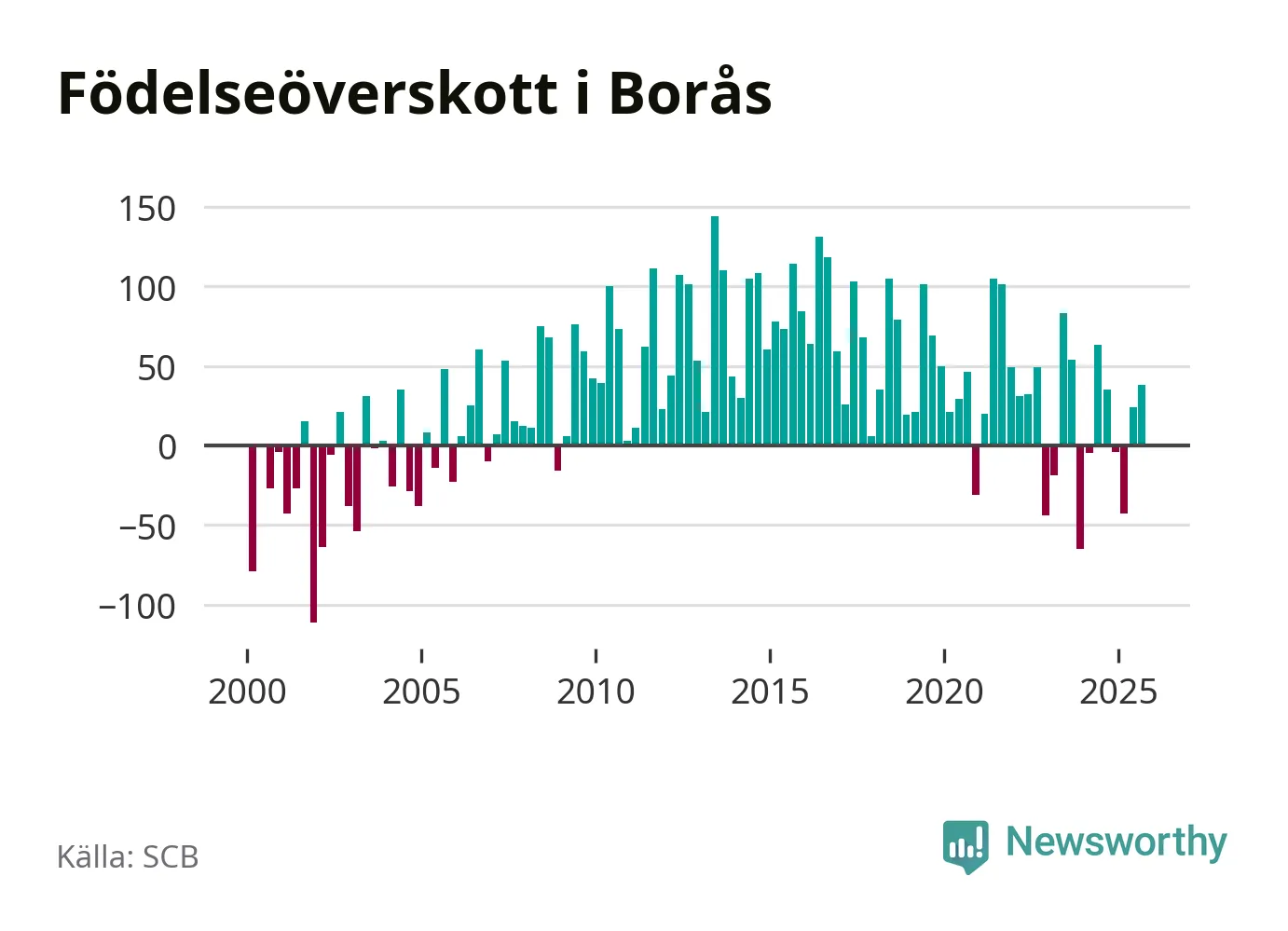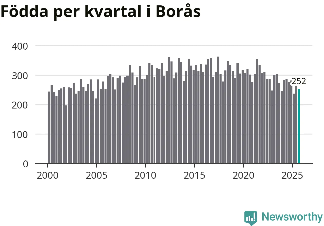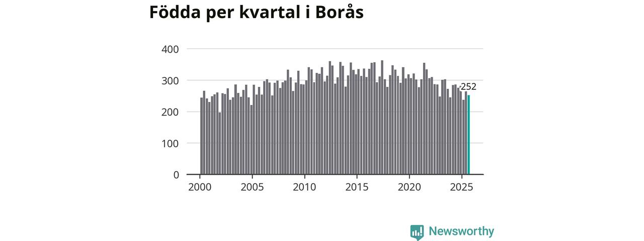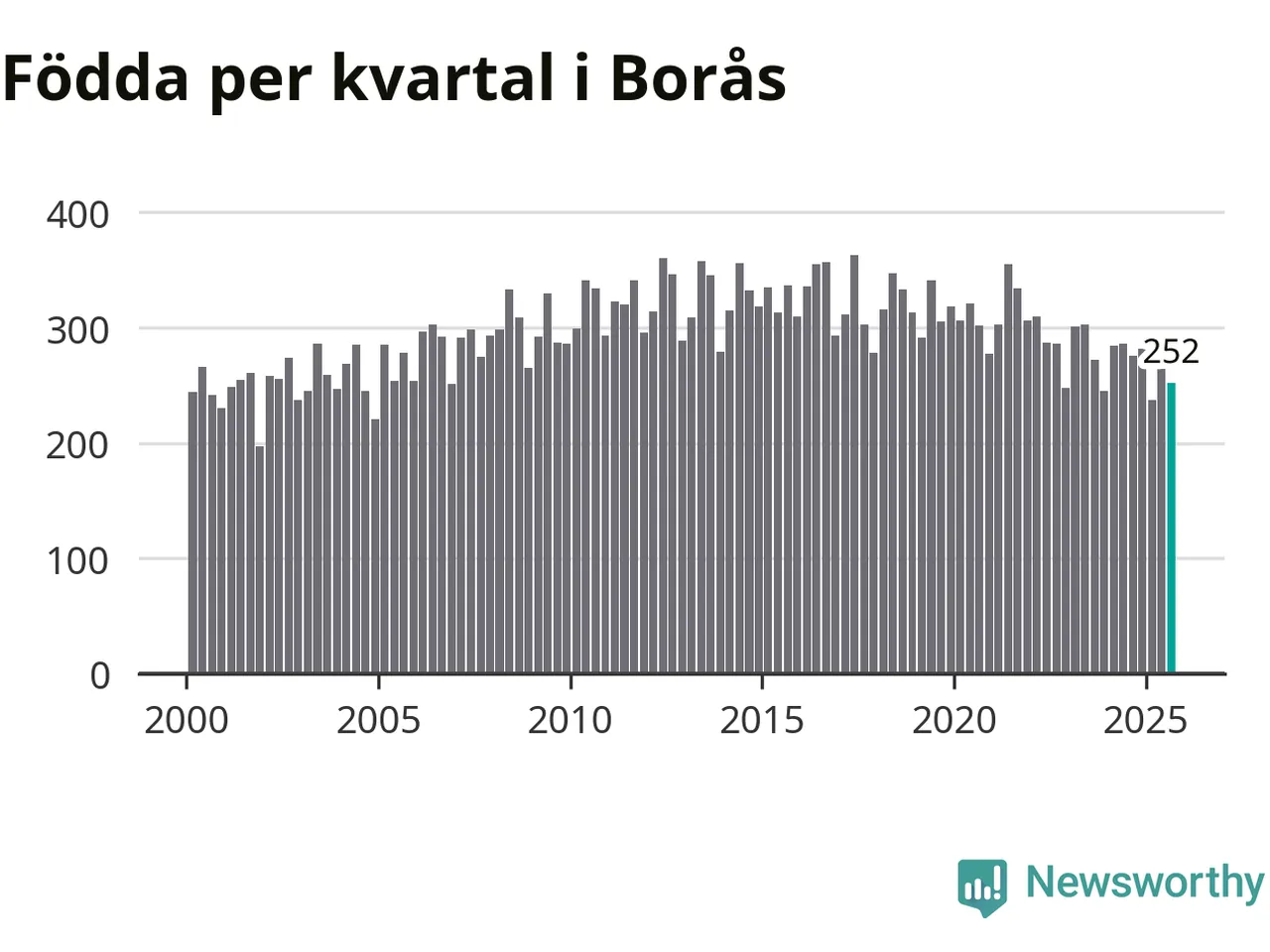 Enligt SCB:s siffror föddes 252 barn i Borås under det senaste kvartalet. Samtidigt avled relativt få – 214 personer. Borås hade alltså ett positivt födelsenetto, vilket kommunen historiskt sett nästan alltid har haft.