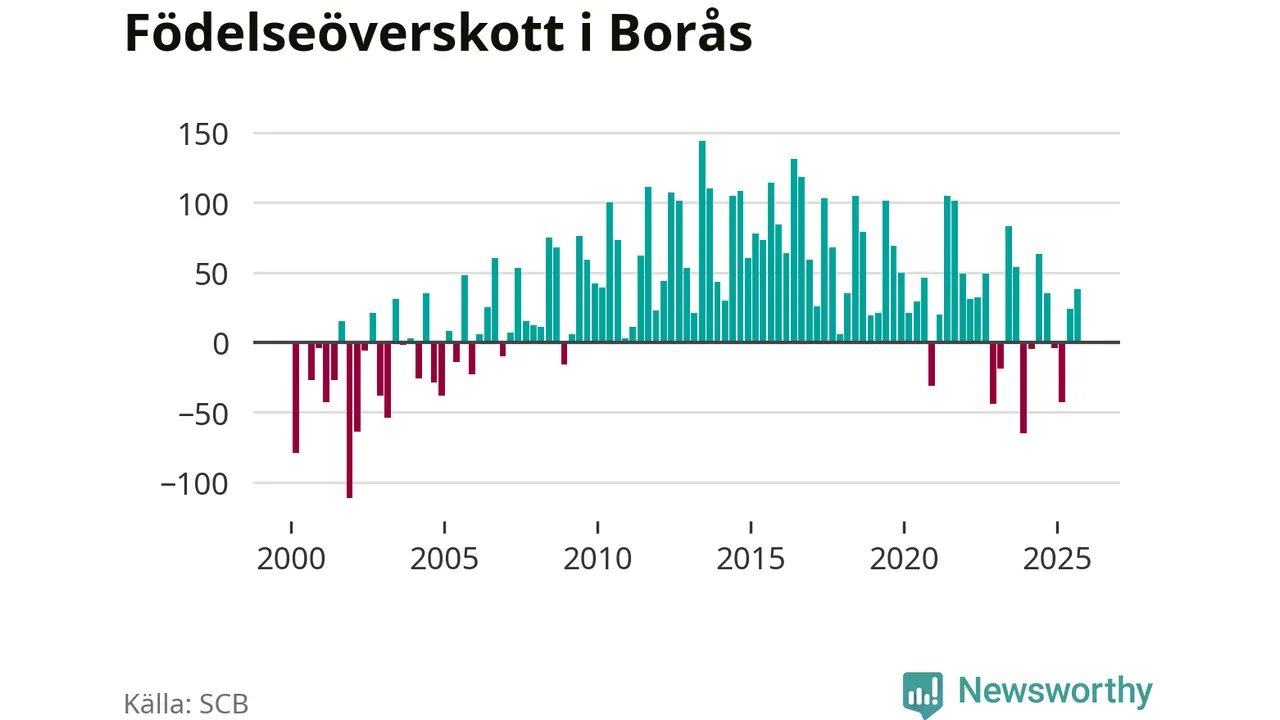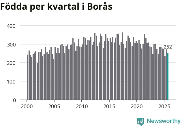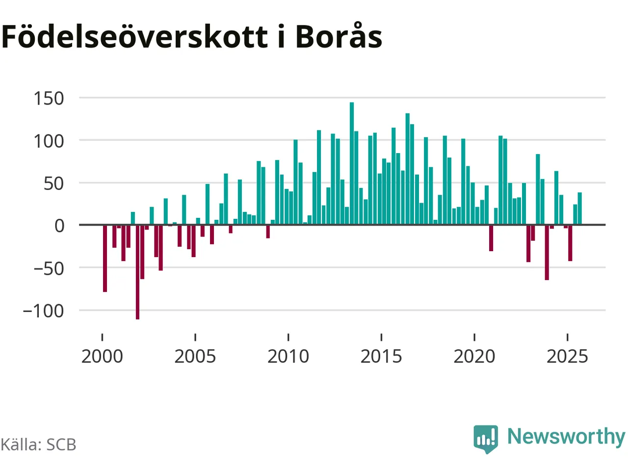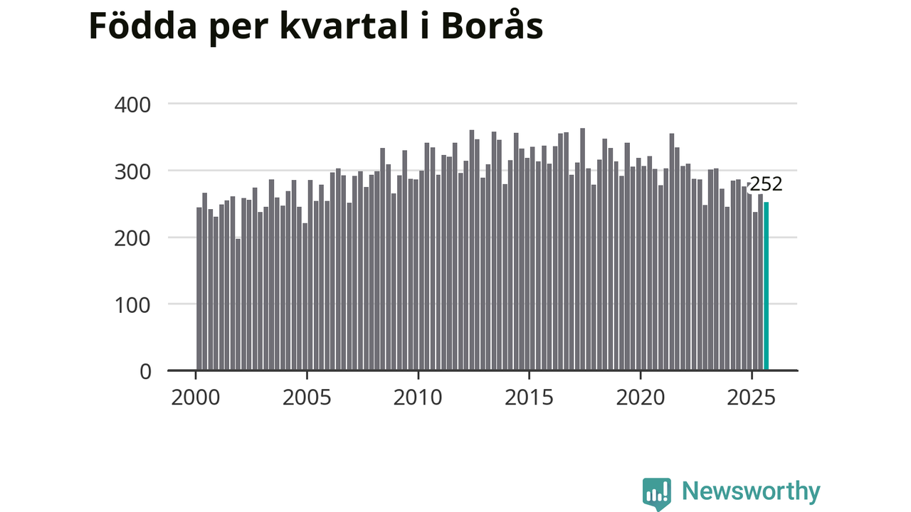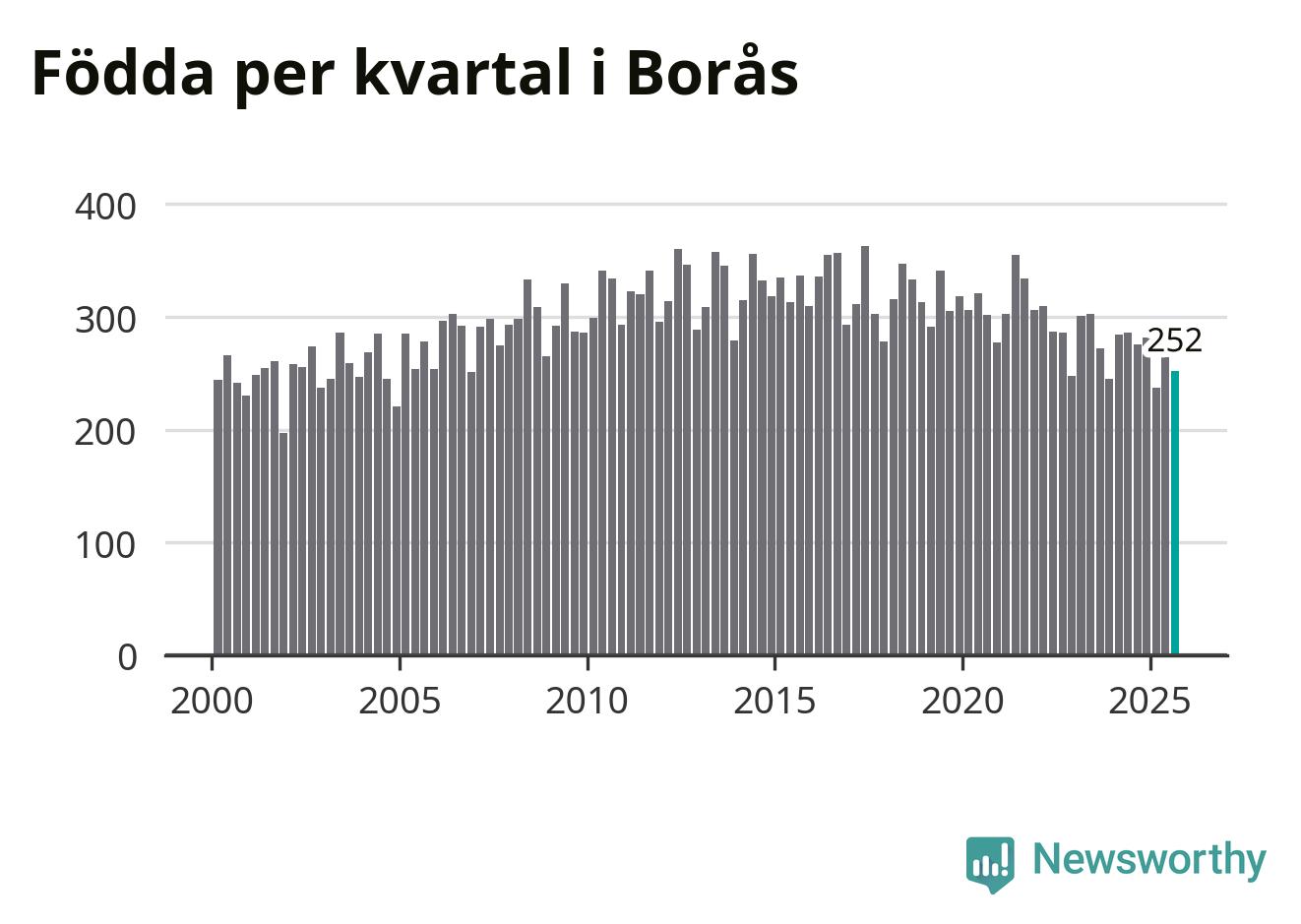 Enligt SCB:s siffror föddes 252 barn i Borås under det senaste kvartalet. Samtidigt avled relativt få – 214 personer. Borås hade alltså ett positivt födelsenetto, vilket kommunen historiskt sett nästan alltid har haft.