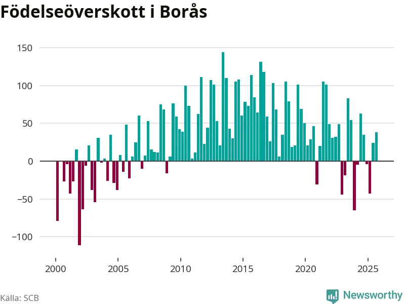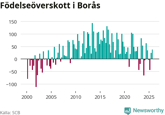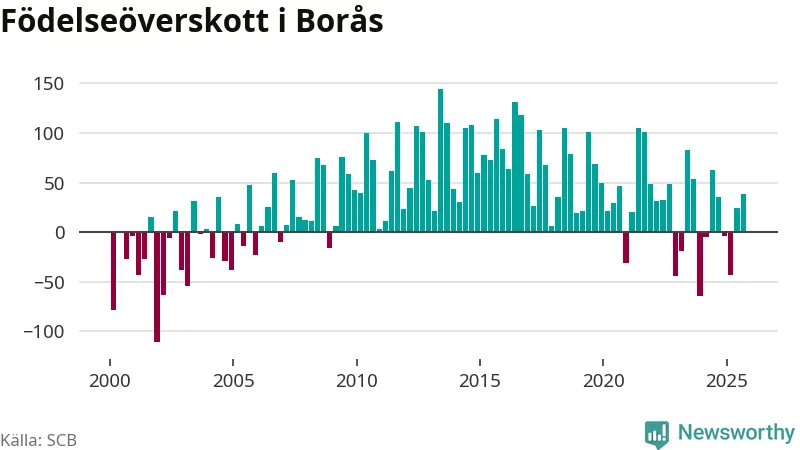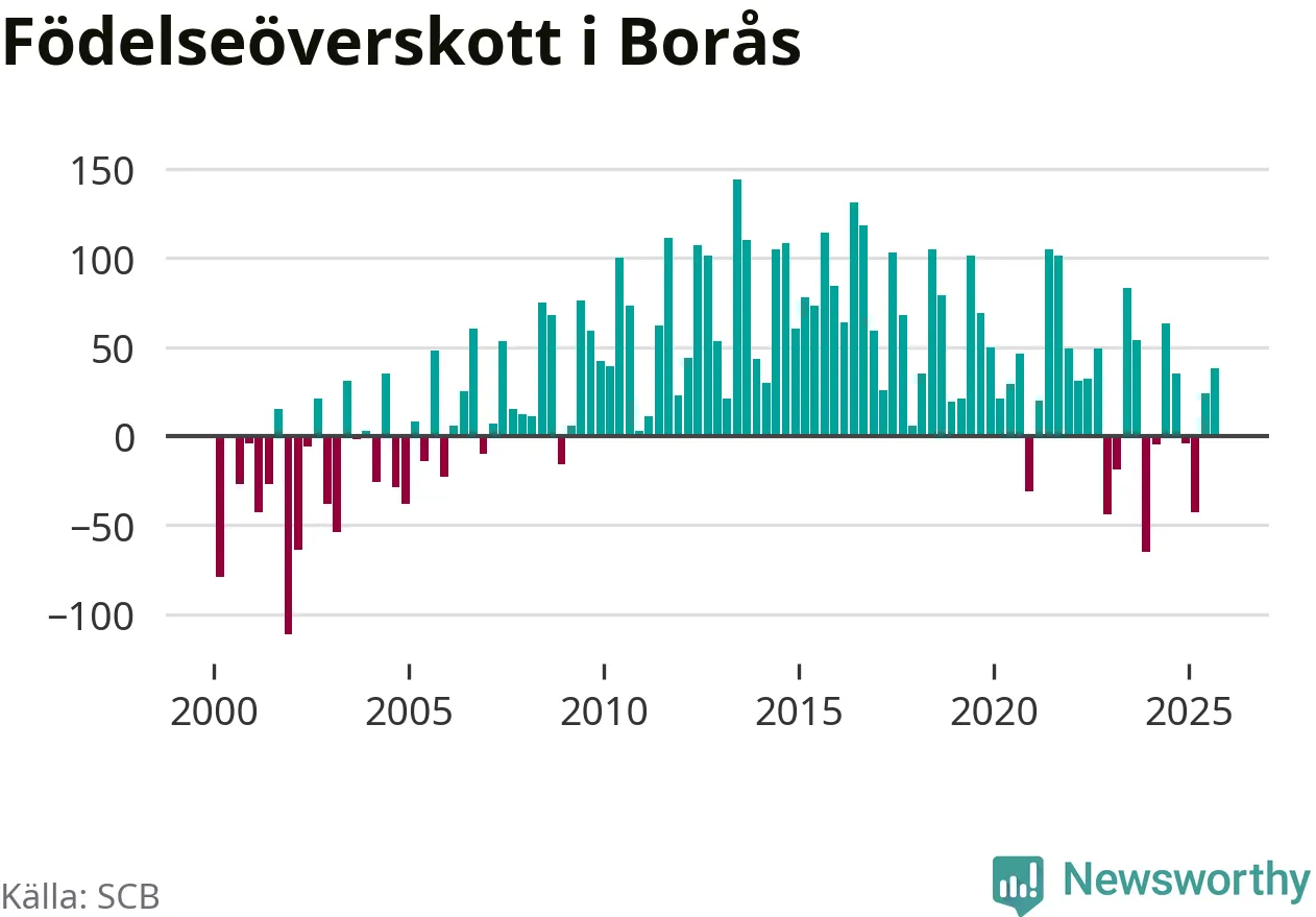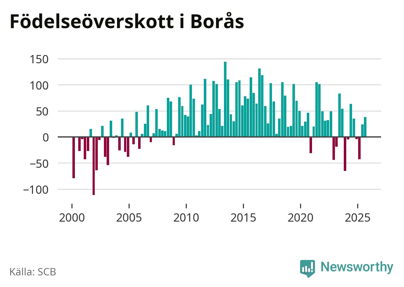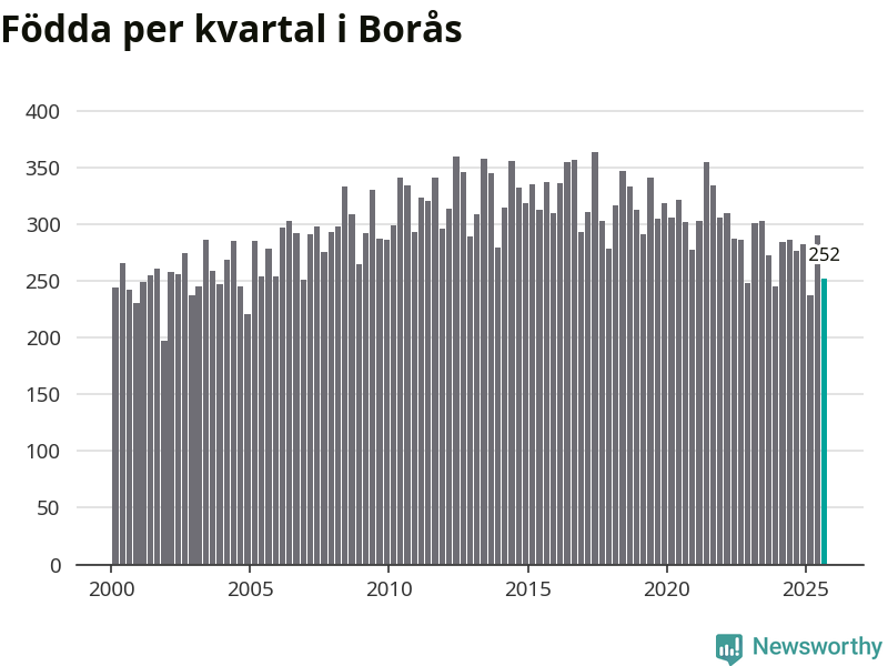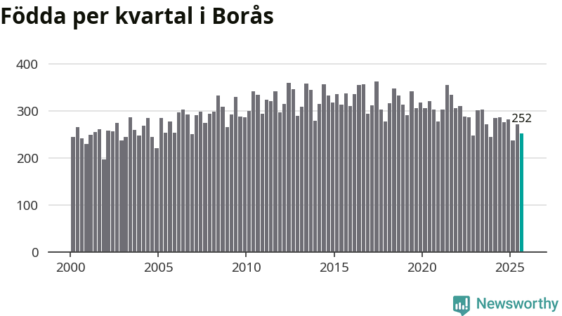 Enligt SCB:s siffror föddes 252 barn i Borås under det senaste kvartalet. Samtidigt avled relativt få – 214 personer. Borås hade alltså ett positivt födelsenetto, vilket kommunen historiskt sett nästan alltid har haft.