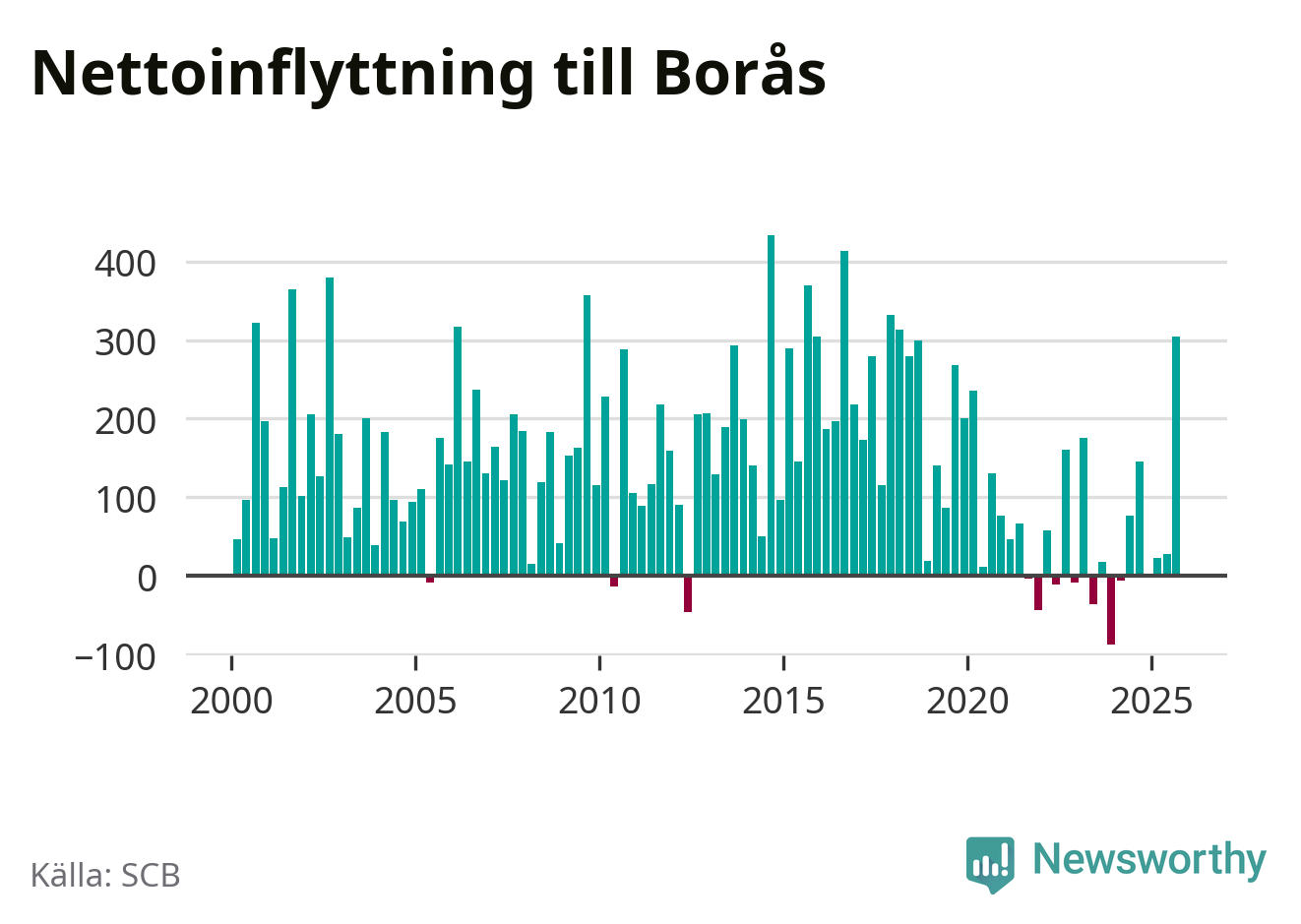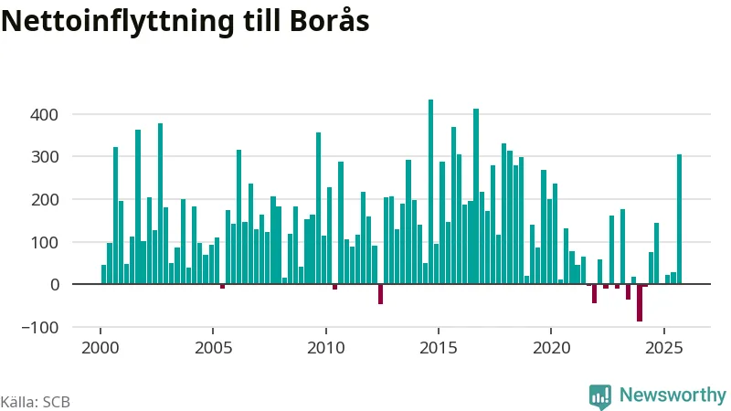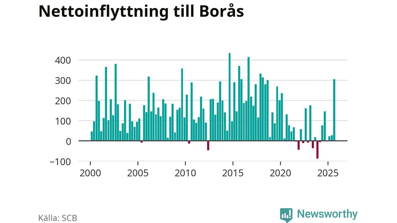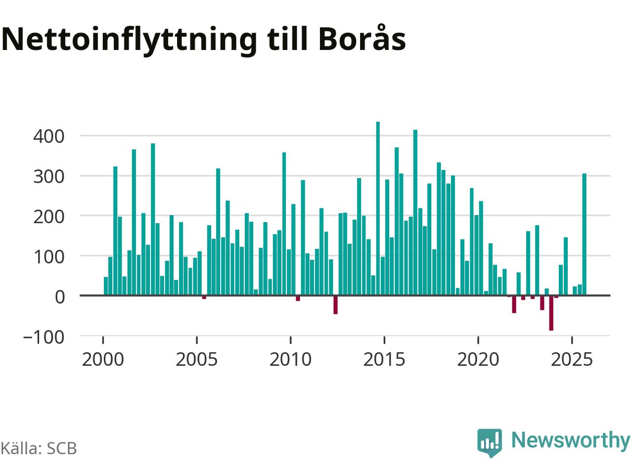 Under tredje kvartalet 2025 flyttade 1 809 personer till kommunen medan 1 504 personer flyttade därifrån. Det är historiskt sett en stor inflyttning under ett kvartal – men samtidigt var utflyttningen relativt stor. Sedan seklets början har Borås haft ett positivt flyttnetto under nästan alla kvartal, inklusive det senaste kvartalet.