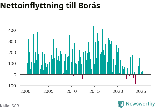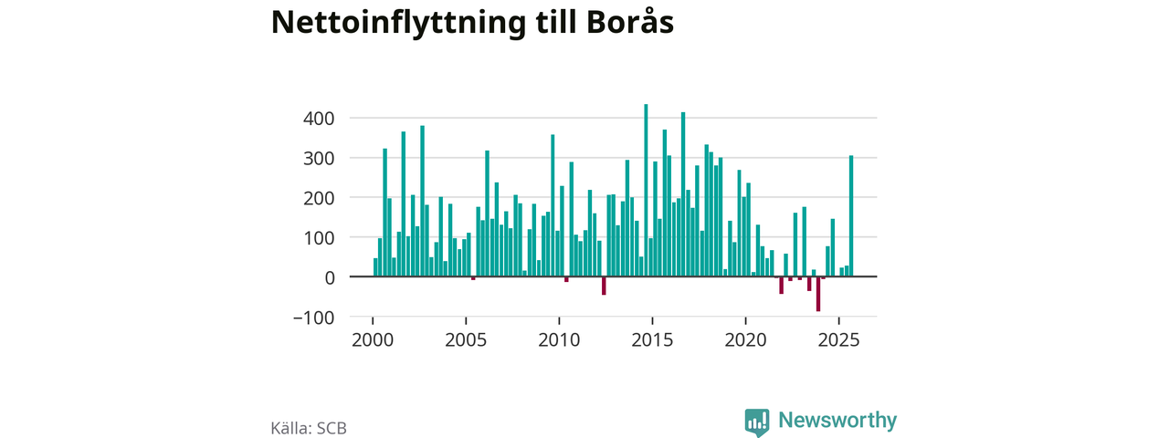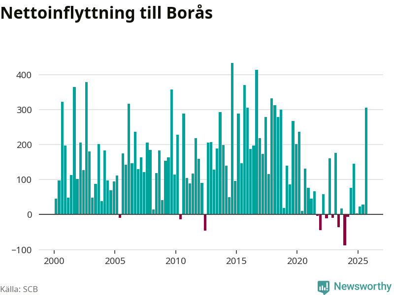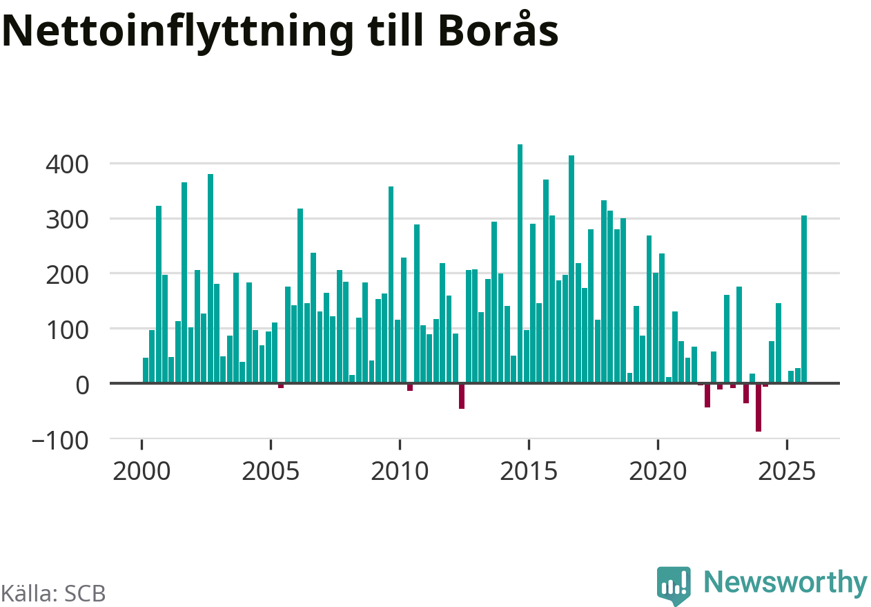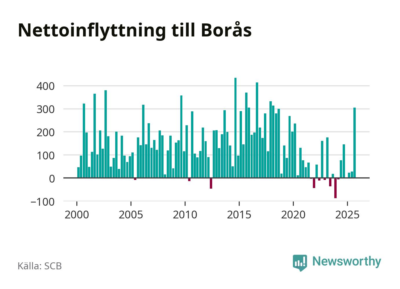 Under tredje kvartalet 2025 flyttade 1 809 personer till kommunen medan 1 504 personer flyttade därifrån. Det är historiskt sett en stor inflyttning under ett kvartal – men samtidigt var utflyttningen relativt stor. Sedan seklets början har Borås haft ett positivt flyttnetto under nästan alla kvartal, inklusive det senaste kvartalet.