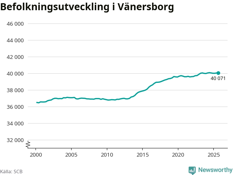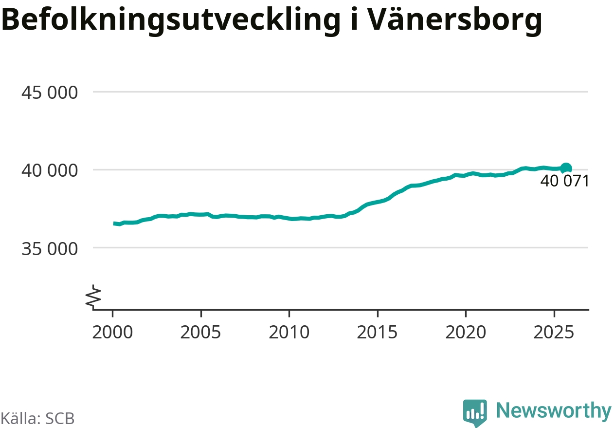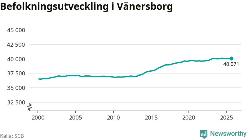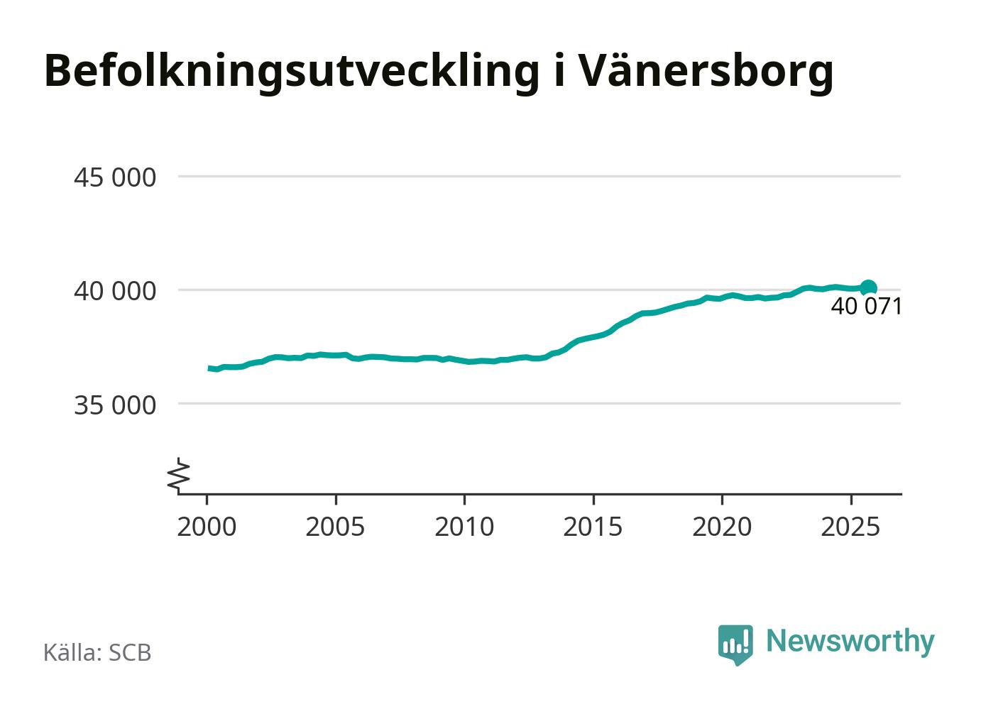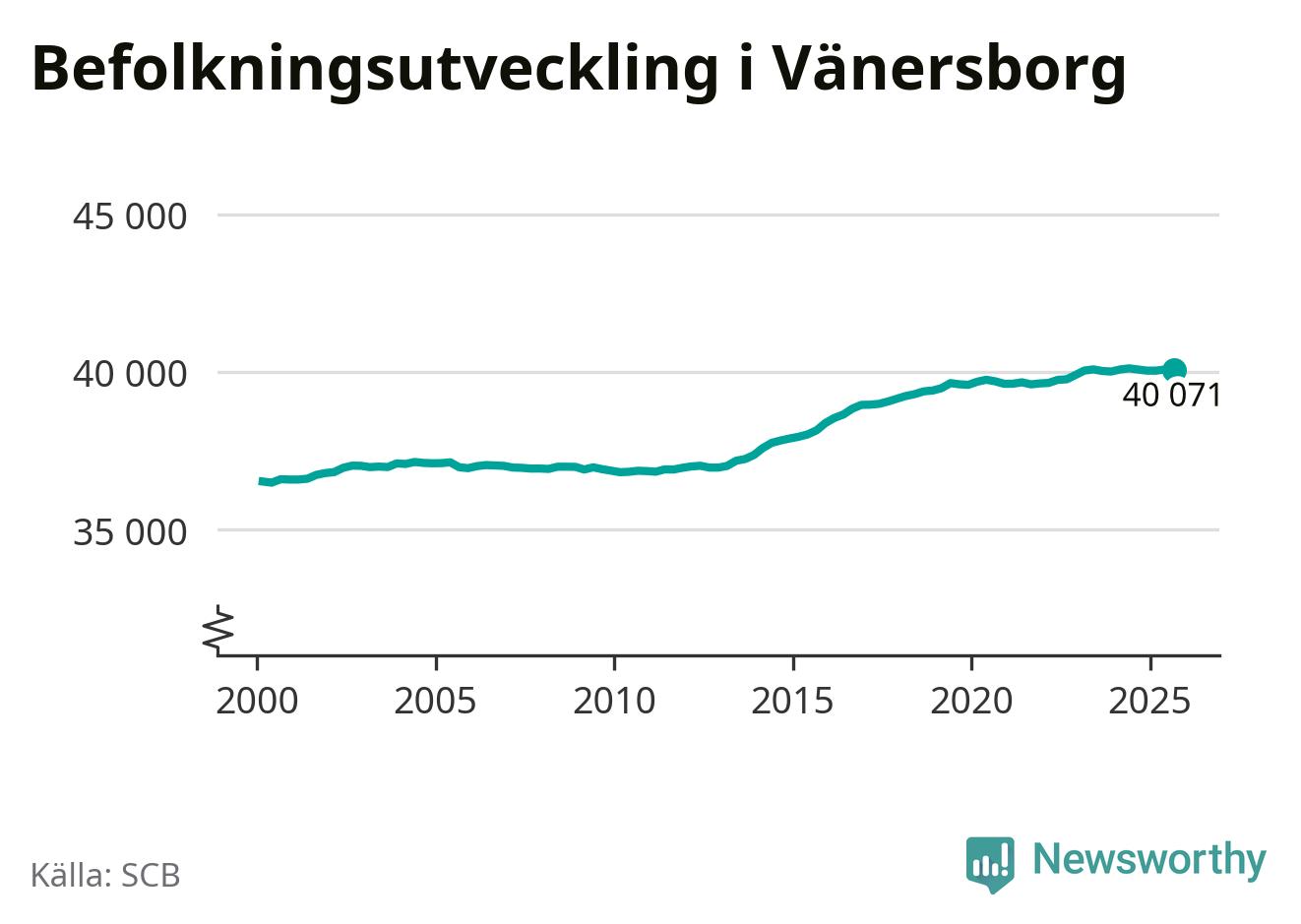 Jämfört med ett år sedan är befolkningen i princip lika stor i Vänersborg. Sedan millennieskiftet har folkmängden ökat med runt 3 540 personer, eller 10 procent.