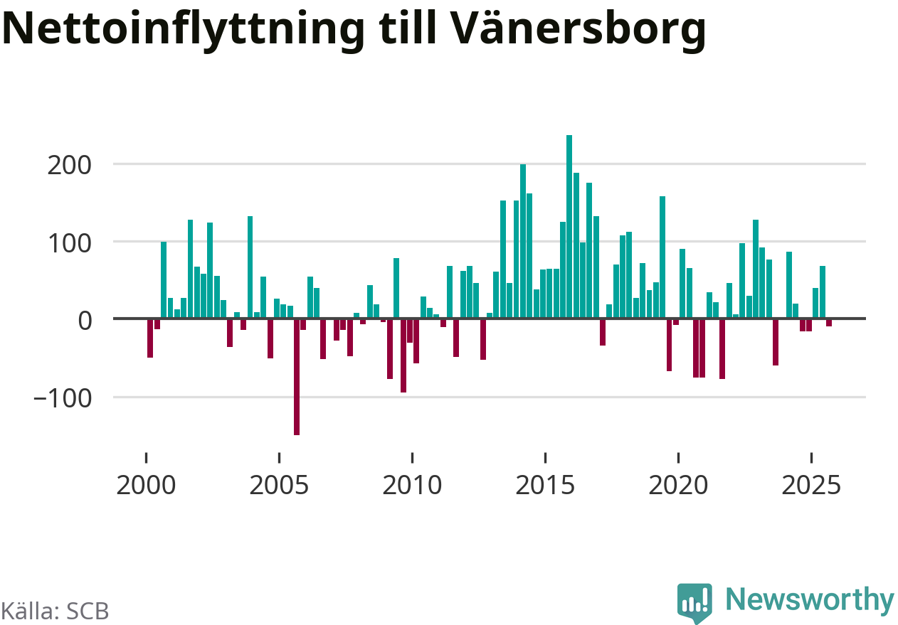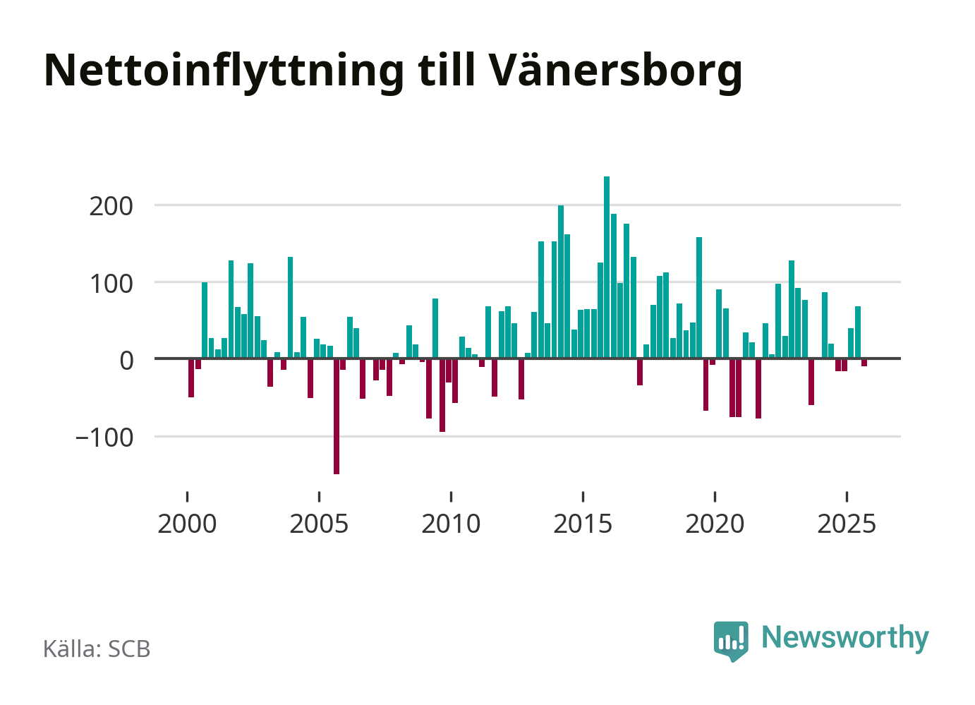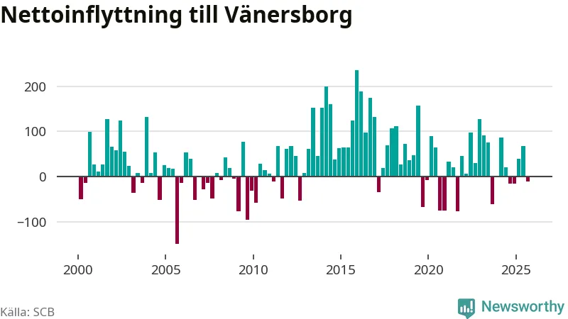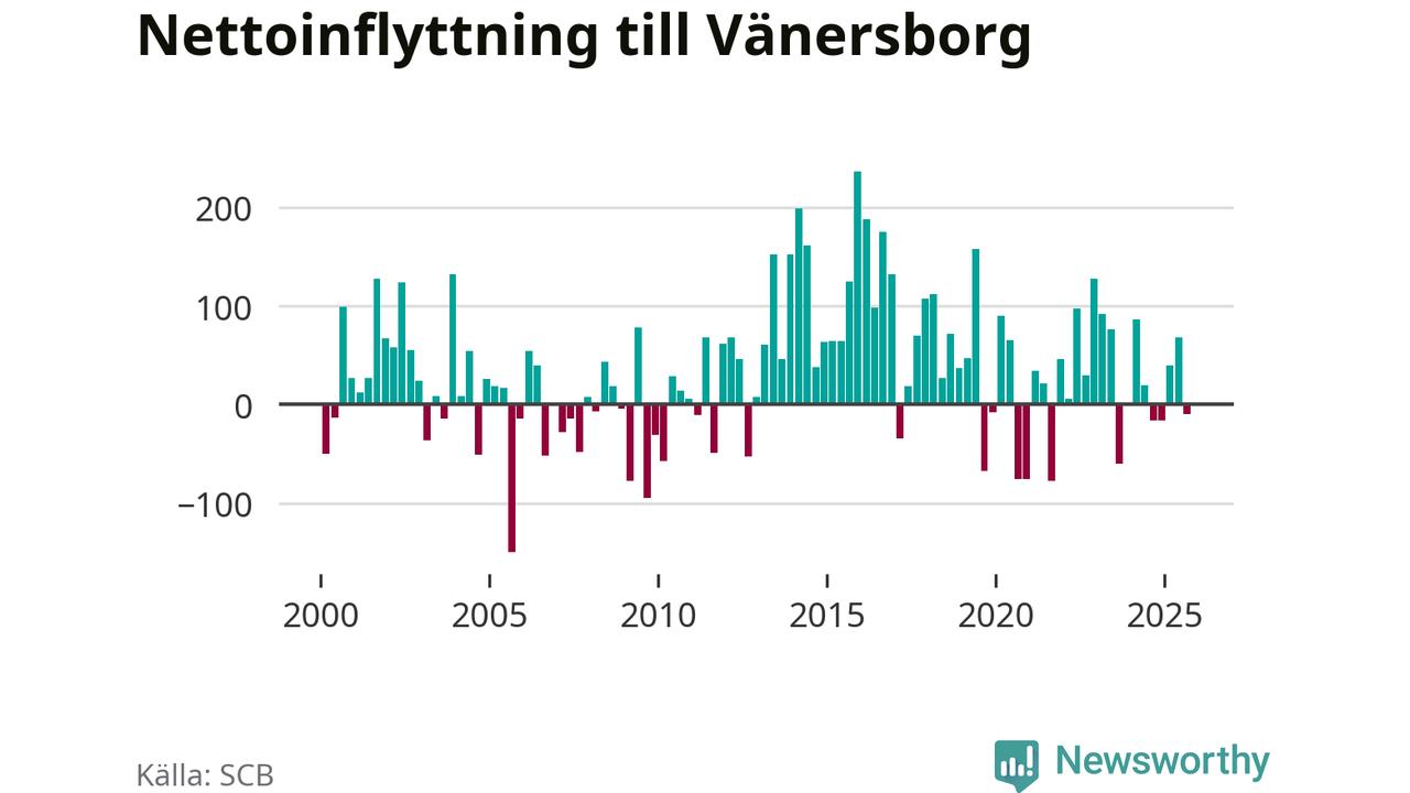 Under tredje kvartalet 2025 flyttade 604 personer till kommunen medan 614 personer flyttade därifrån. Det är historiskt sett en stor utflyttning under ett kvartal. Skillnaden mellan antalet in- och utflyttade är så liten att den lika gärna kan bero på SCB:s slumpmässiga brus. Sedan seklets början har Vänersborg oftast haft ett positivt flyttnetto.