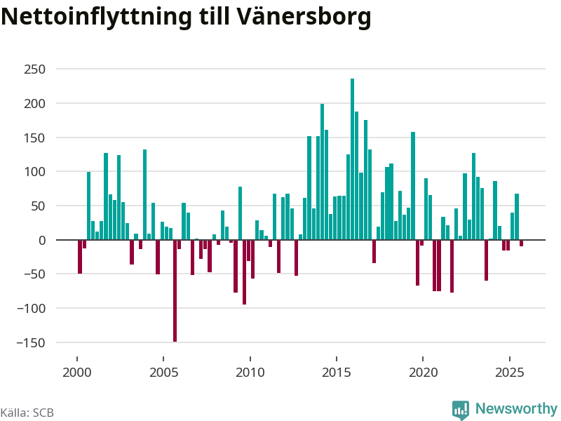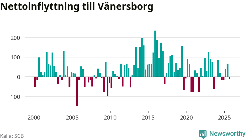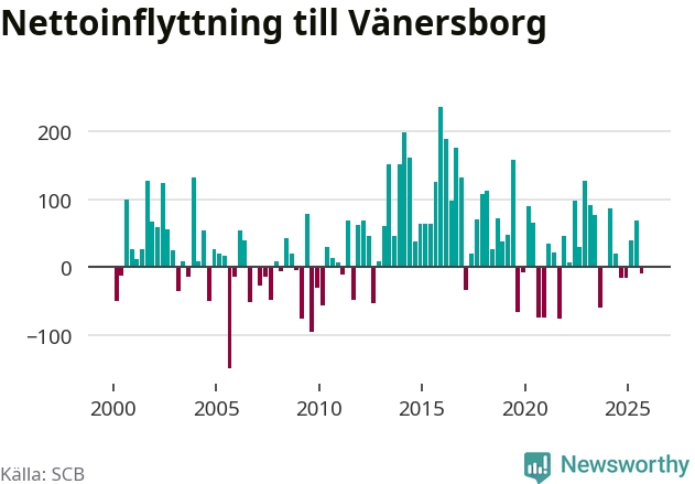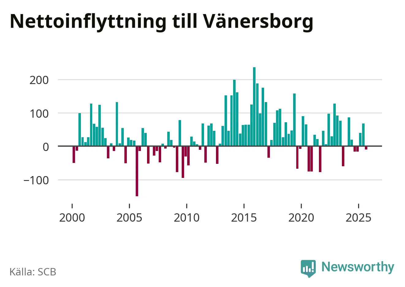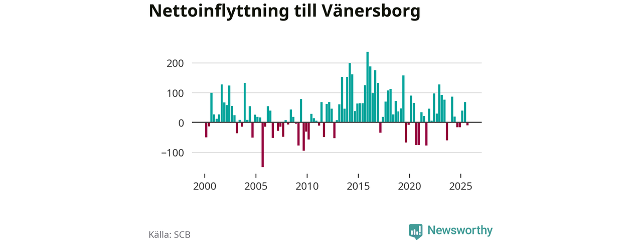 Under tredje kvartalet 2025 flyttade 604 personer till kommunen medan 614 personer flyttade därifrån. Det är historiskt sett en stor utflyttning under ett kvartal. Skillnaden mellan antalet in- och utflyttade är så liten att den lika gärna kan bero på SCB:s slumpmässiga brus. Sedan seklets början har Vänersborg oftast haft ett positivt flyttnetto.