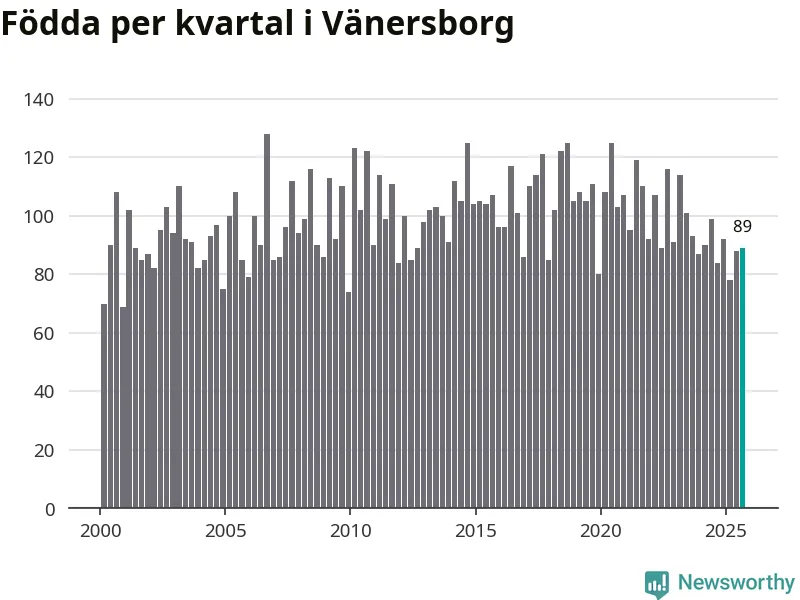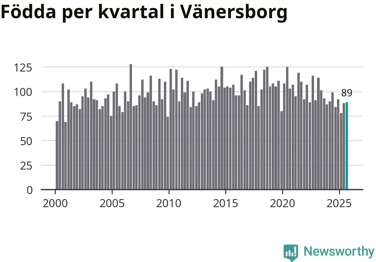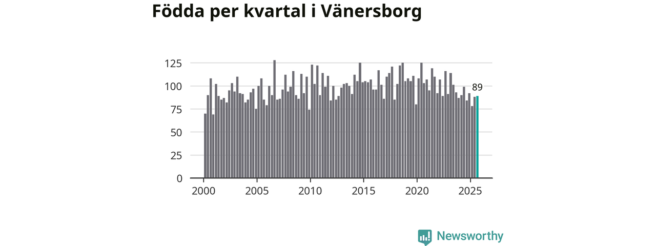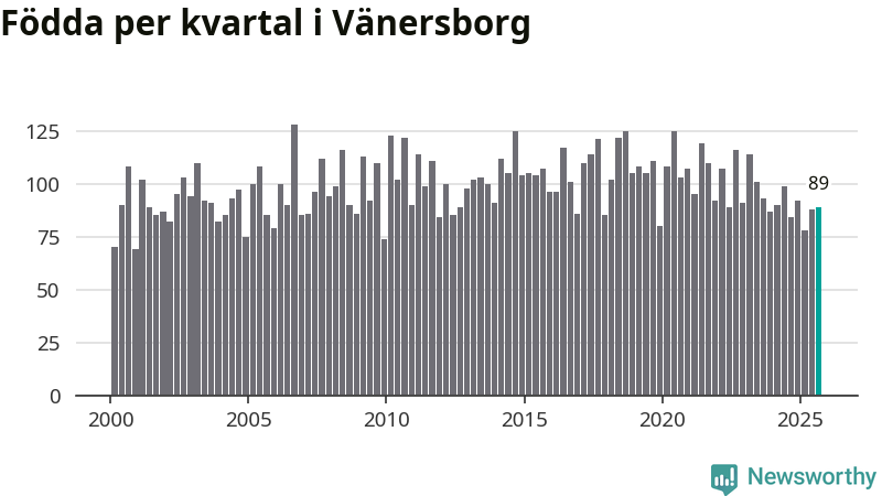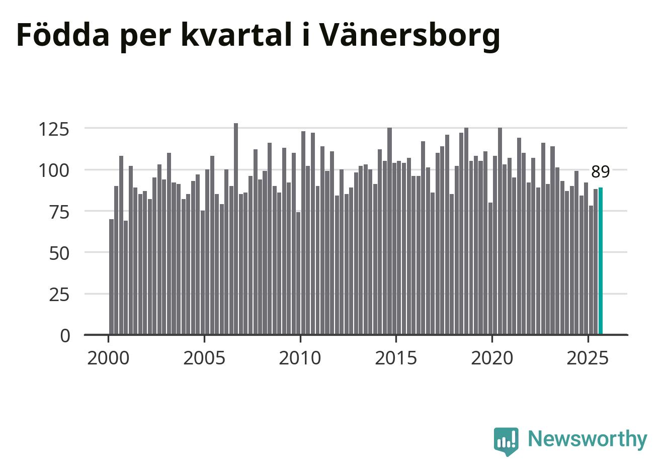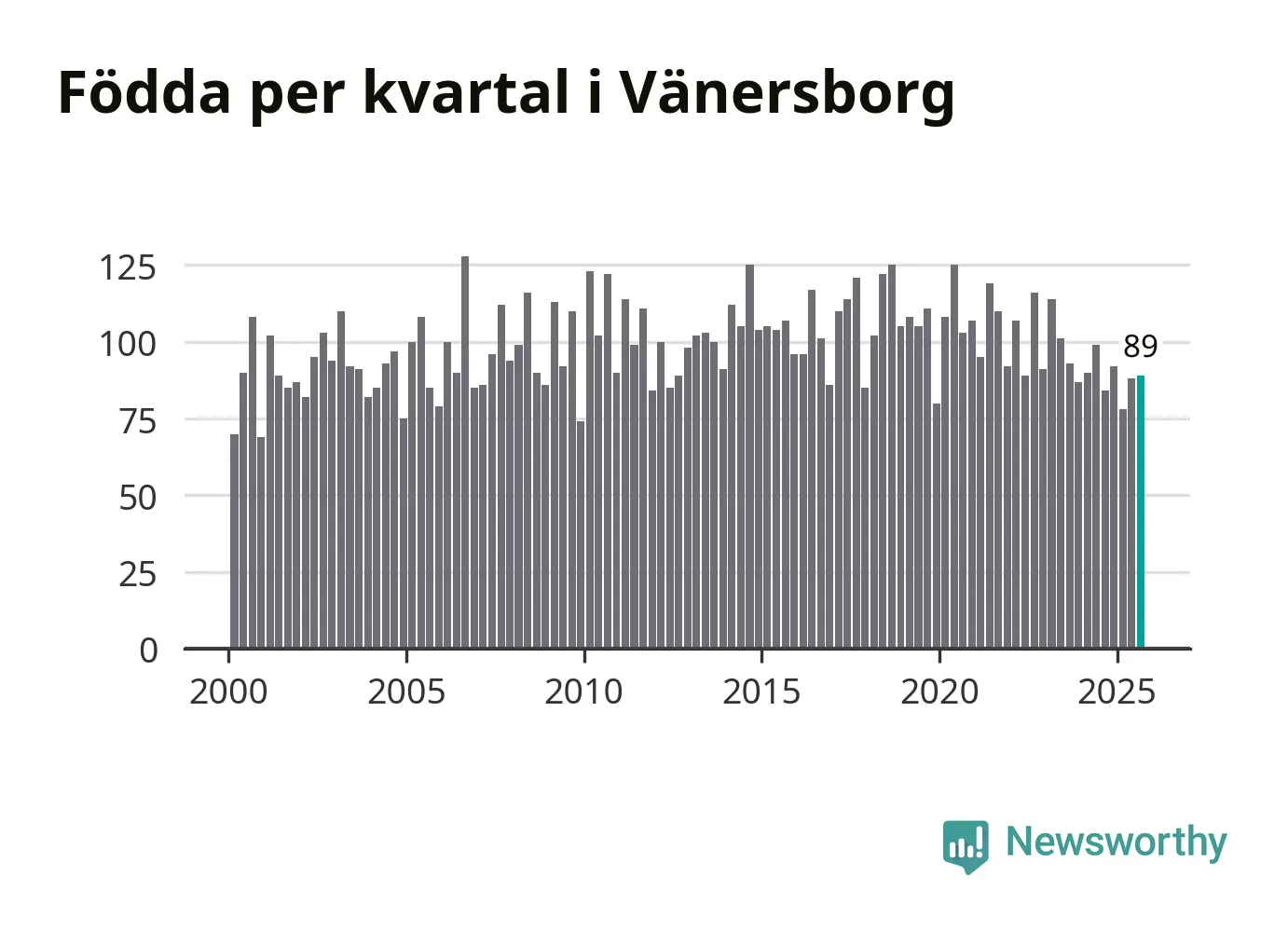 Enligt SCB:s siffror föddes 89 barn i Vänersborg under det senaste kvartalet. Samtidigt avled 90 personer. Skillnaden mellan antal födda och döda är så liten att det inte går att säga om det beror på något annat än SCB:s röjandeskydd. Kommunen har historiskt sett haft ungefär lika många kvartal med positivt födelsenetto som negativt.