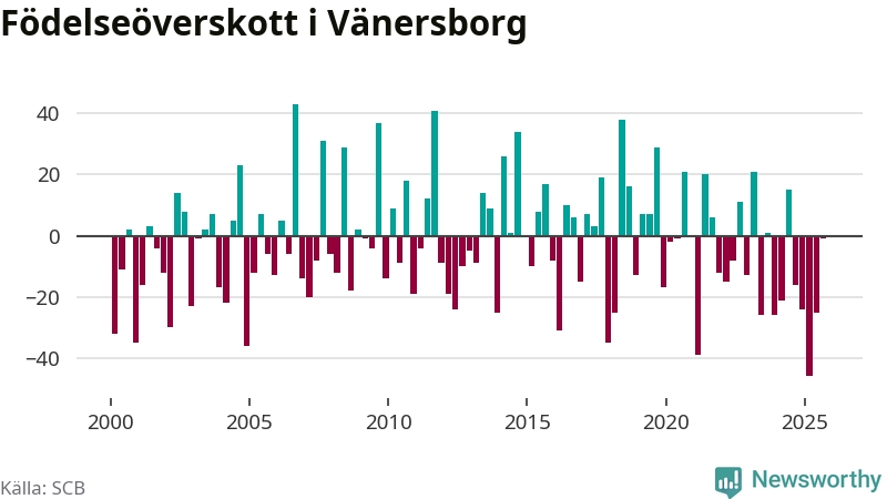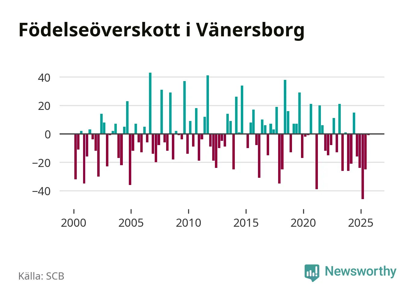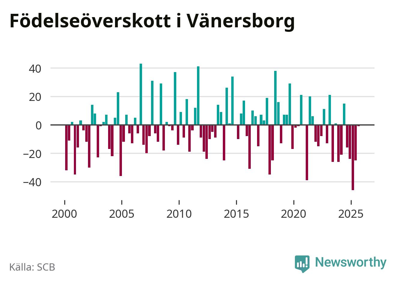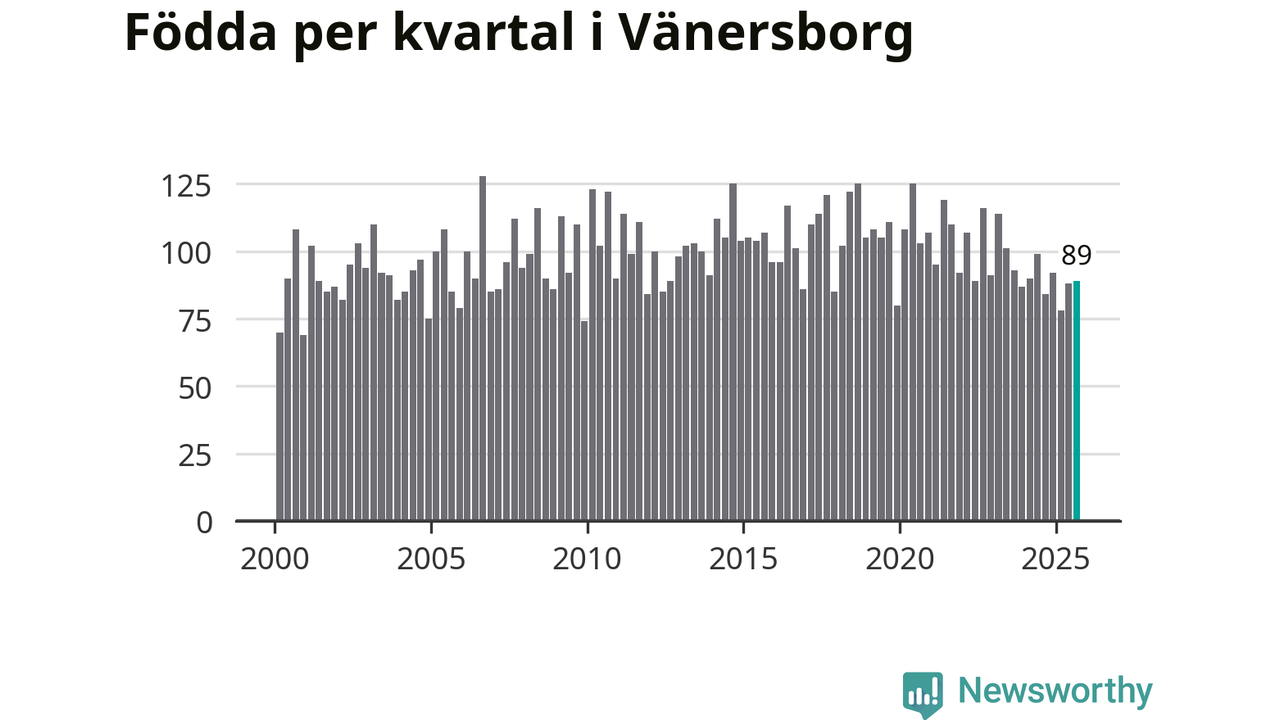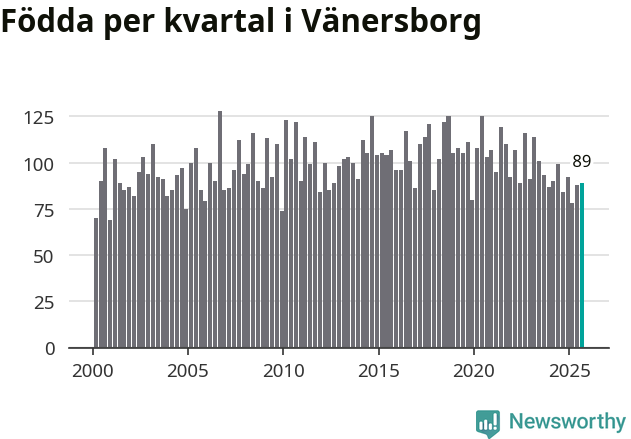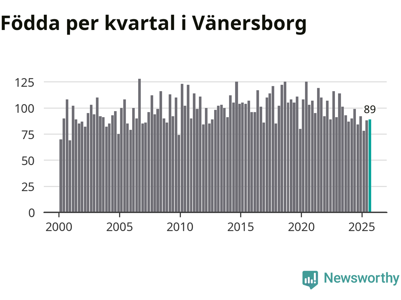 Enligt SCB:s siffror föddes 89 barn i Vänersborg under det senaste kvartalet. Samtidigt avled 90 personer. Skillnaden mellan antal födda och döda är så liten att det inte går att säga om det beror på något annat än SCB:s röjandeskydd. Kommunen har historiskt sett haft ungefär lika många kvartal med positivt födelsenetto som negativt.
