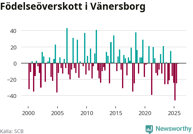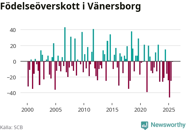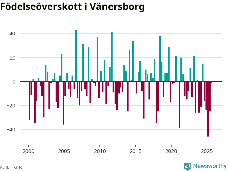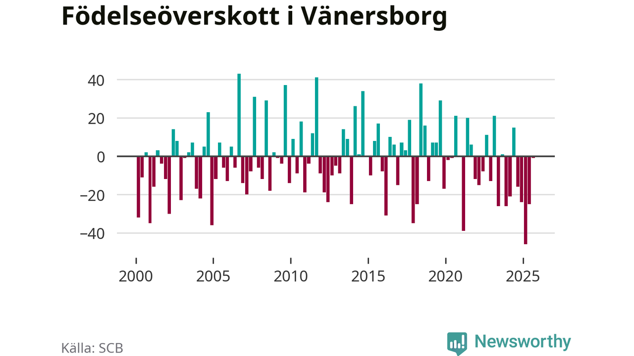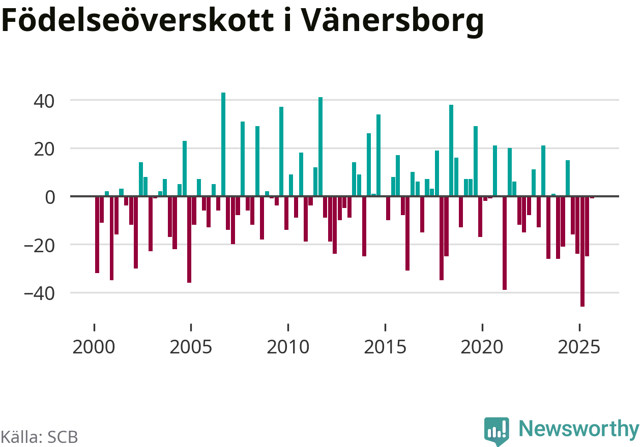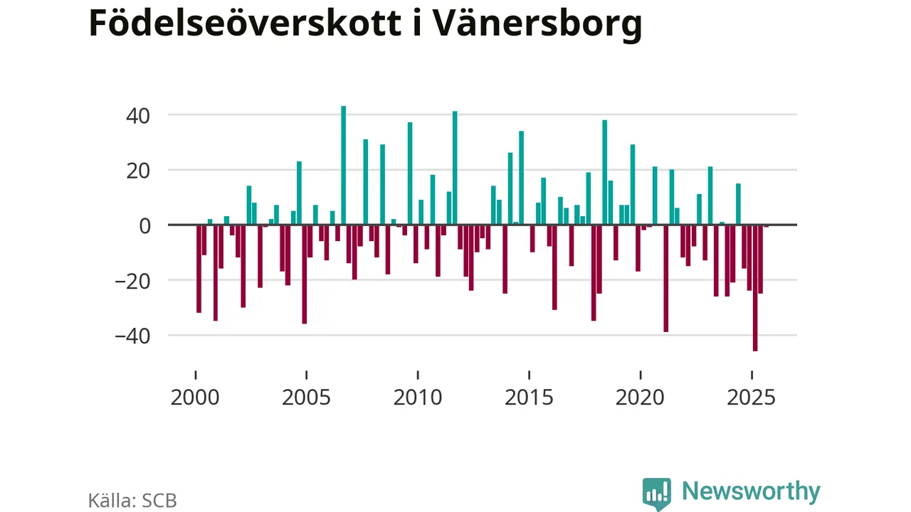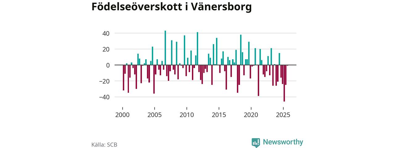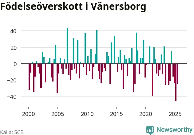 Enligt SCB:s siffror föddes 89 barn i Vänersborg under det senaste kvartalet. Samtidigt avled 90 personer. Skillnaden mellan antal födda och döda är så liten att det inte går att säga om det beror på något annat än SCB:s röjandeskydd. Kommunen har historiskt sett haft ungefär lika många kvartal med positivt födelsenetto som negativt.