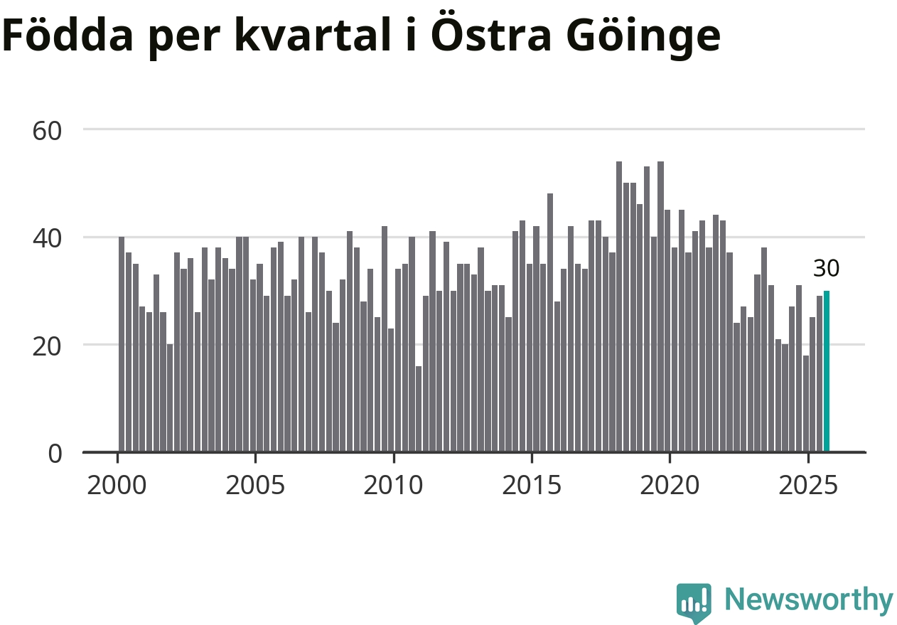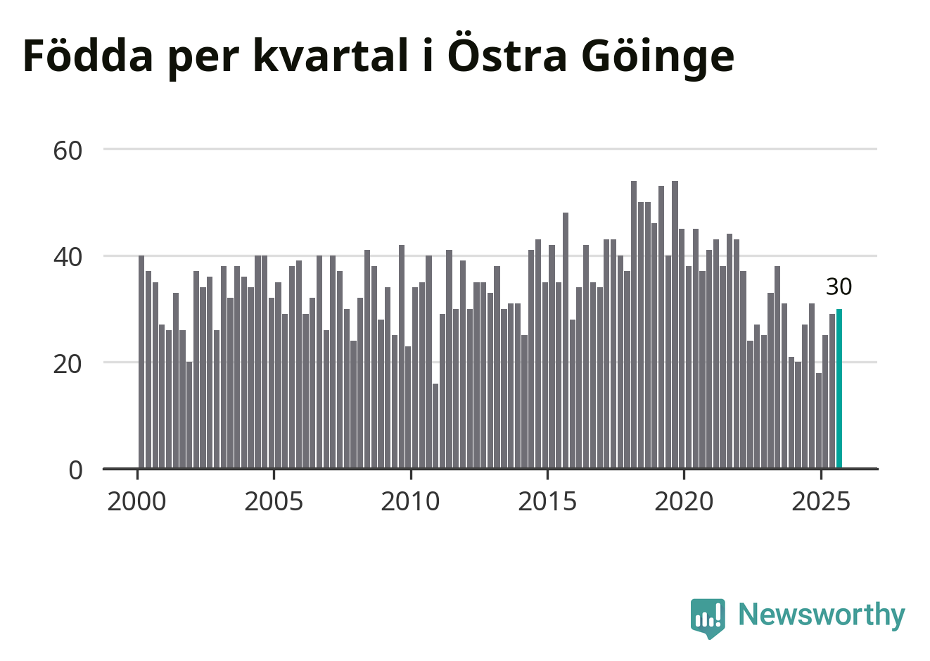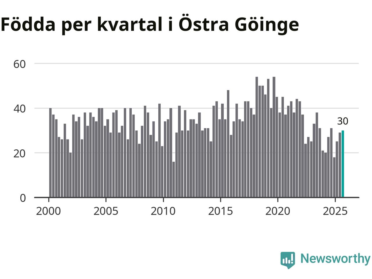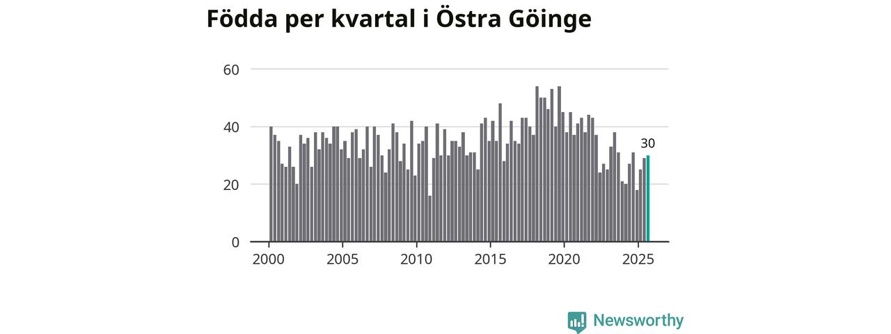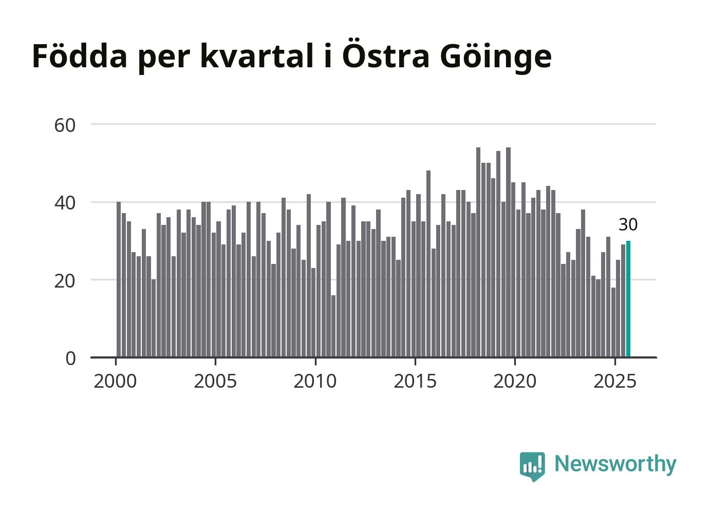 Enligt SCB:s siffror föddes 30 barn i Östra Göinge under det senaste kvartalet. Samtidigt avled 38 personer. Skillnaden mellan antal födda och döda är så liten att det inte går att säga om det beror på något annat än SCB:s röjandeskydd. Kommunen har historiskt sett haft ungefär lika många kvartal med positivt födelsenetto som negativt.