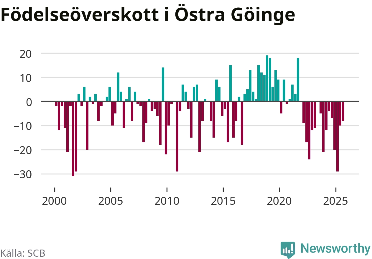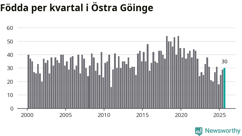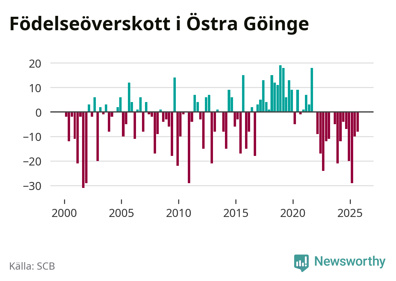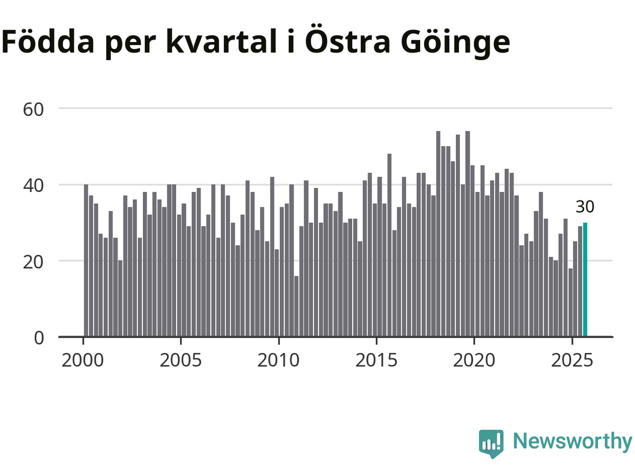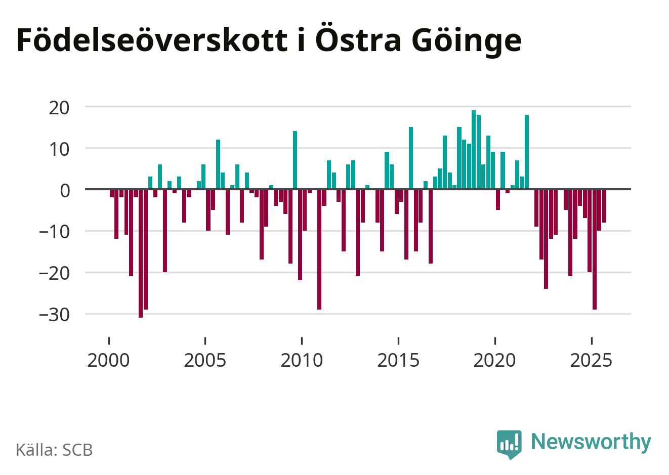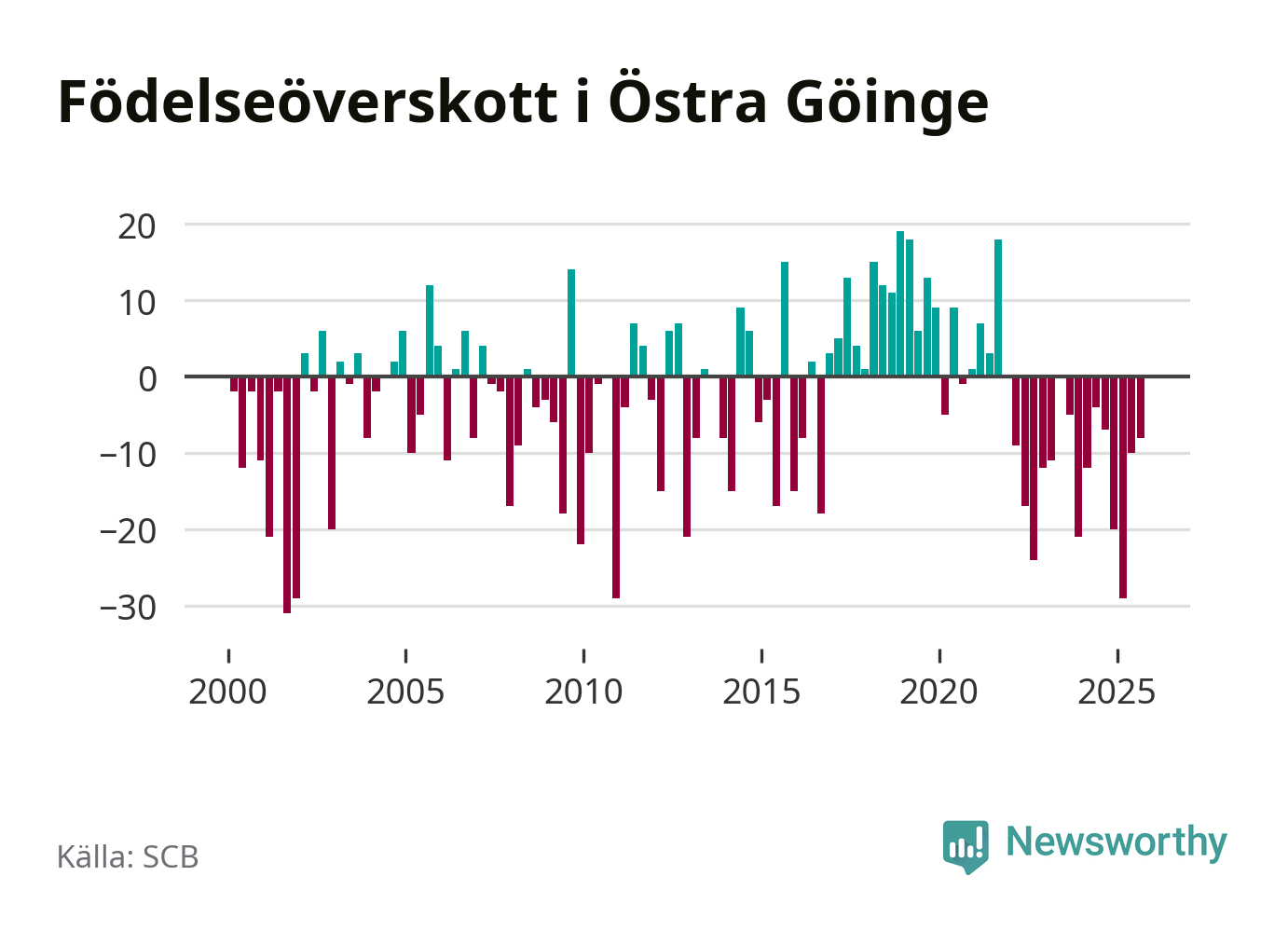 Enligt SCB:s siffror föddes 30 barn i Östra Göinge under det senaste kvartalet. Samtidigt avled 38 personer. Skillnaden mellan antal födda och döda är så liten att det inte går att säga om det beror på något annat än SCB:s röjandeskydd. Kommunen har historiskt sett haft ungefär lika många kvartal med positivt födelsenetto som negativt.