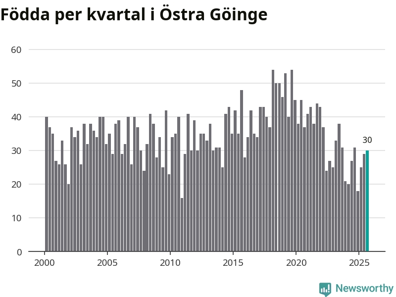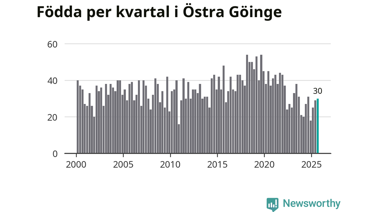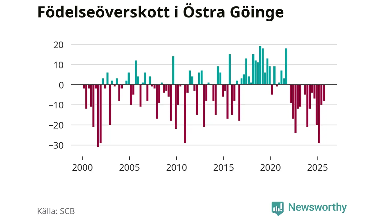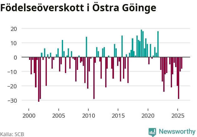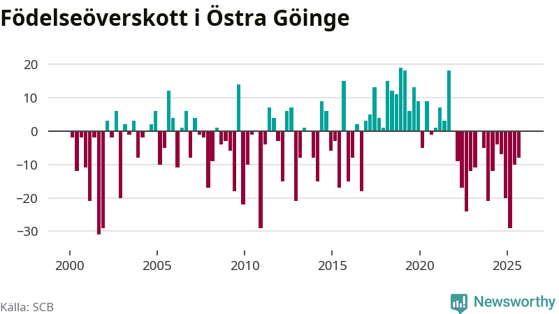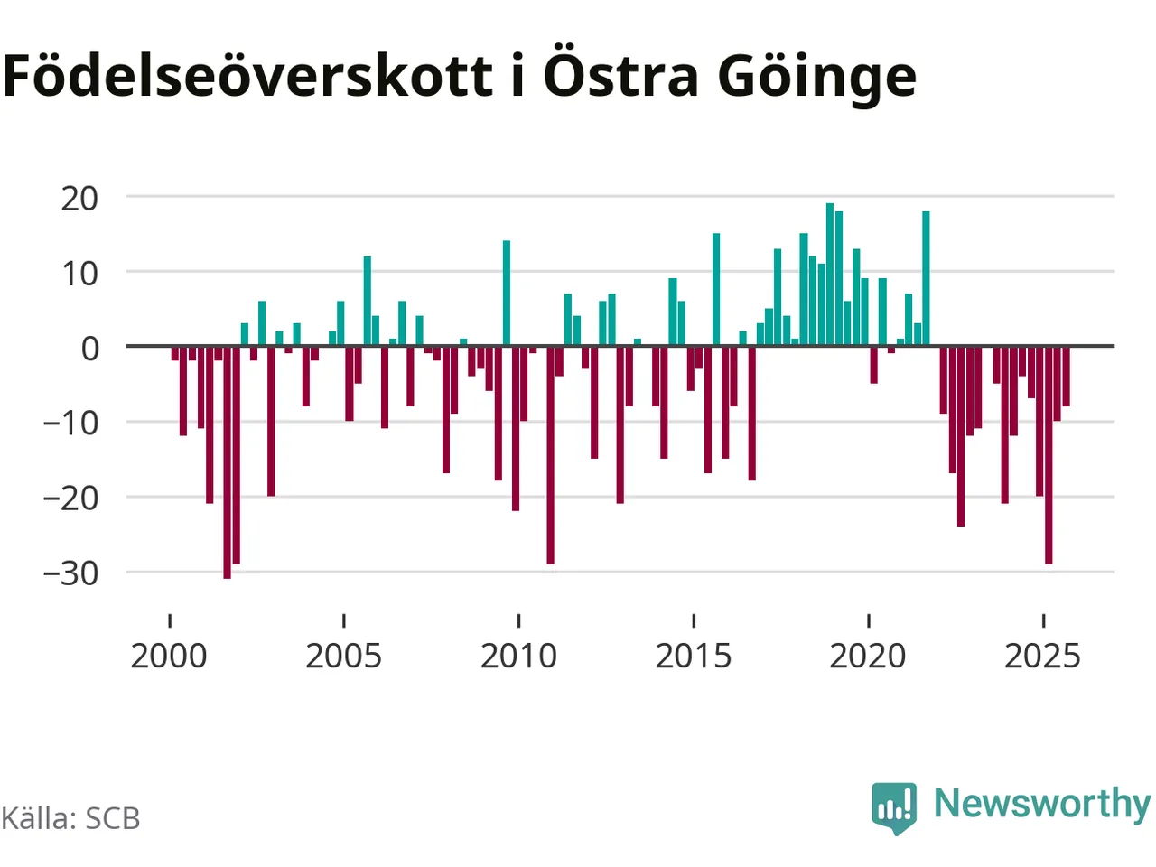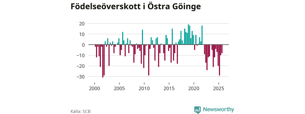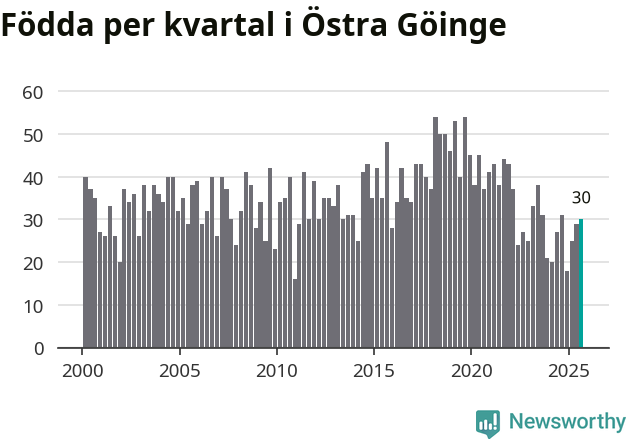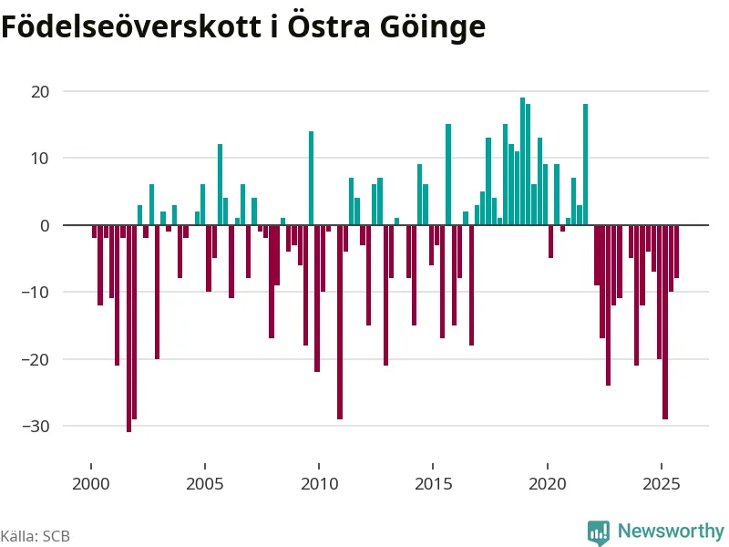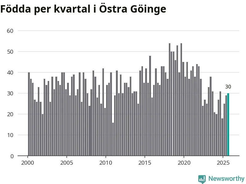 Enligt SCB:s siffror föddes 30 barn i Östra Göinge under det senaste kvartalet. Samtidigt avled 38 personer. Skillnaden mellan antal födda och döda är så liten att det inte går att säga om det beror på något annat än SCB:s röjandeskydd. Kommunen har historiskt sett haft ungefär lika många kvartal med positivt födelsenetto som negativt.