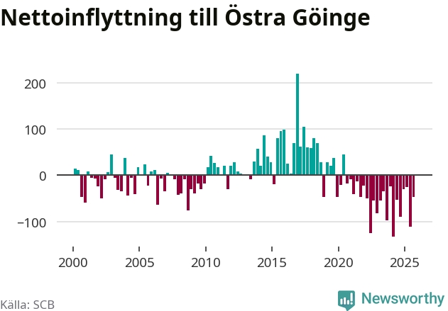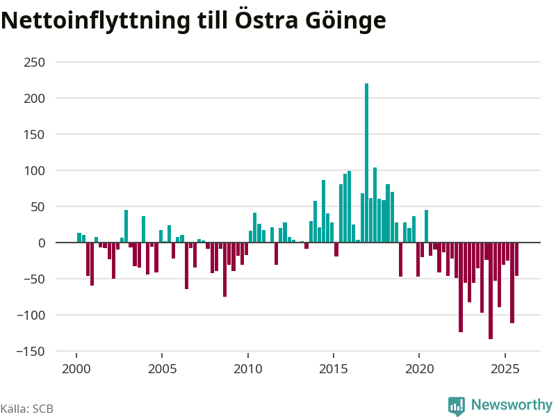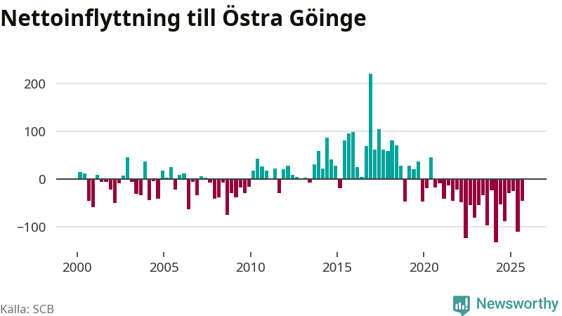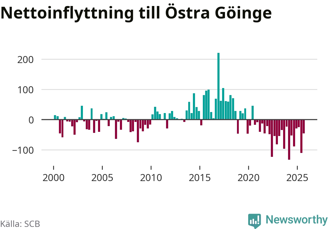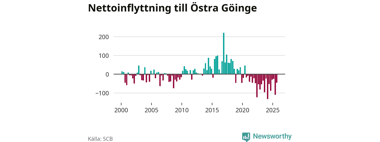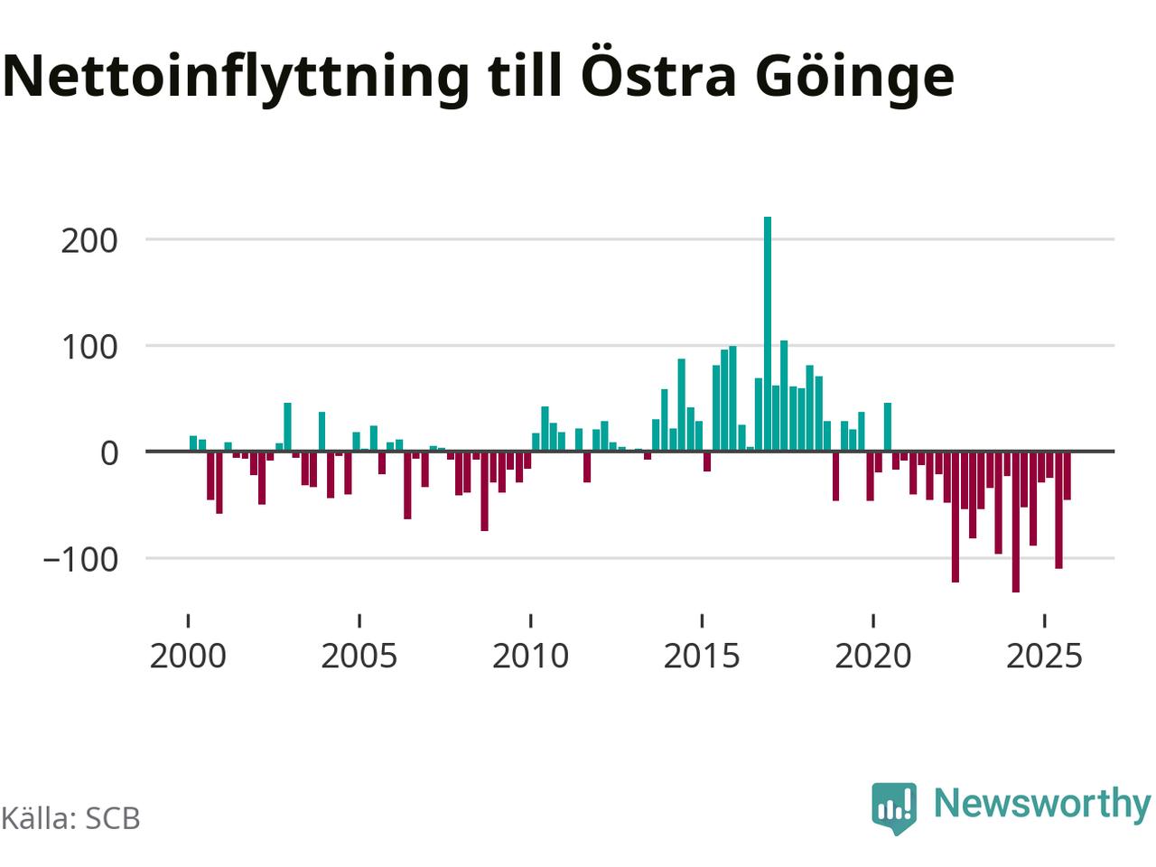 Under tredje kvartalet 2025 flyttade 227 personer till kommunen medan 273 personer flyttade därifrån. Sedan seklets början har Östra Göinge oftast haft ett negativt flyttnetto.