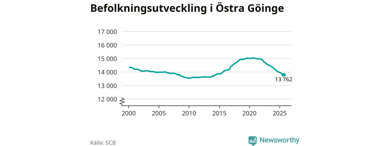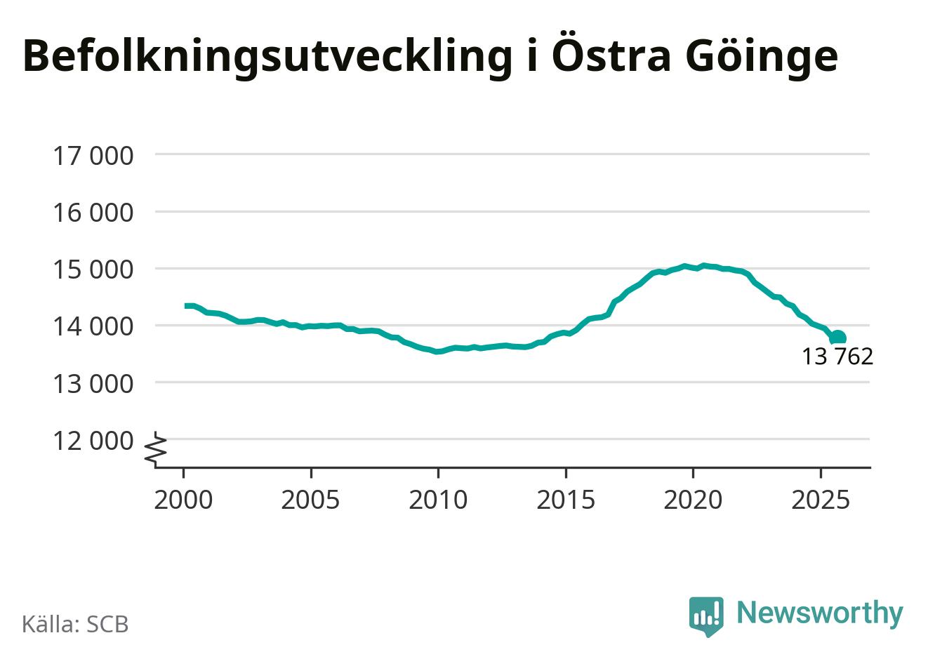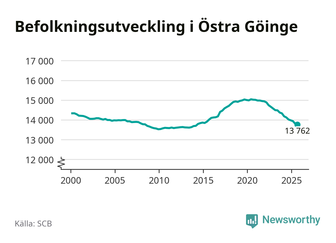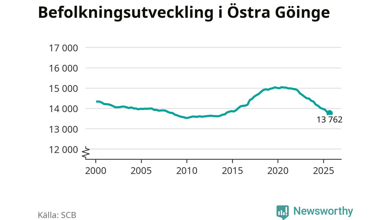 Befolkningen minskade i Östra Göinge kommun under det tredje kvartalet 2025. Den 30 september bodde enligt SCB:s senaste siffror 13 762 personer i kommunen, vilket är 48 färre än i slutet av andra kvartalet. Minskningen är procentuellt sett en av de största i Skåne.