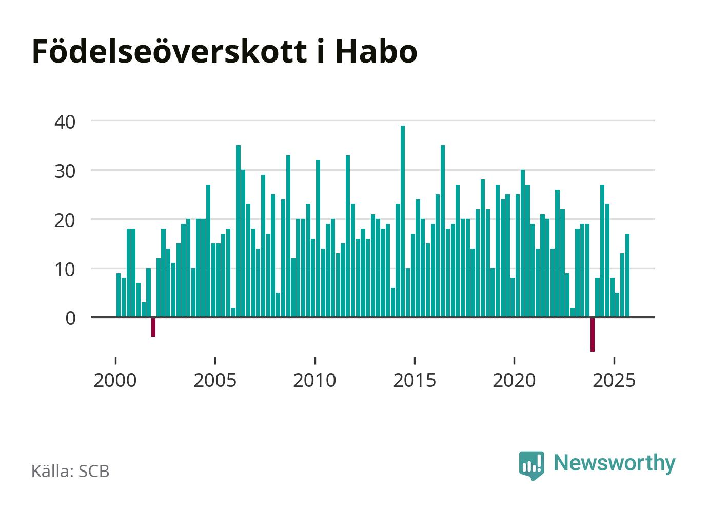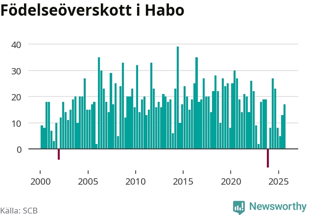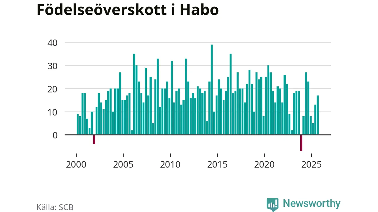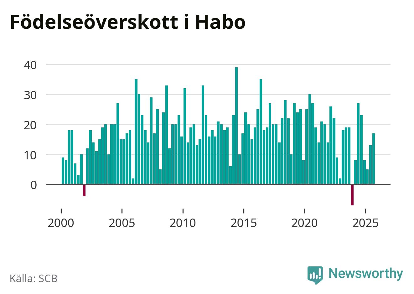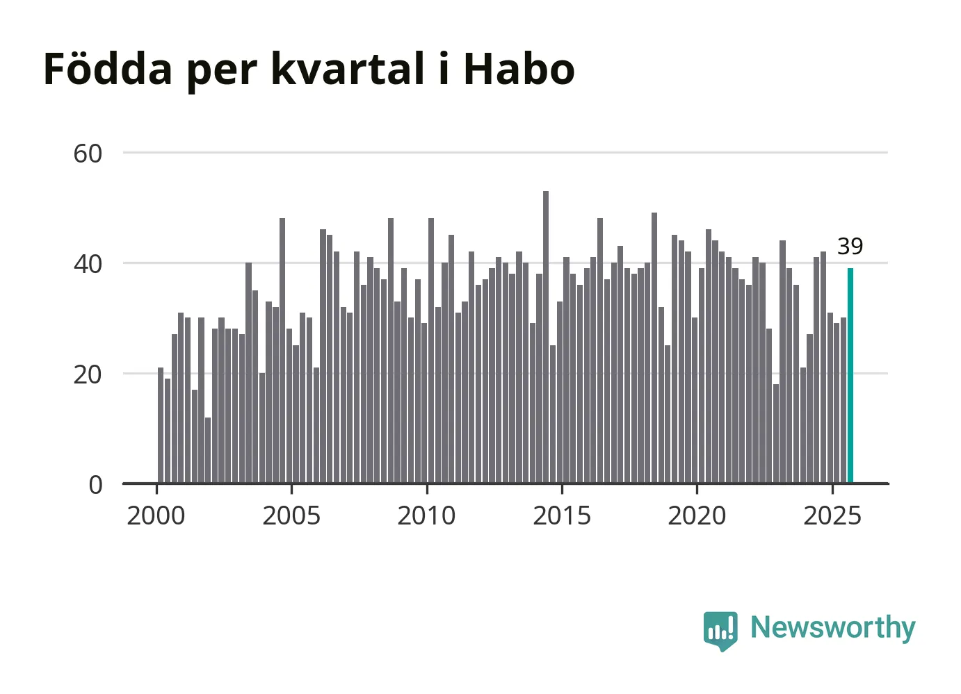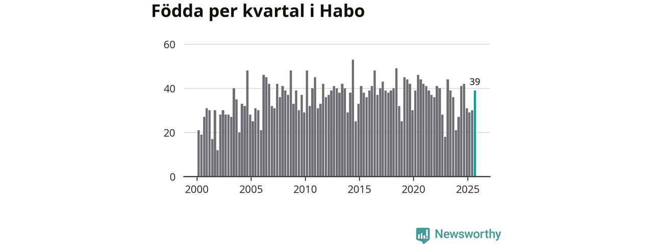 Enligt SCB:s siffror föddes 39 barn i Habo under det senaste kvartalet. Samtidigt avled 22 personer. Habo hade alltså ett positivt födelsenetto, vilket kommunen historiskt sett nästan alltid har haft.