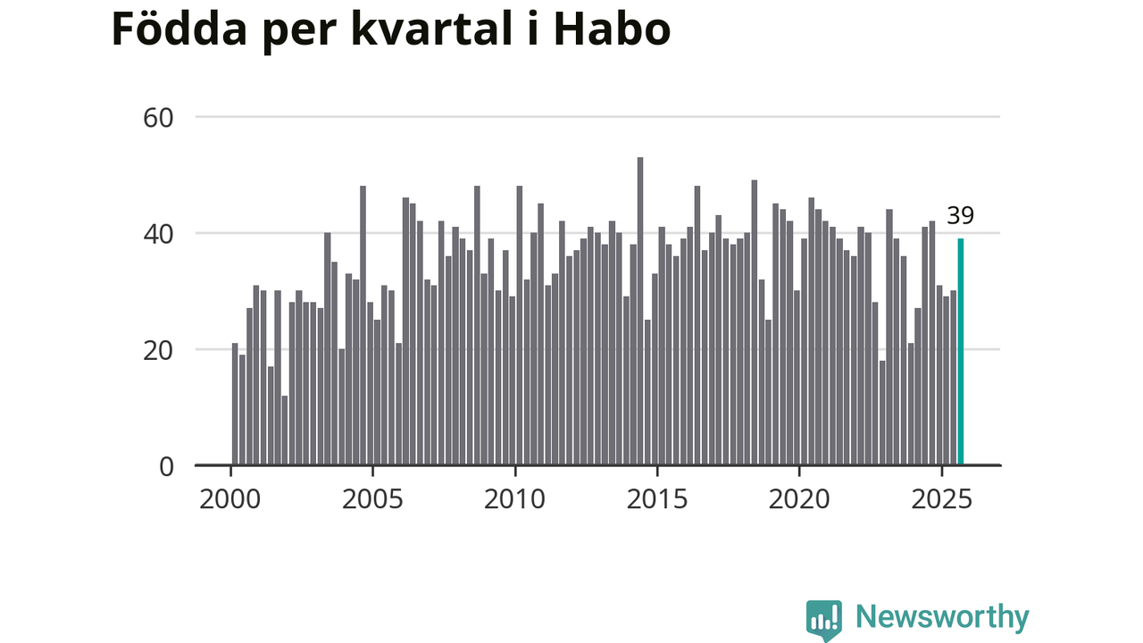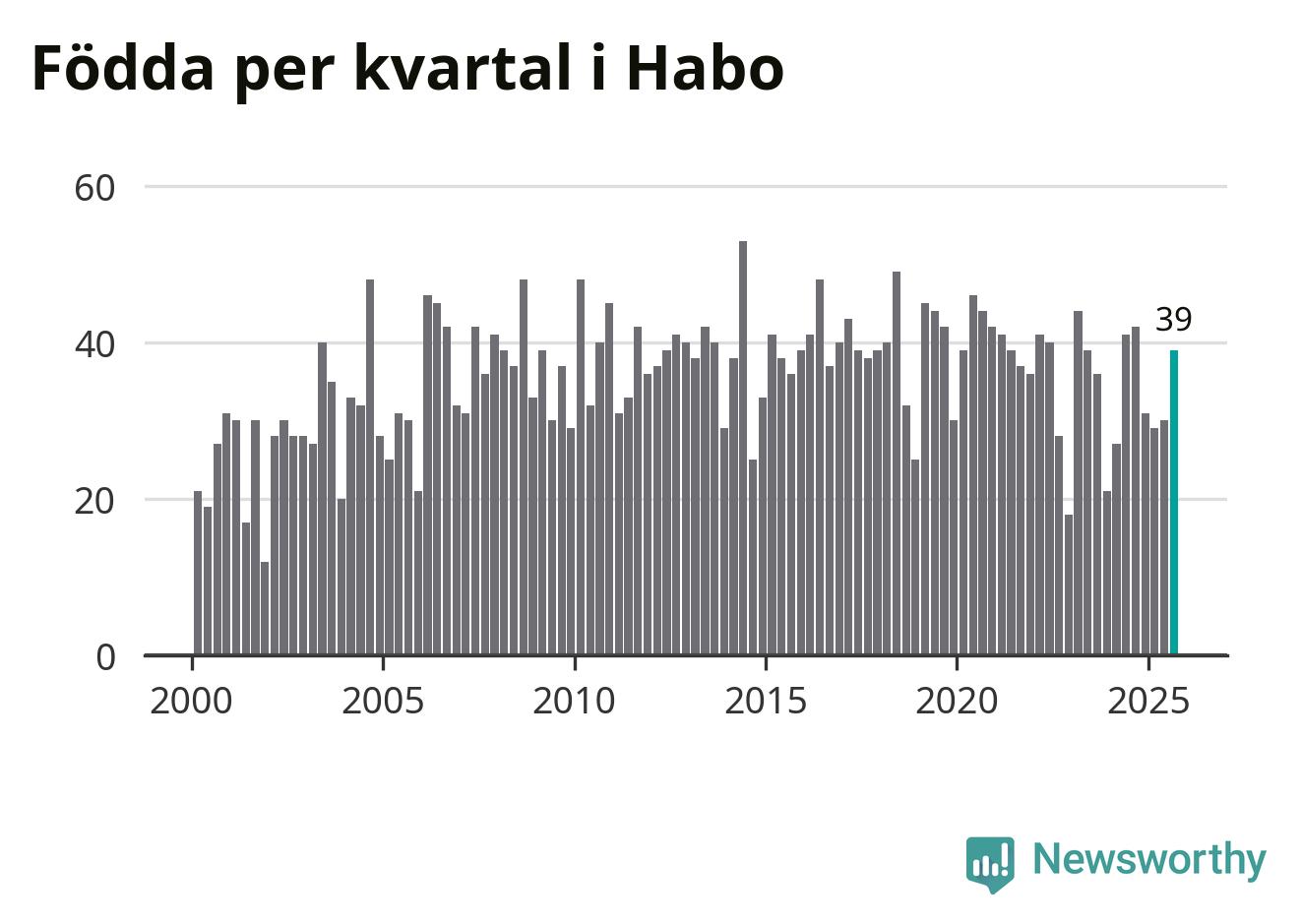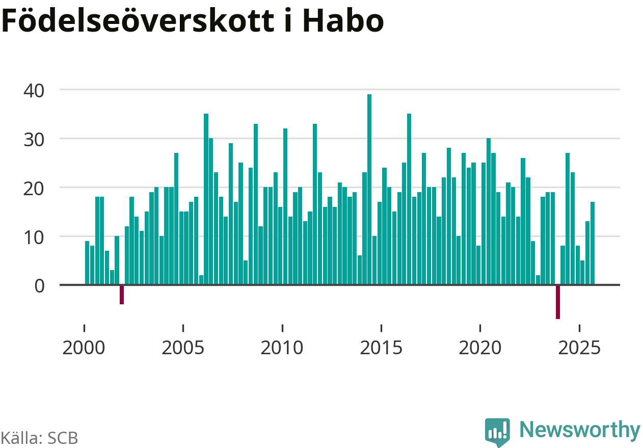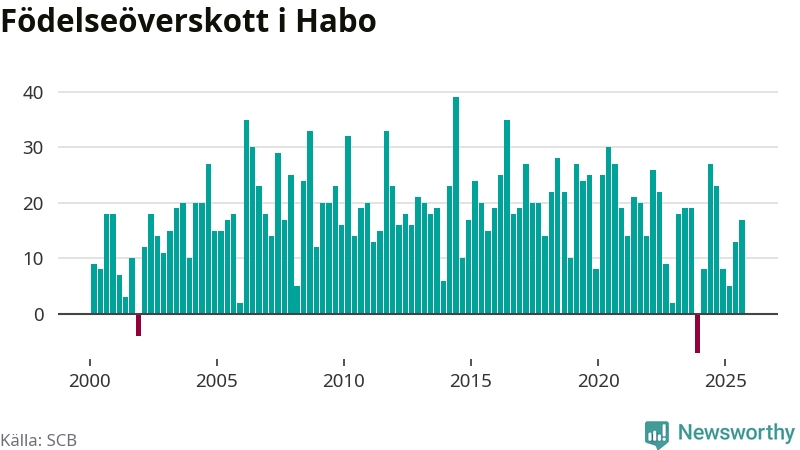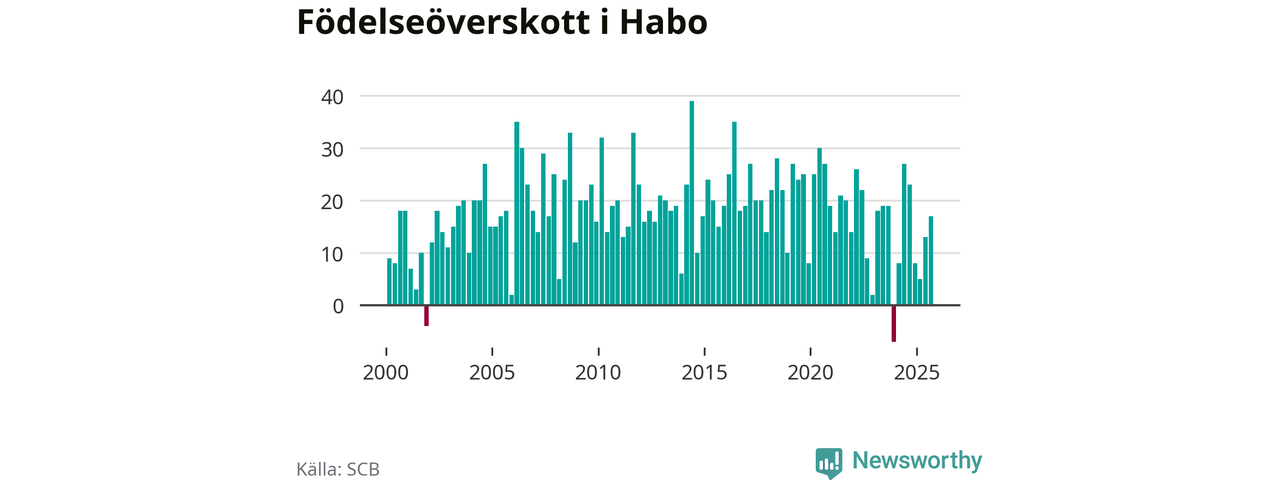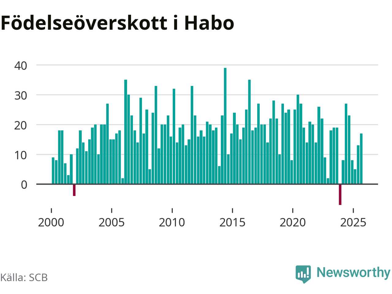 Enligt SCB:s siffror föddes 39 barn i Habo under det senaste kvartalet. Samtidigt avled 22 personer. Habo hade alltså ett positivt födelsenetto, vilket kommunen historiskt sett nästan alltid har haft.