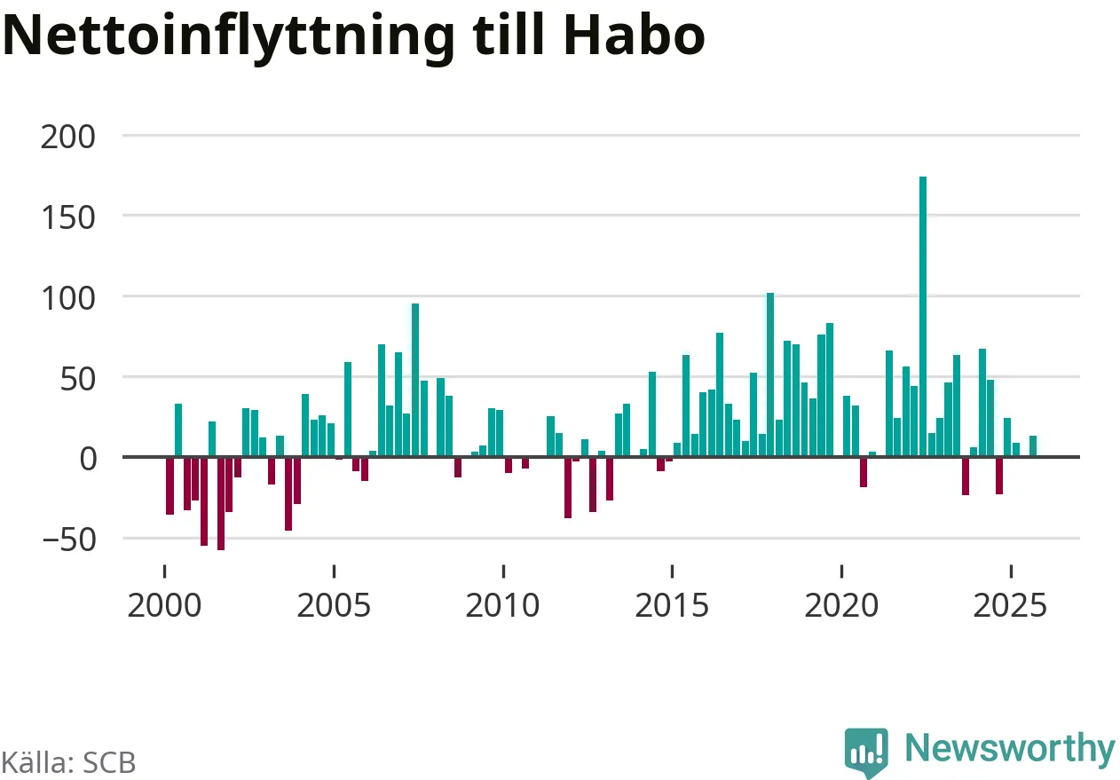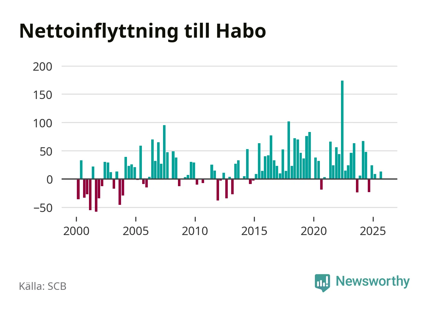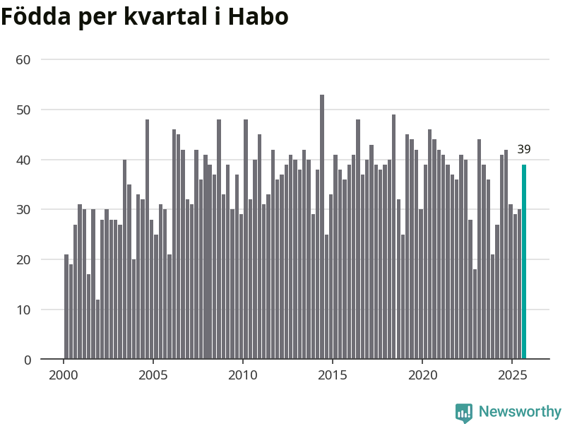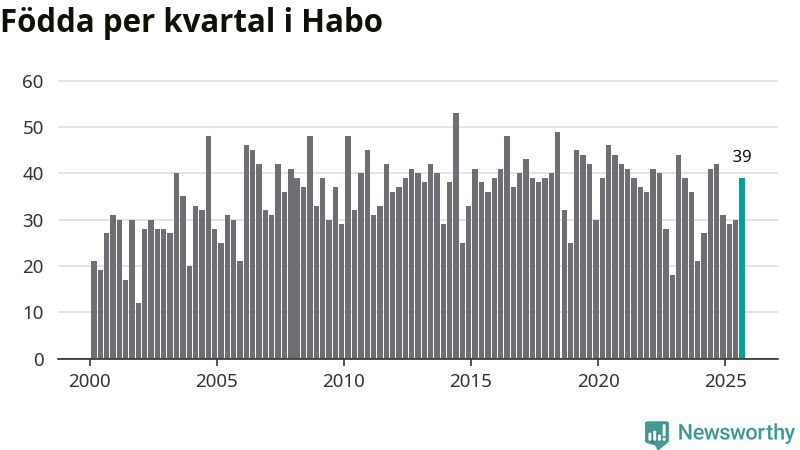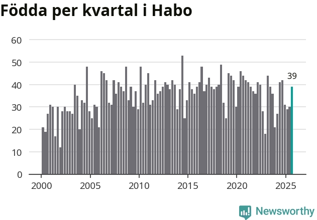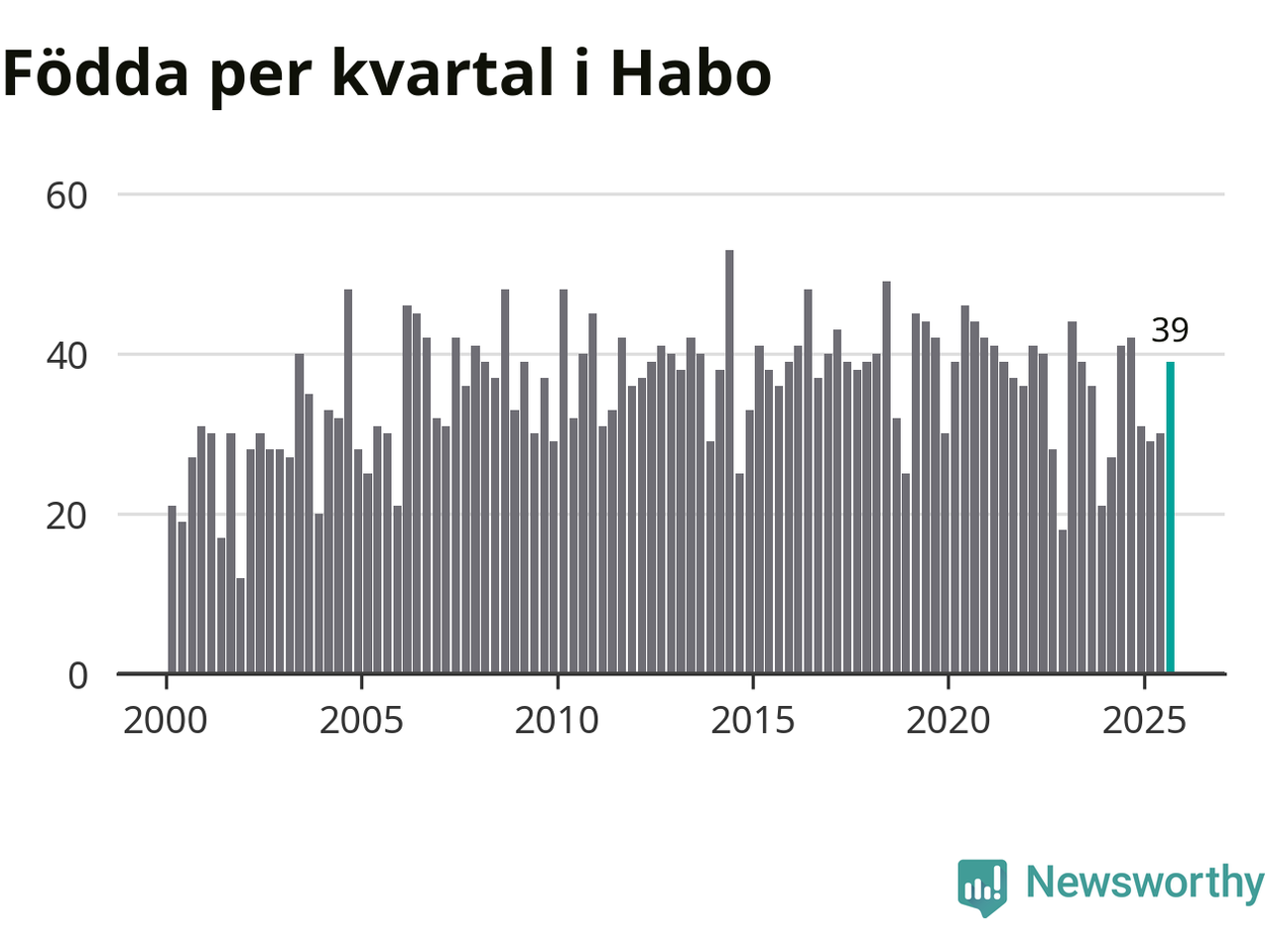 Enligt SCB:s siffror föddes 39 barn i Habo under det senaste kvartalet. Samtidigt avled 22 personer. Habo hade alltså ett positivt födelsenetto, vilket kommunen historiskt sett nästan alltid har haft.